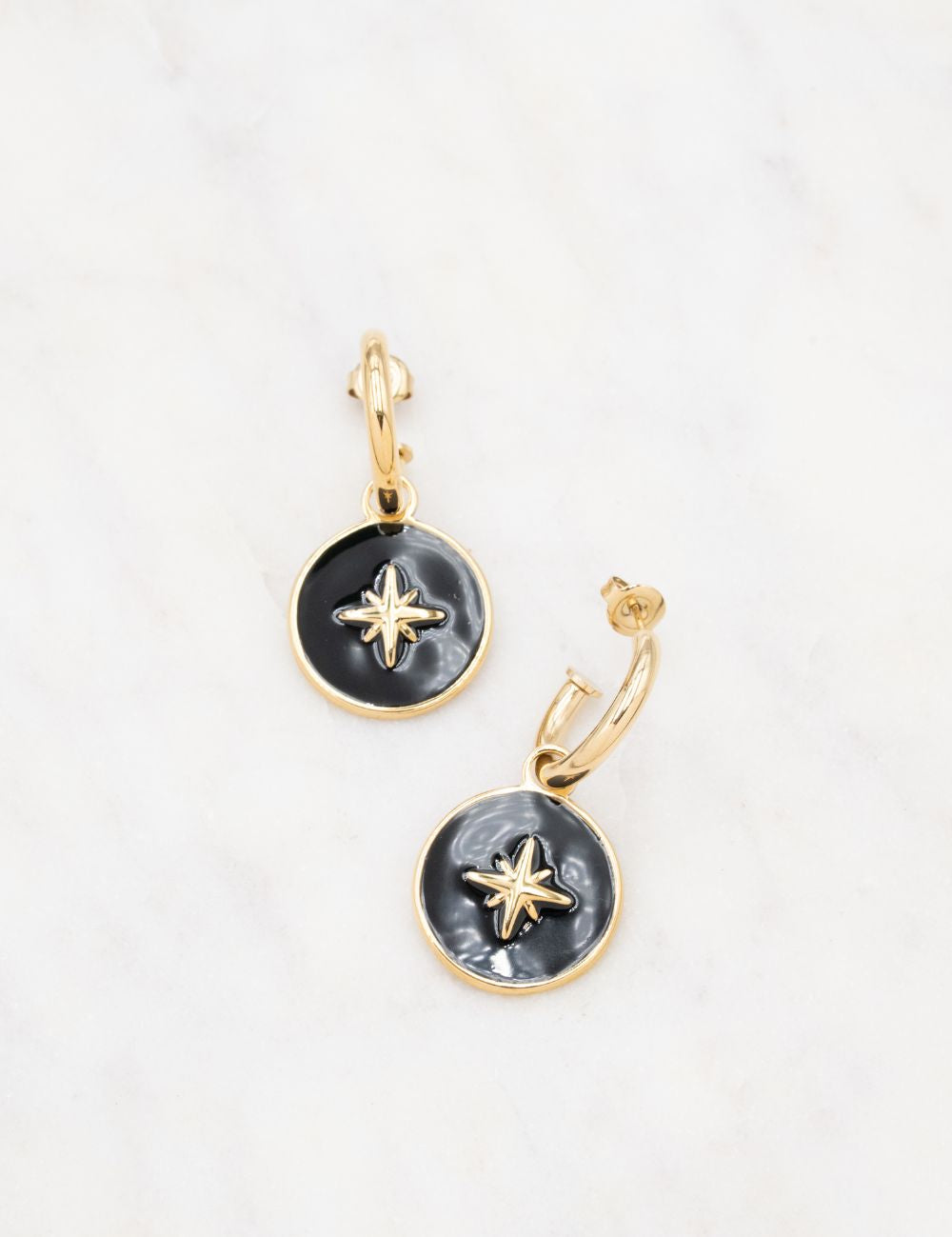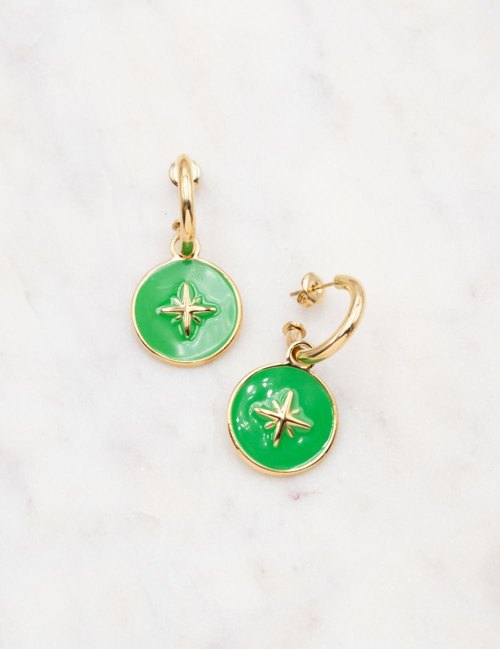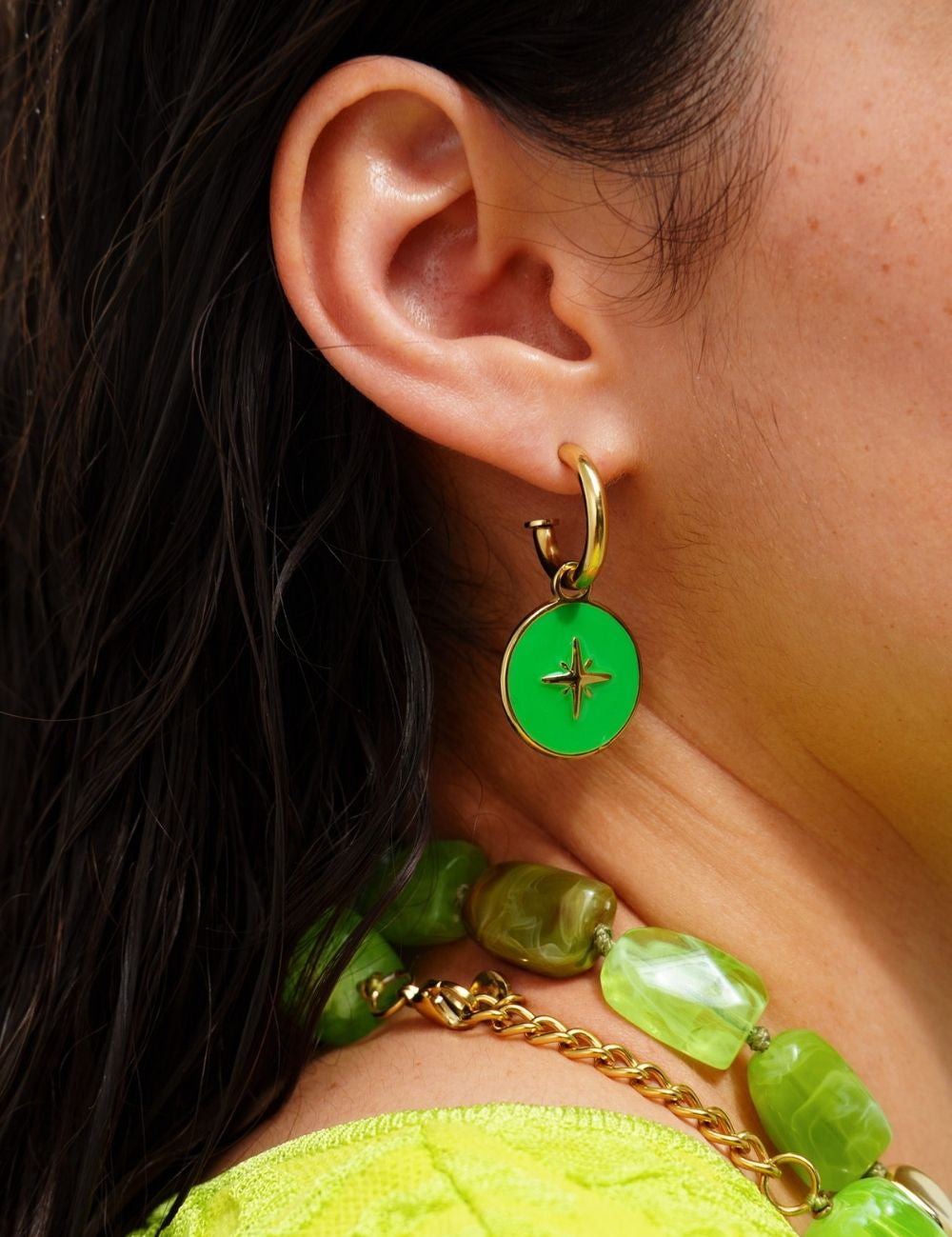 Boucles d'oreilles graphiques type créoles à puce composées d'un pendentif rond émaillé coloré serti d'une étoile.