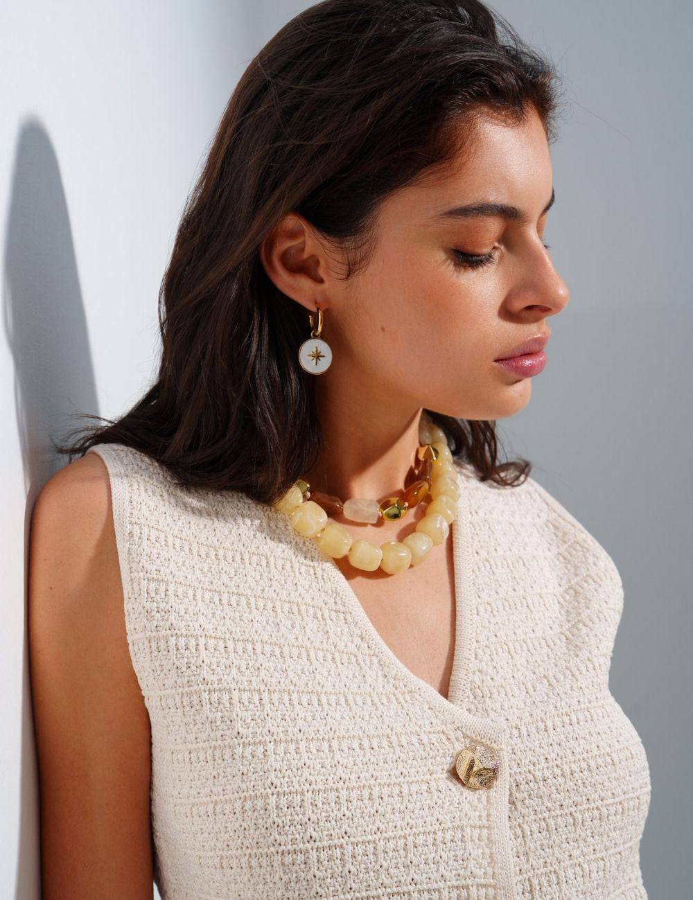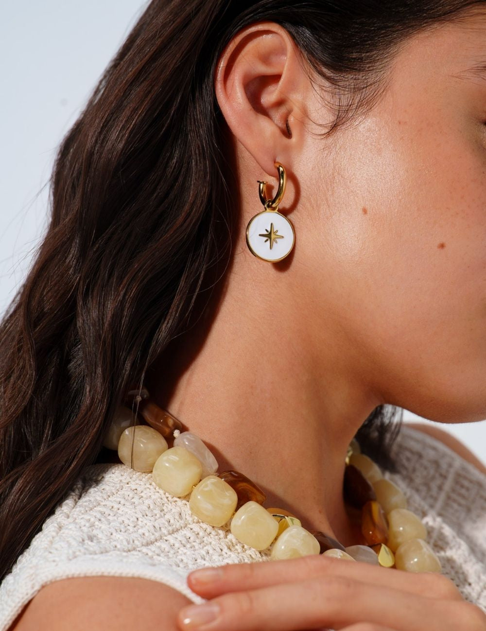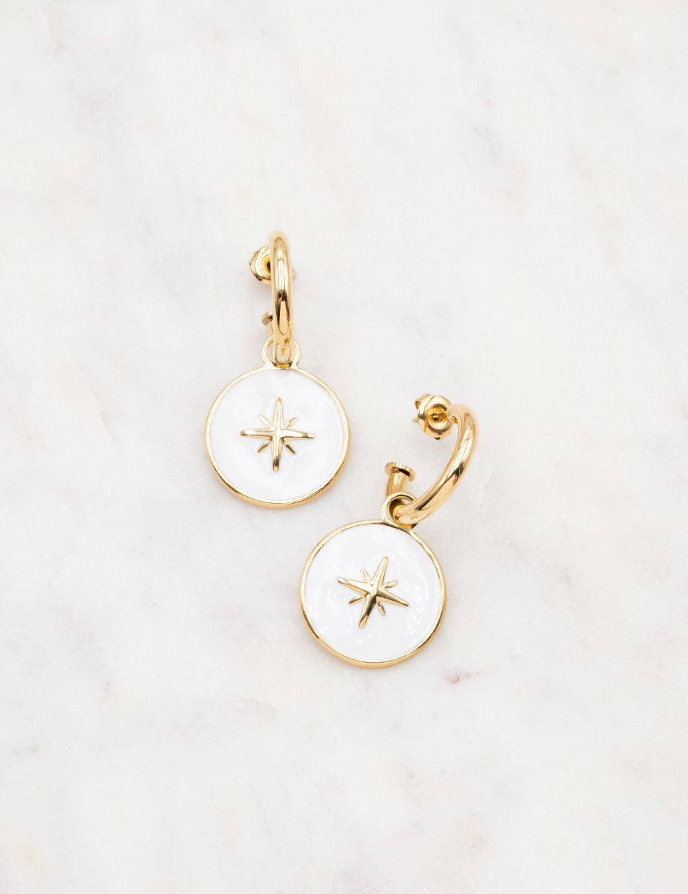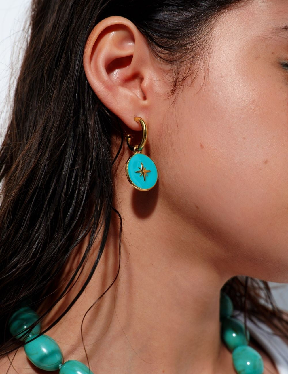 Boucles d'oreilles graphiques type créoles à puce composées d'un pendentif rond émaillé coloré serti d'une étoile.