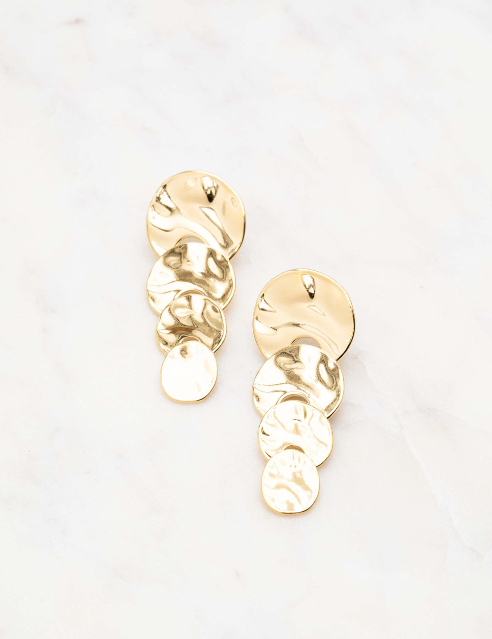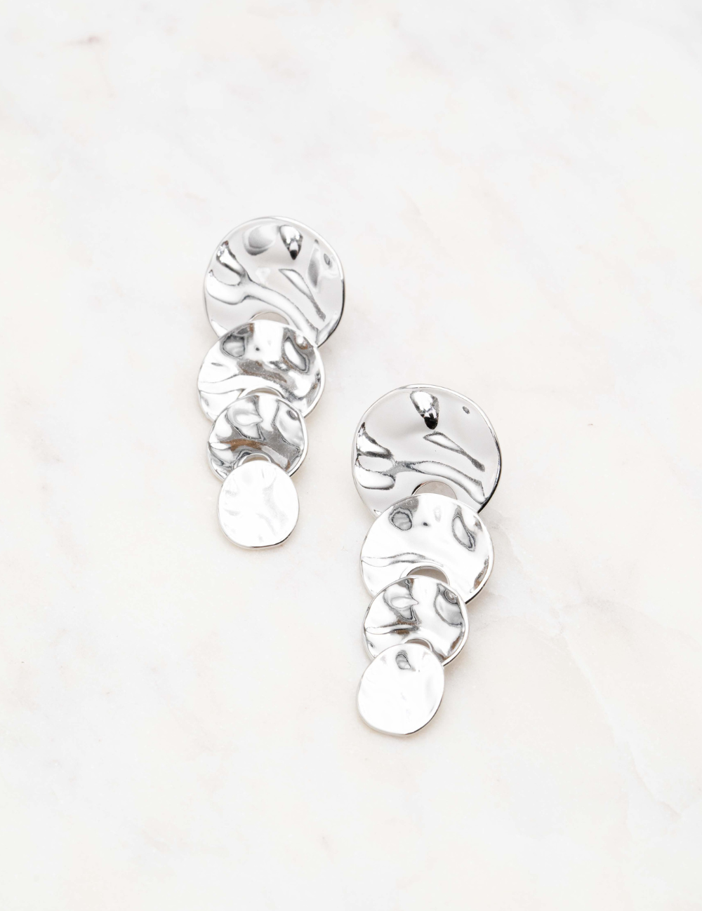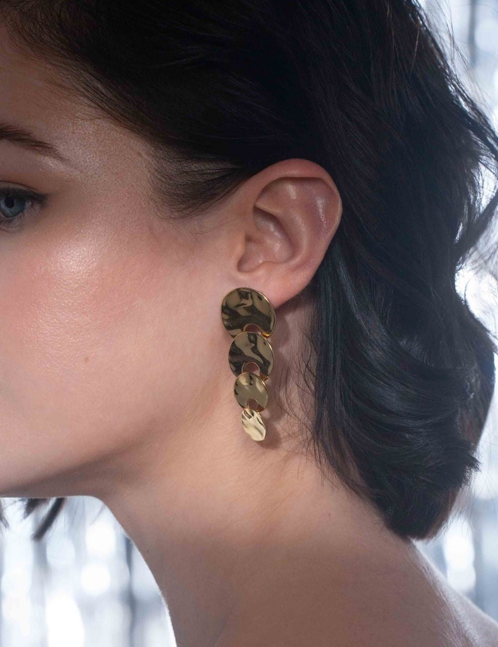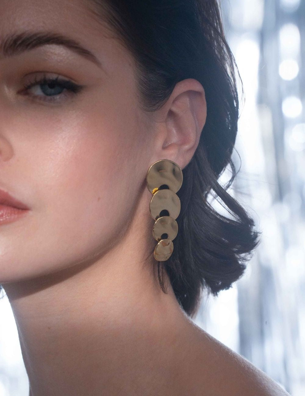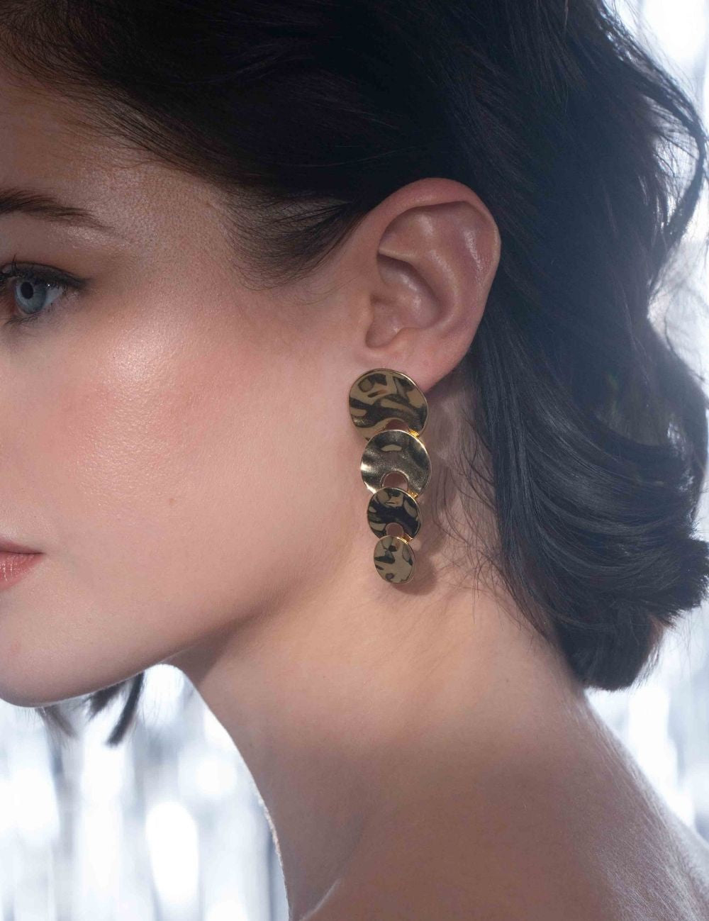 Boucles d'oreilles graphiques à puce pendantes composées de quatre pièces rondes texturées.