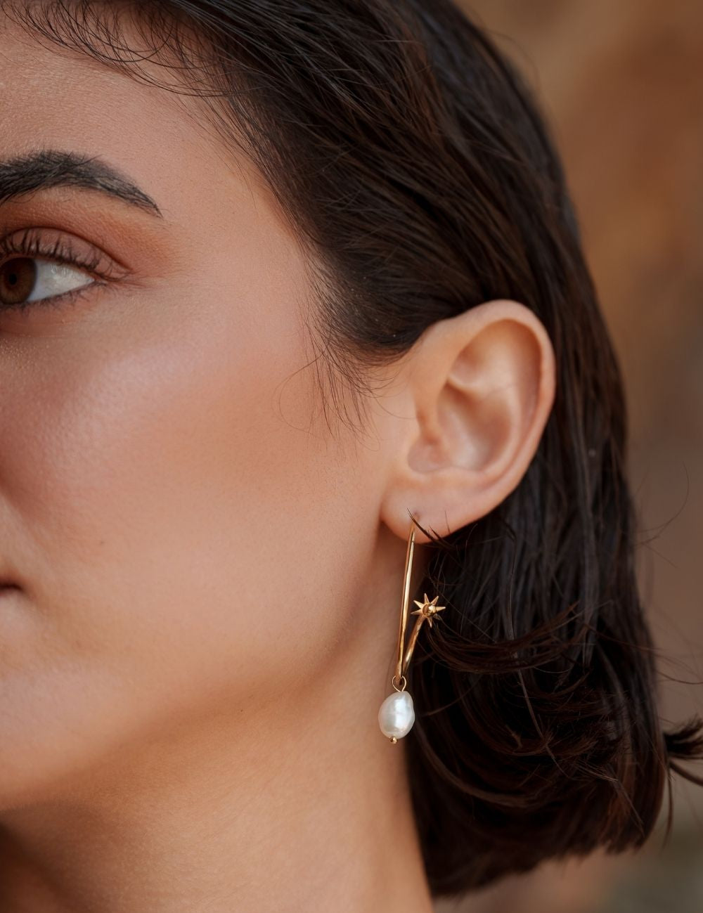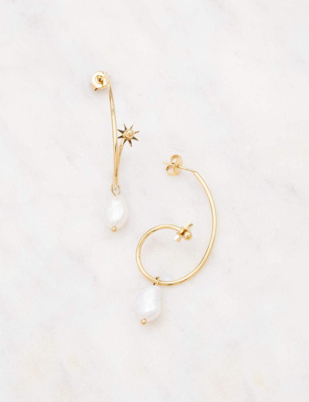 Boucles d'oreilles graphiques type créoles à puce composées d'une étoile, d'une petite boule et d'une perle d'eau douce.