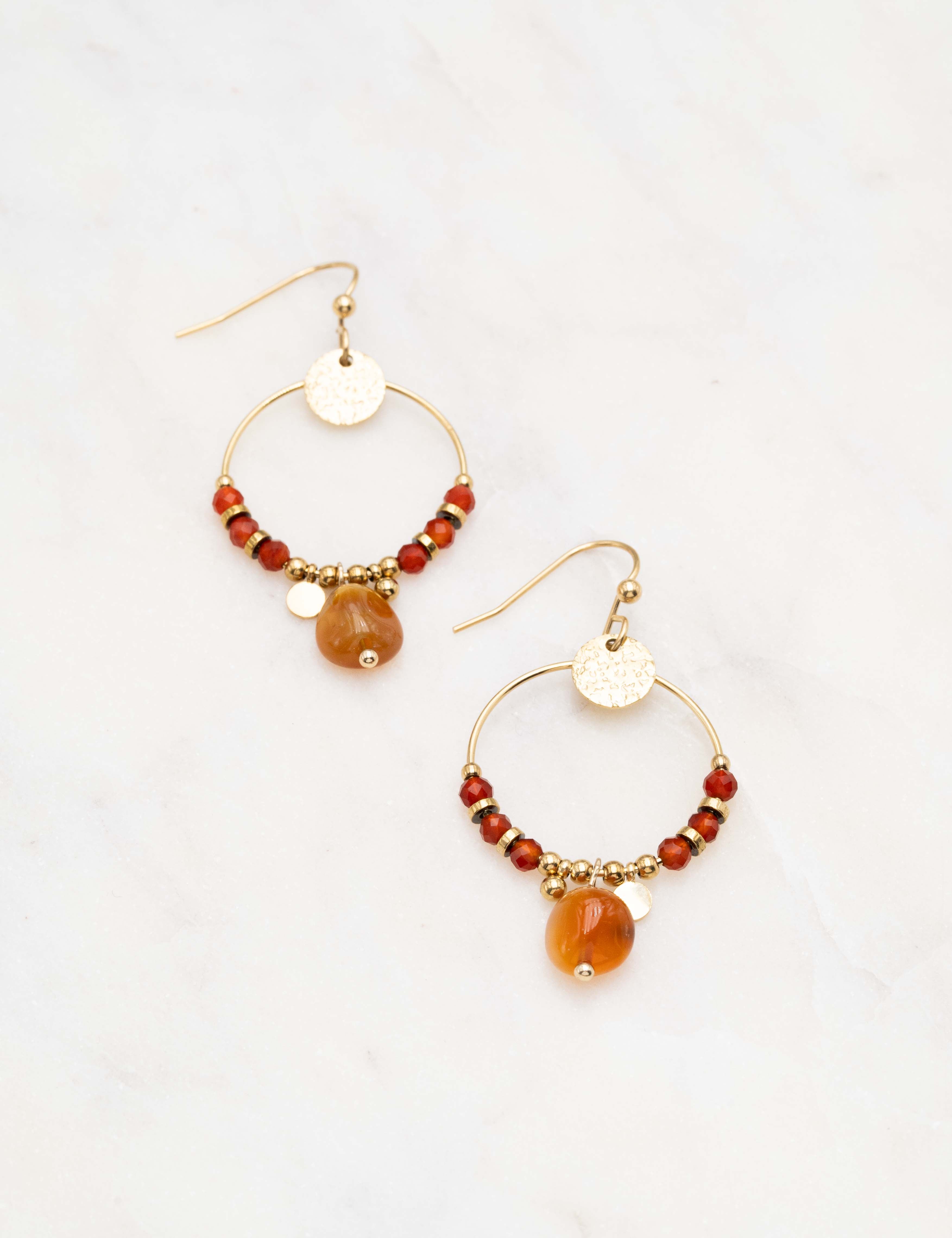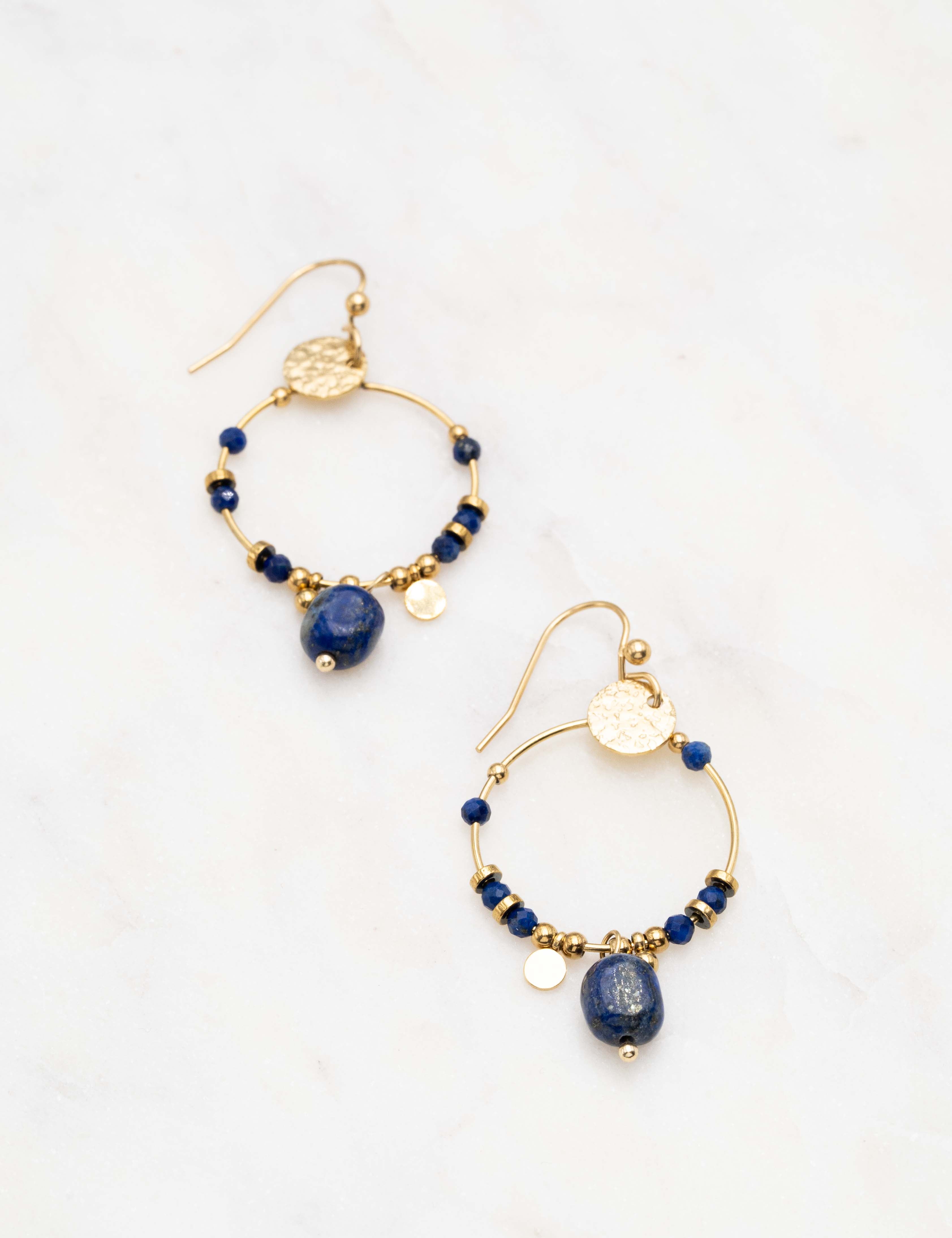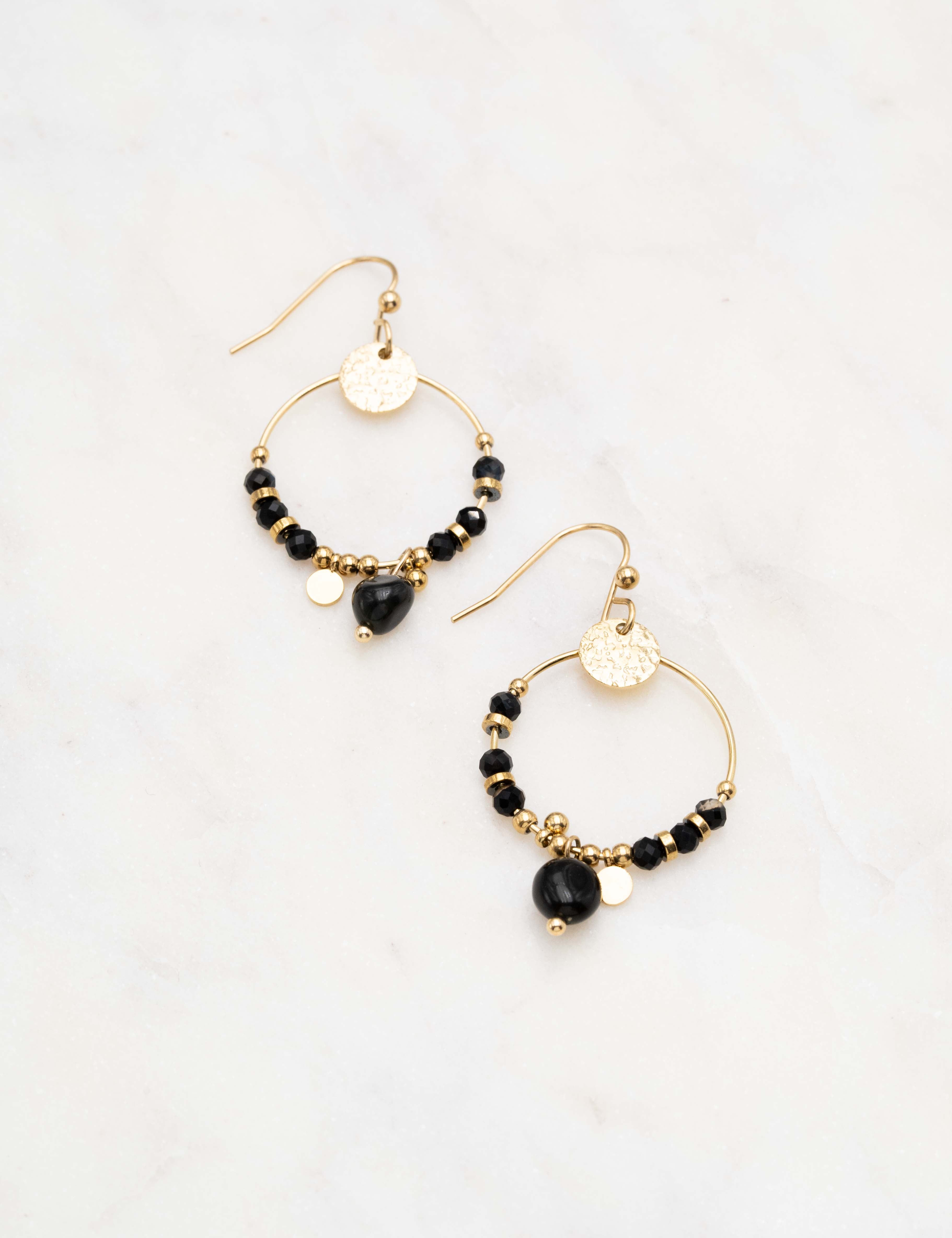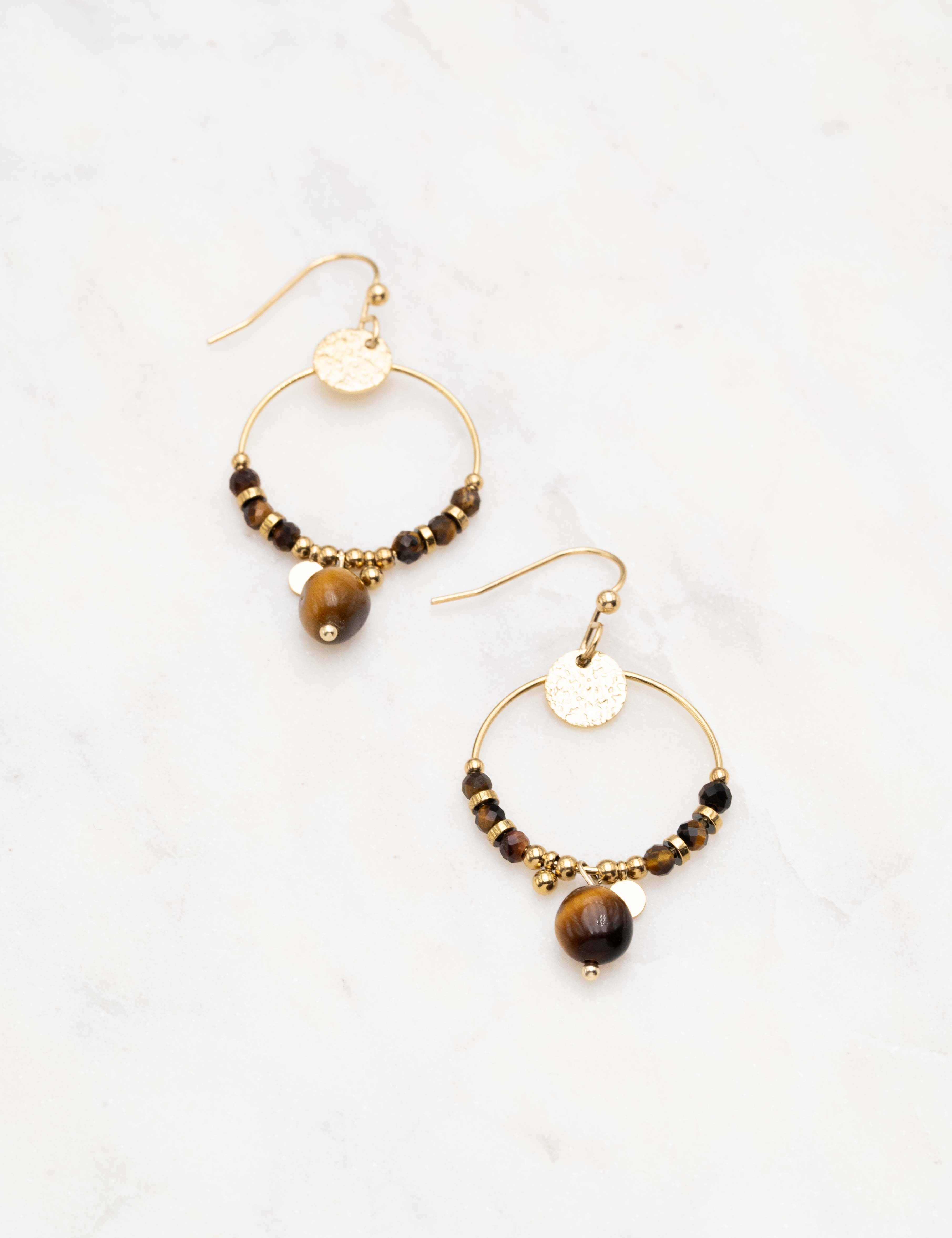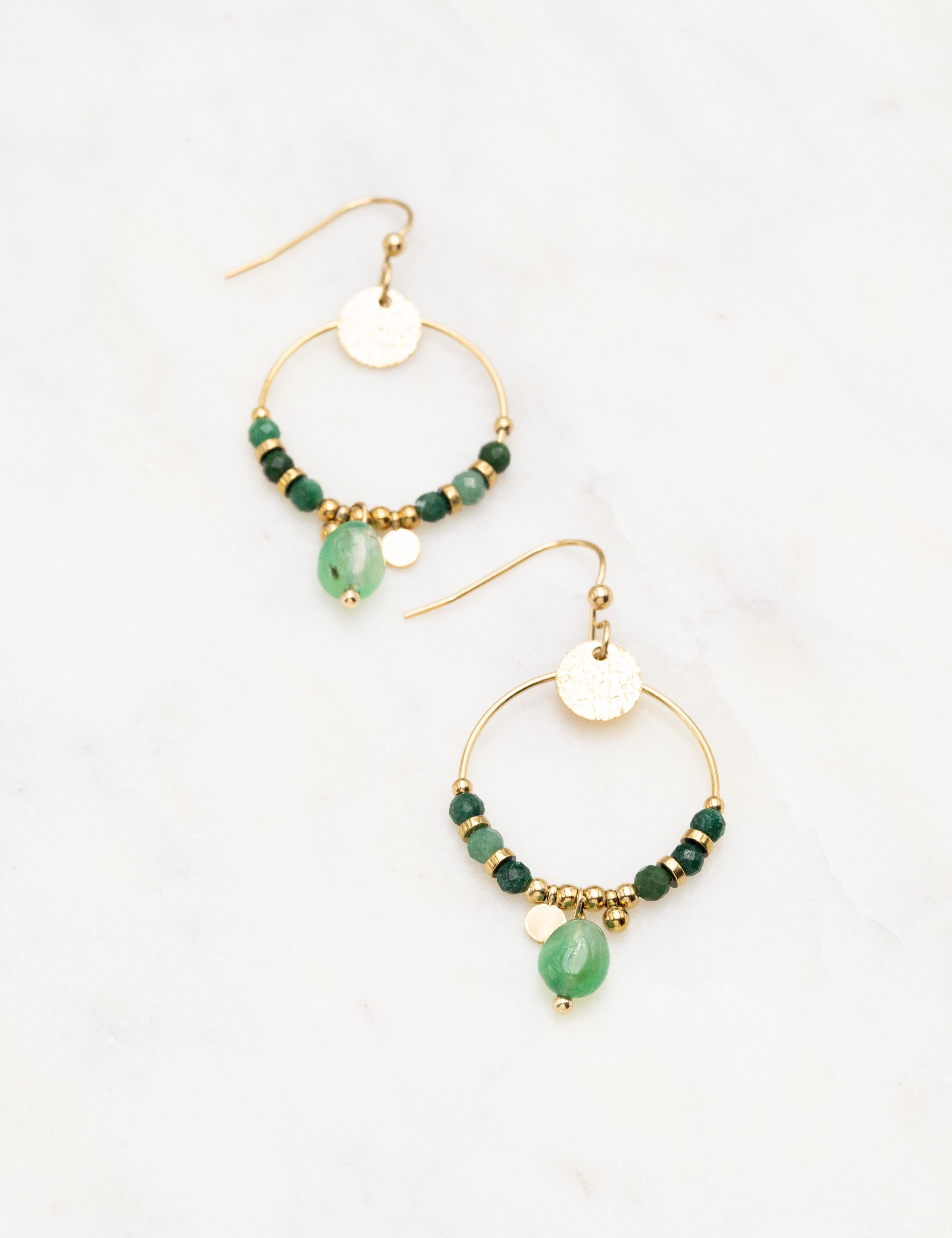 Boucles d'oreilles à crochet composées d'une pièce ronde martelée et un joli enfilage de perles en pierres naturelles.