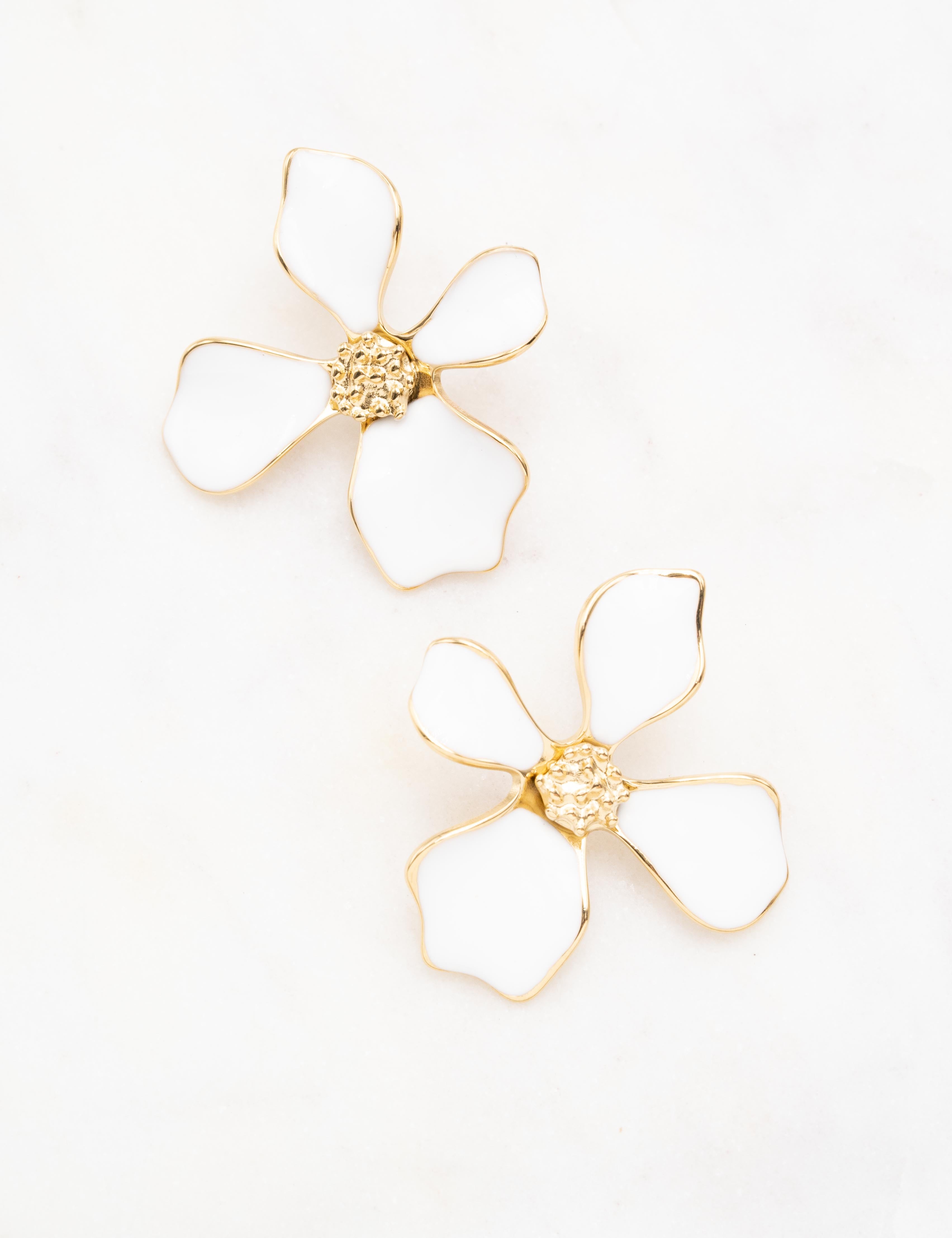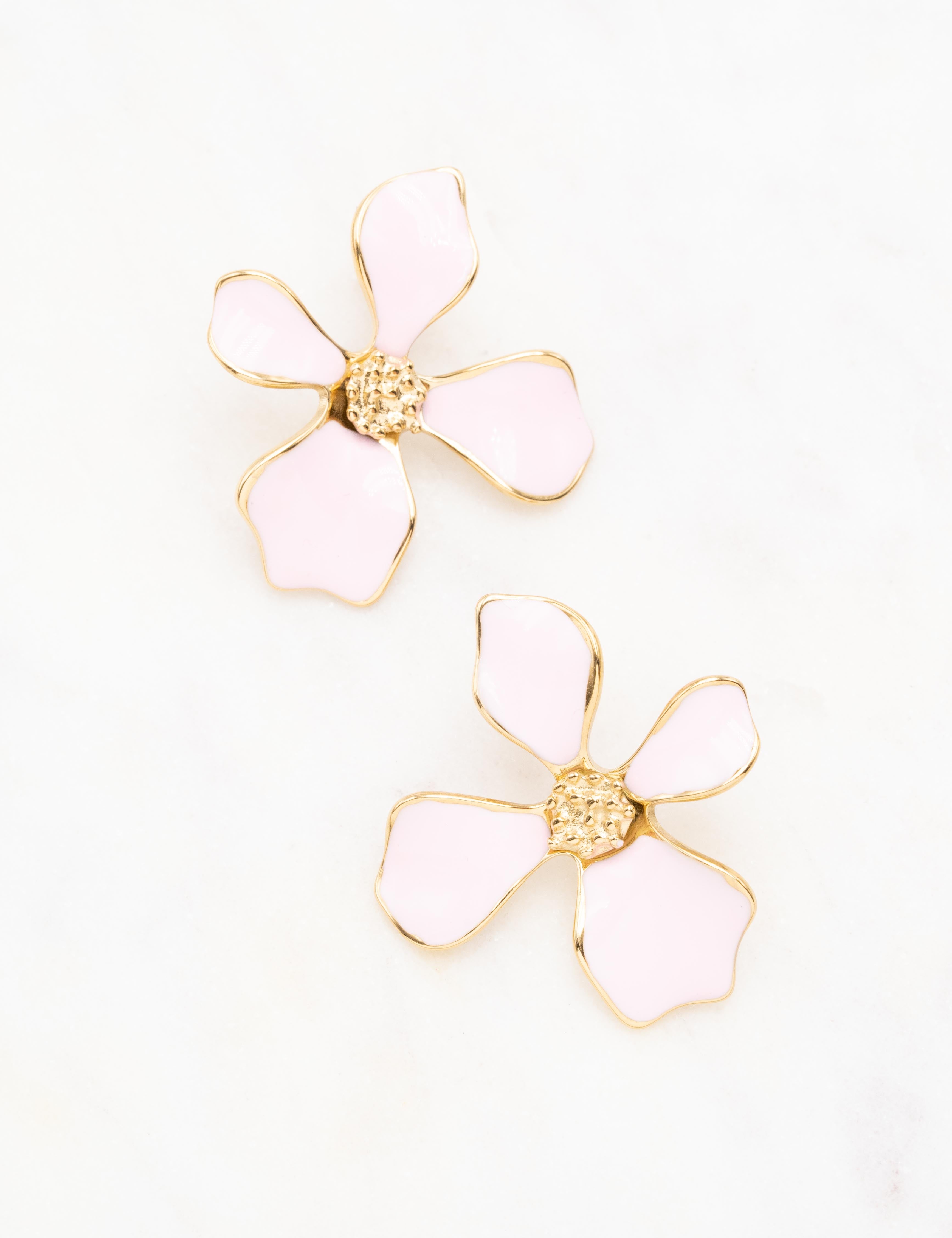 Boucles d'oreilles à puce formant une fleur émaillée colorée.
