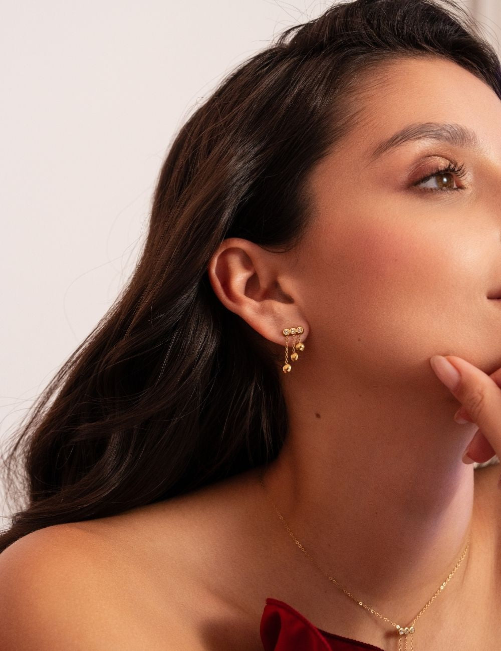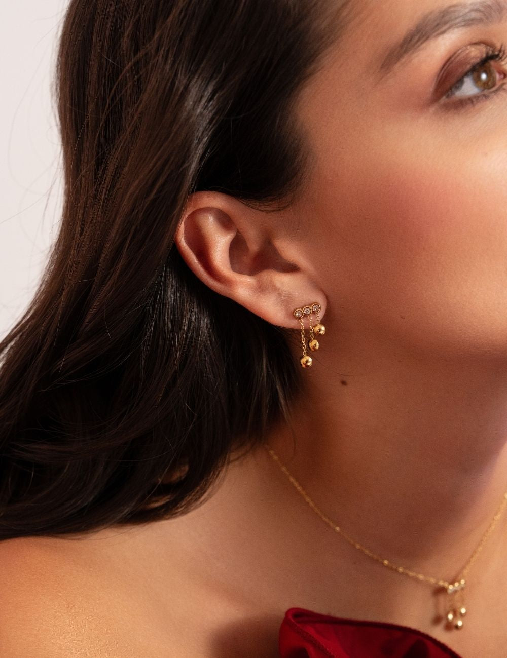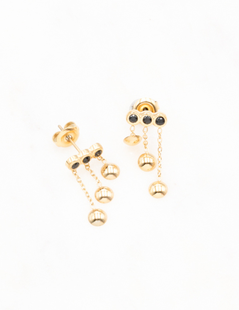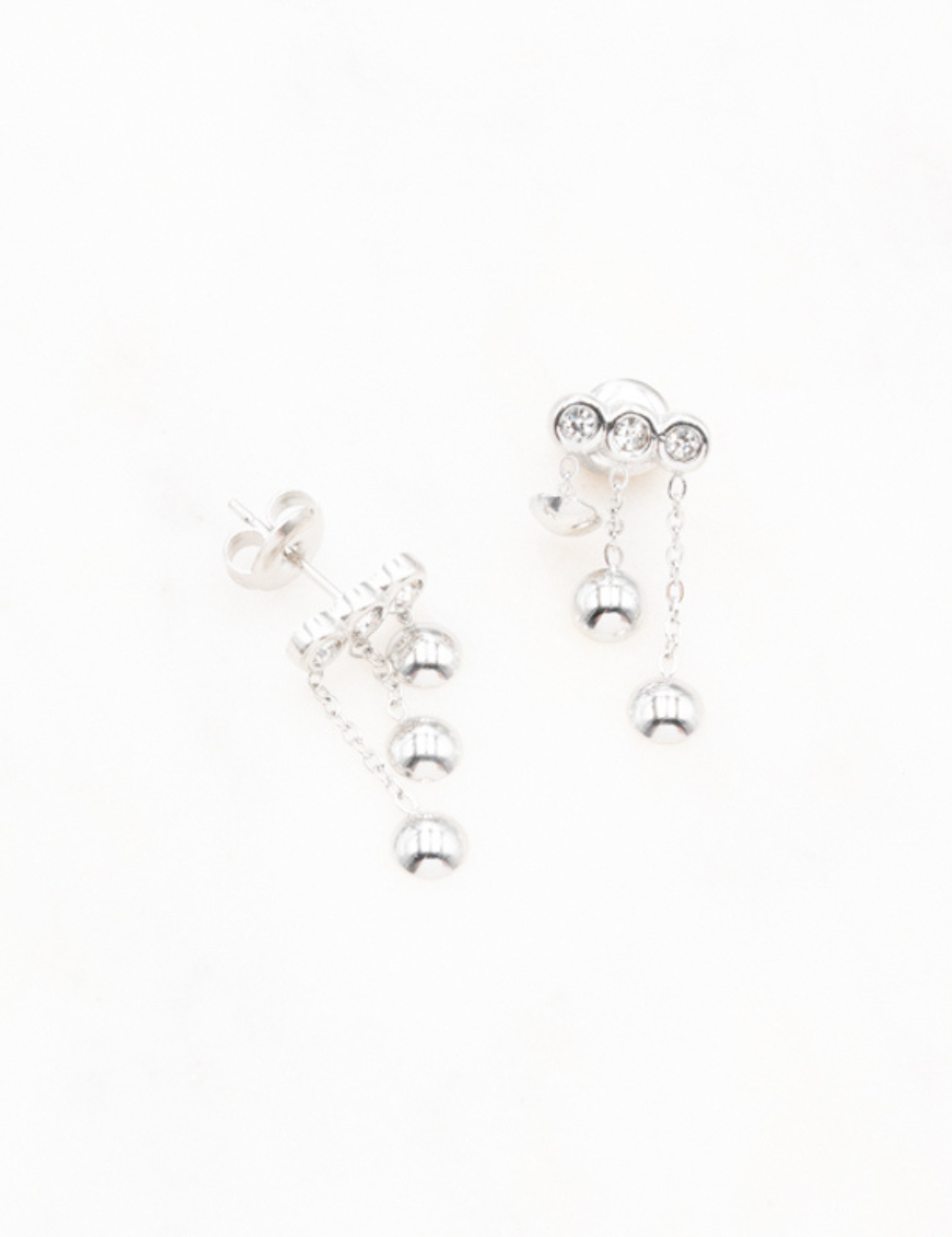 Boucles d'oreilles graphiques à puce composées de trois chaînes tombantes ornées de trois pampilles rondes et de trois strass.