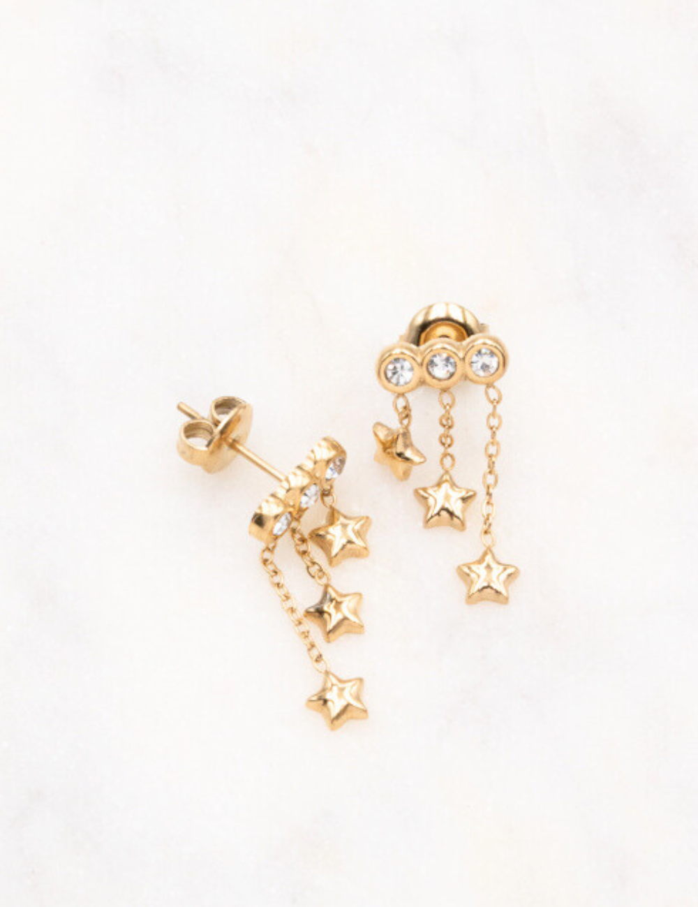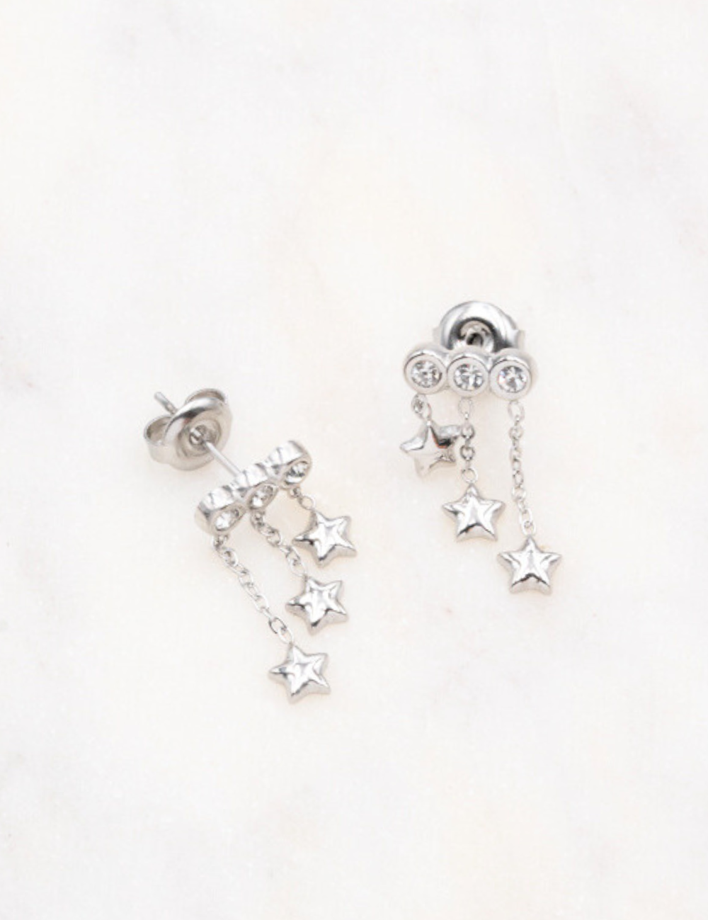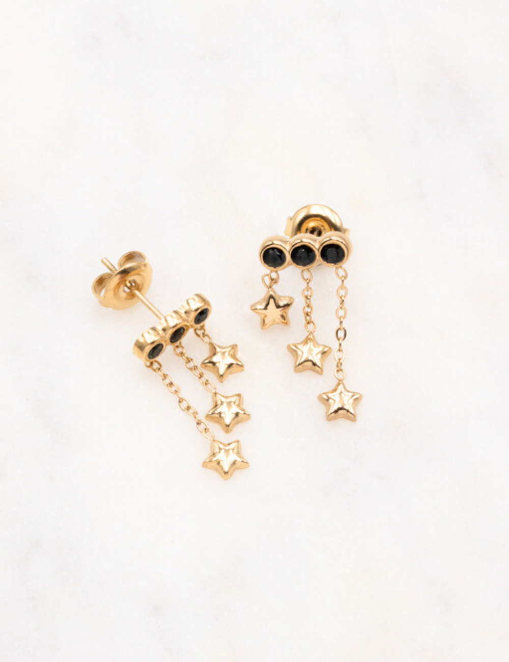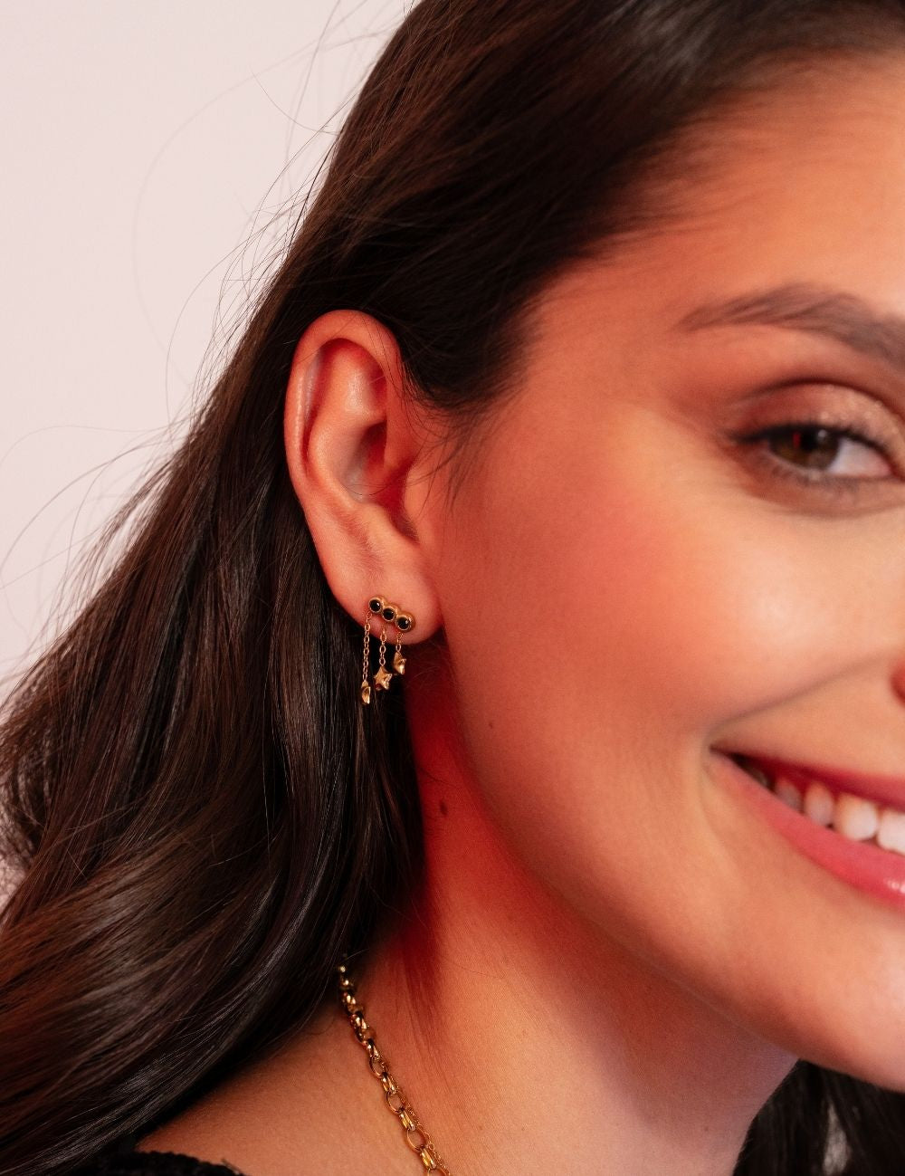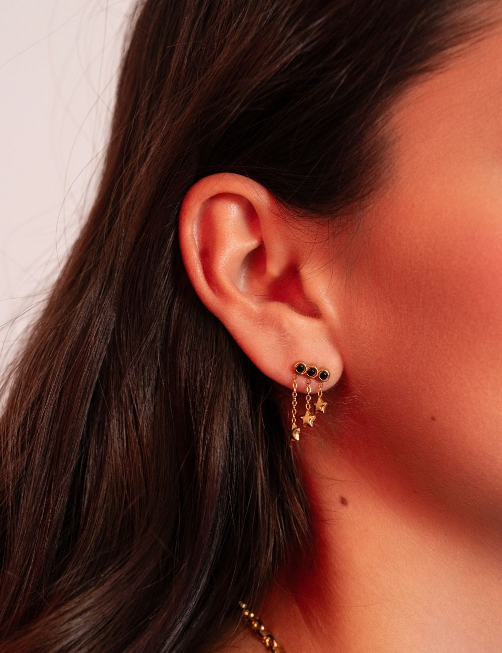 Boucles d'oreilles graphiques à puce composées de trois chaînes tombantes ornées de trois pampilles étoilées et de trois strass.
