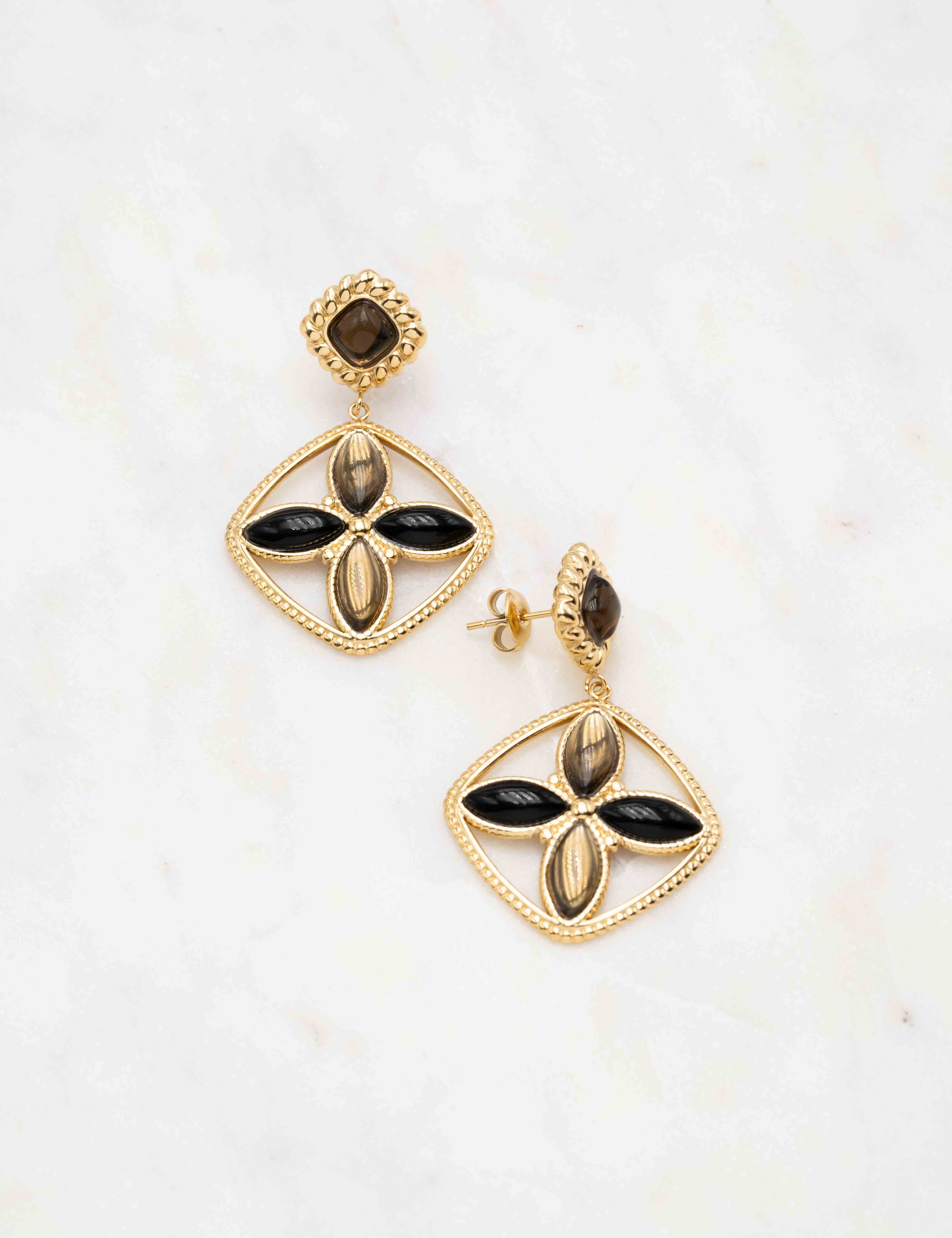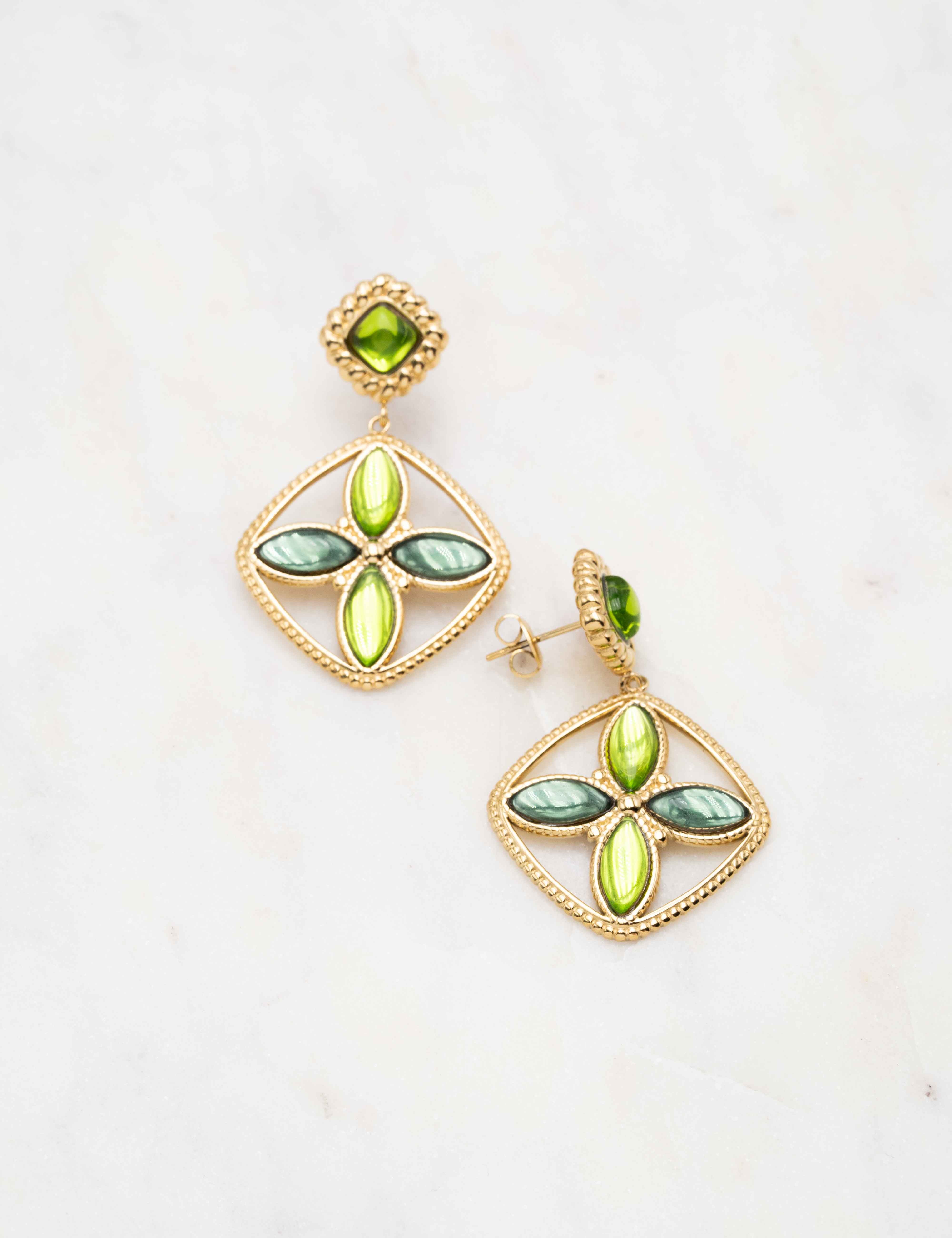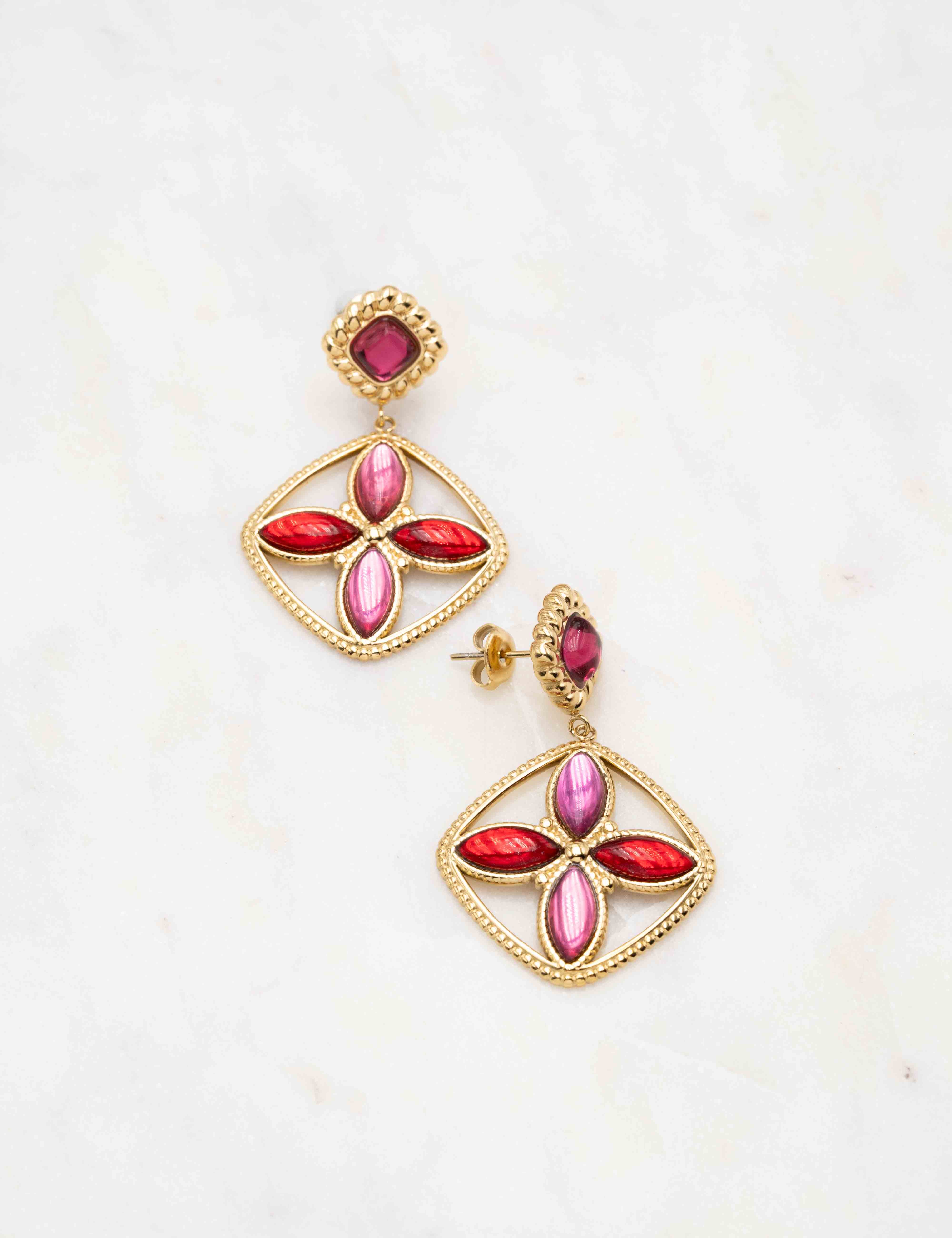 Boucles d'oreilles graphiques à puce pendantes composées d'une pièce géométrique ajourée, ornée de pièces colorées style cabochon en pâte de verre.