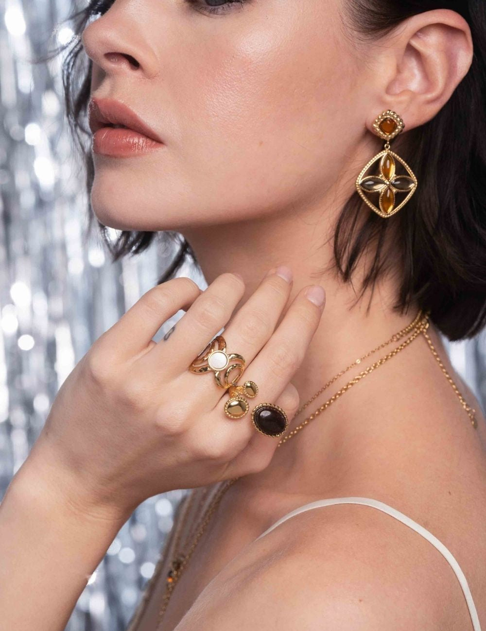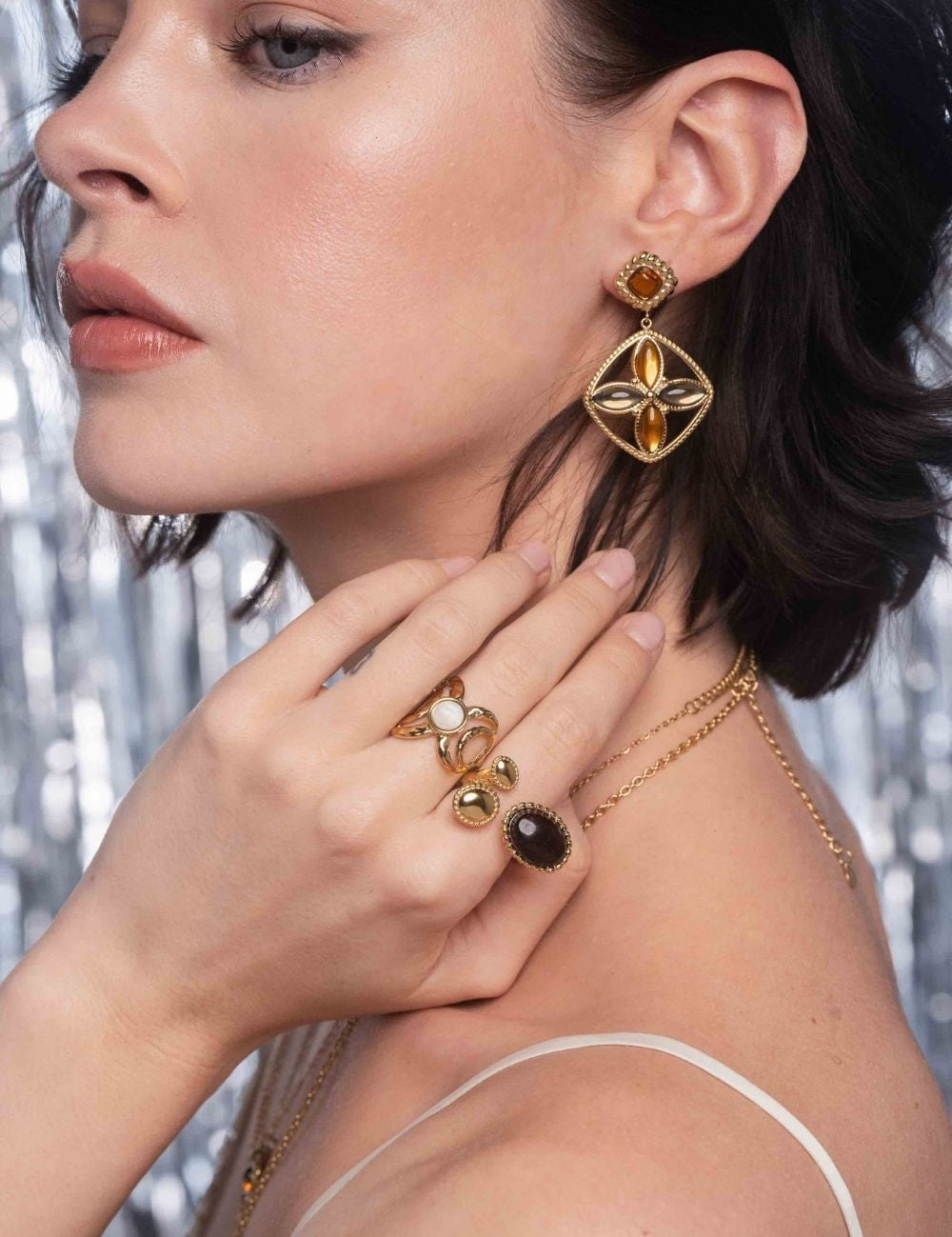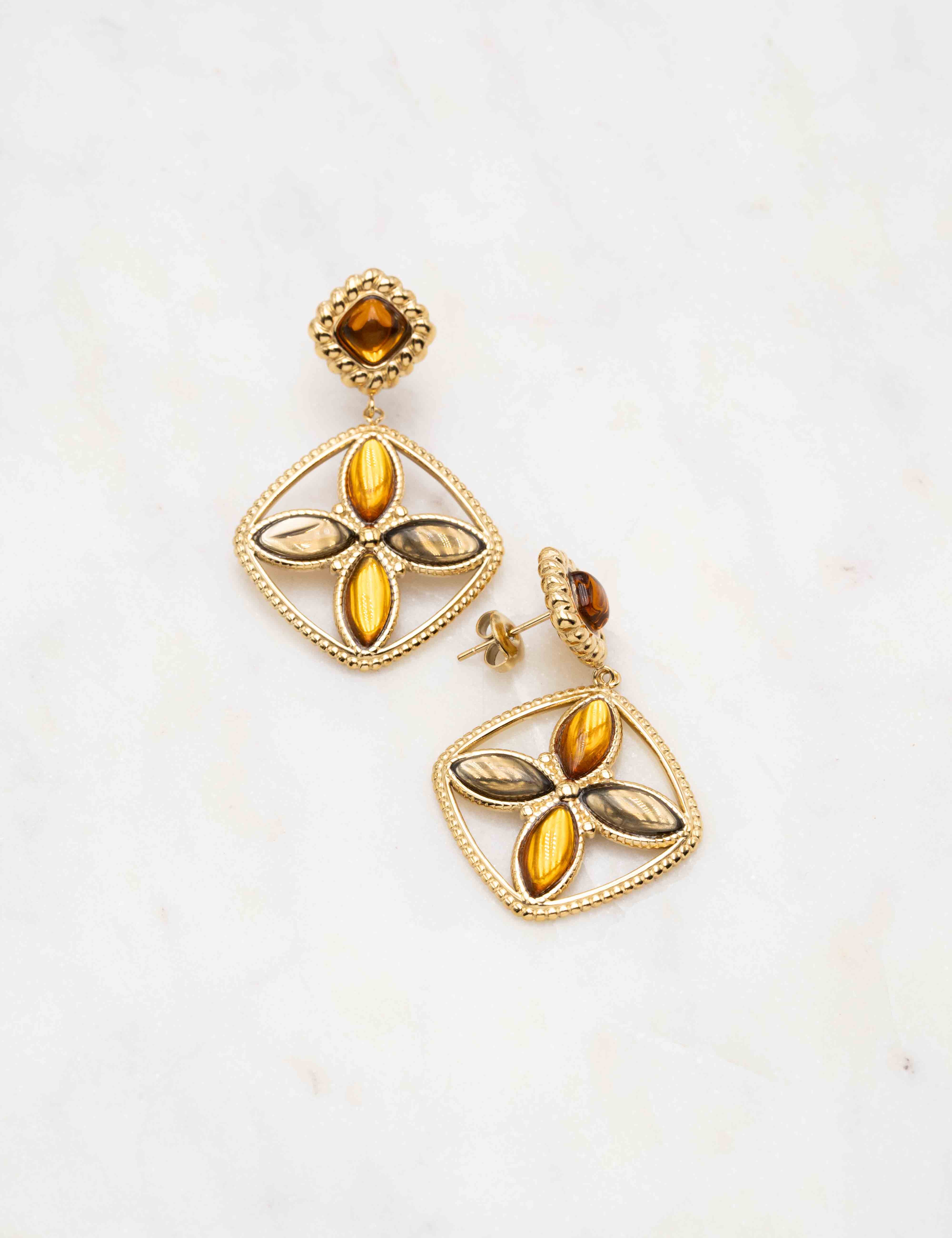 Boucles d'oreilles graphiques à puce pendantes composées d'une pièce géométrique ajourée, ornée de pièces colorées style cabochon en pâte de verre.
