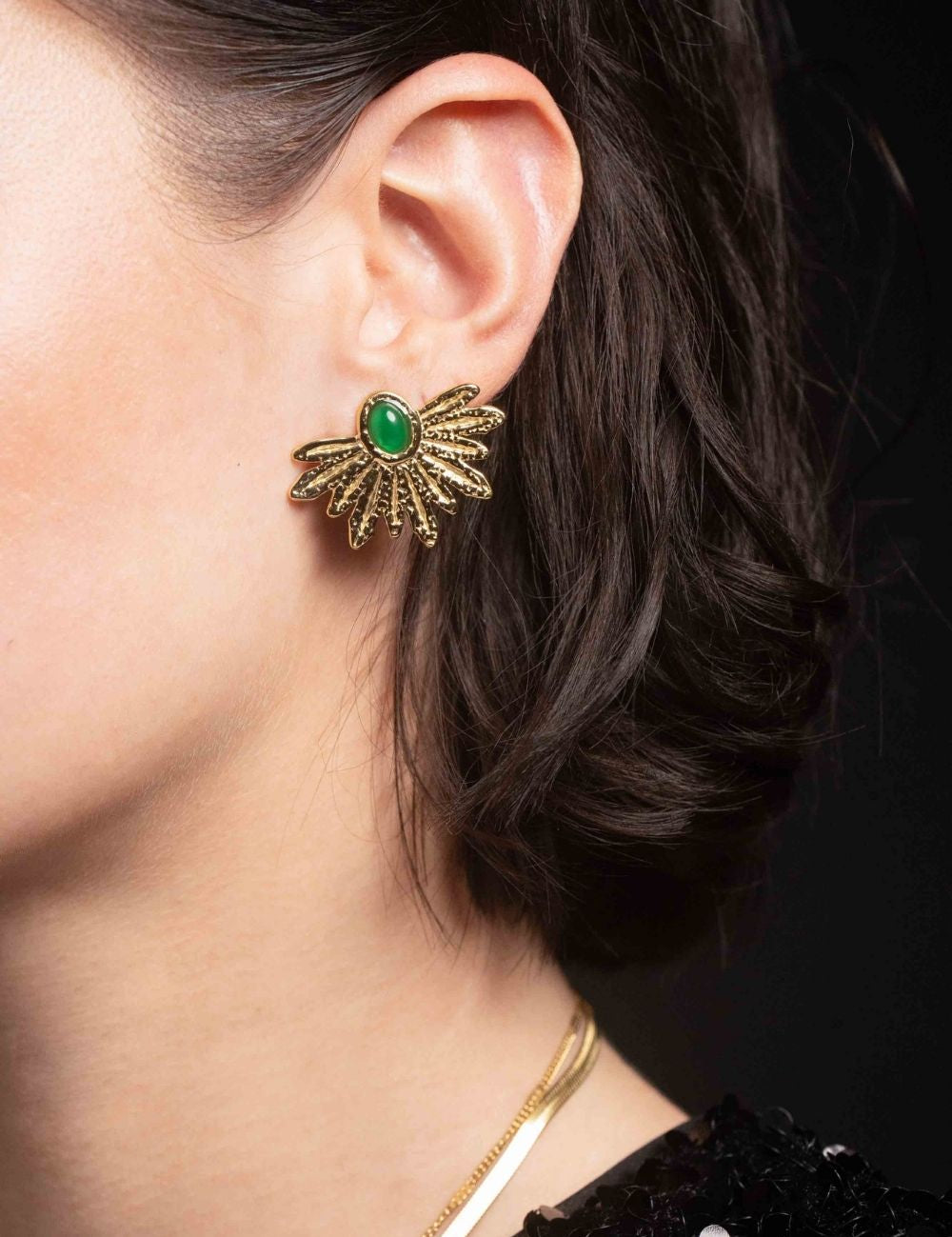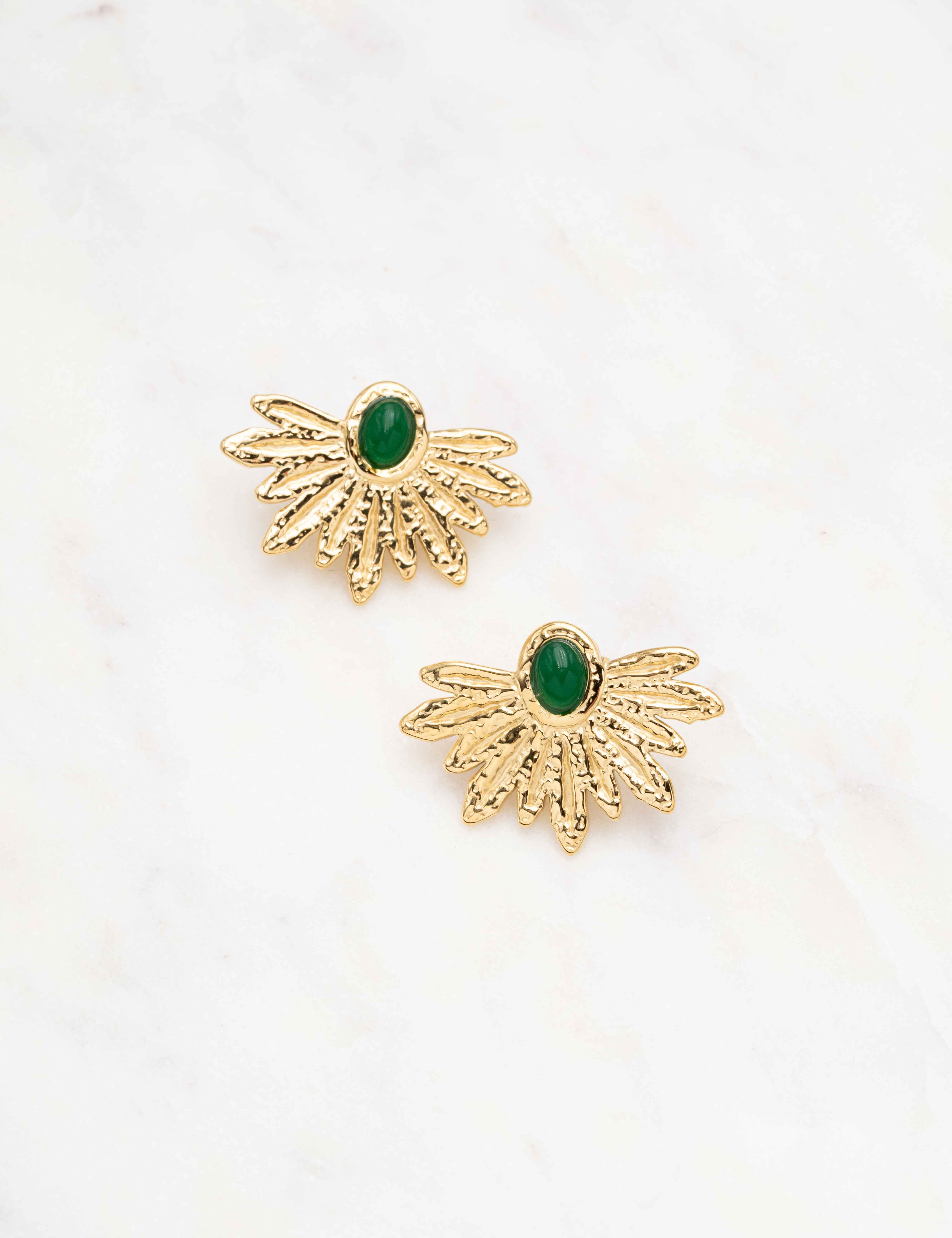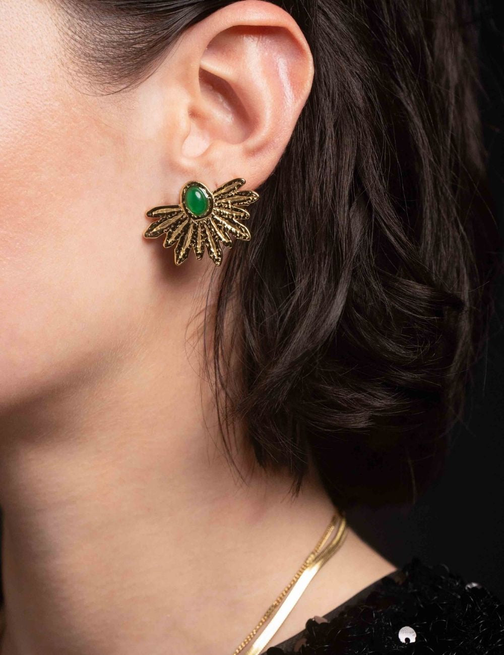 Boucles d'oreilles graphiques à puce composées d'une pièce au motif feuillage ornée d'une pierre naturelle.