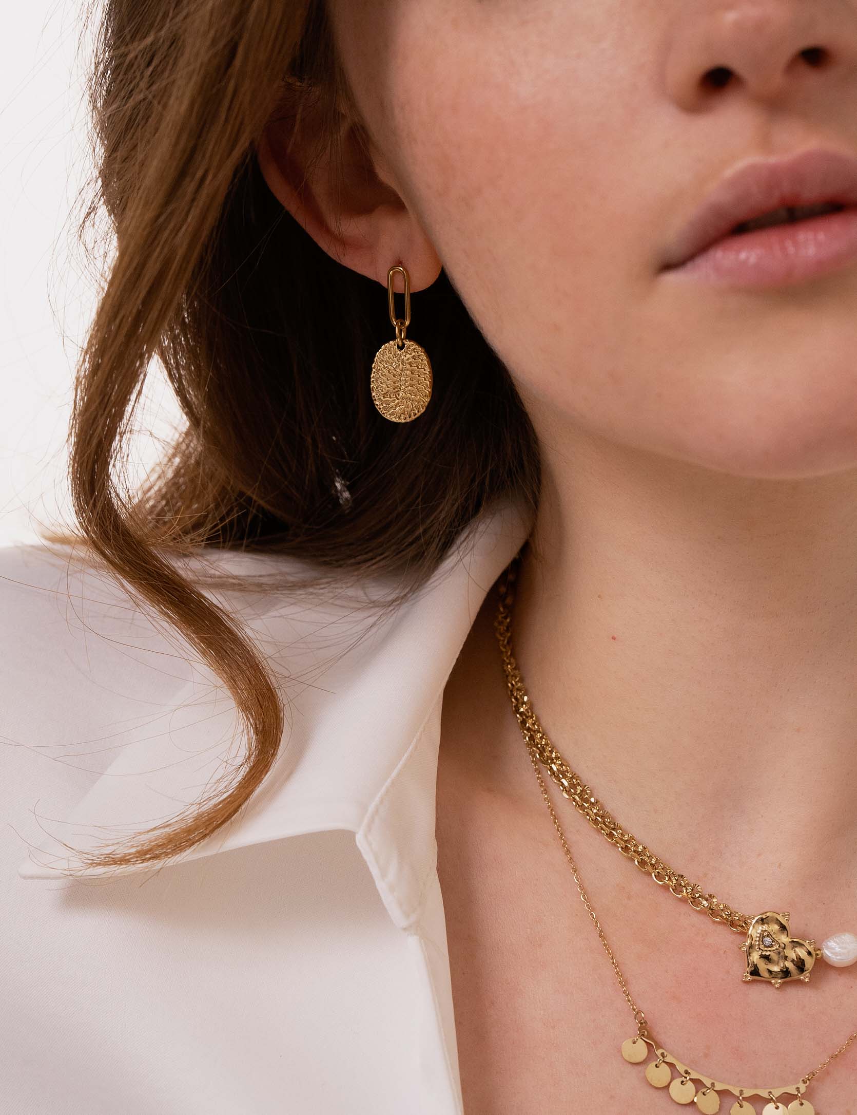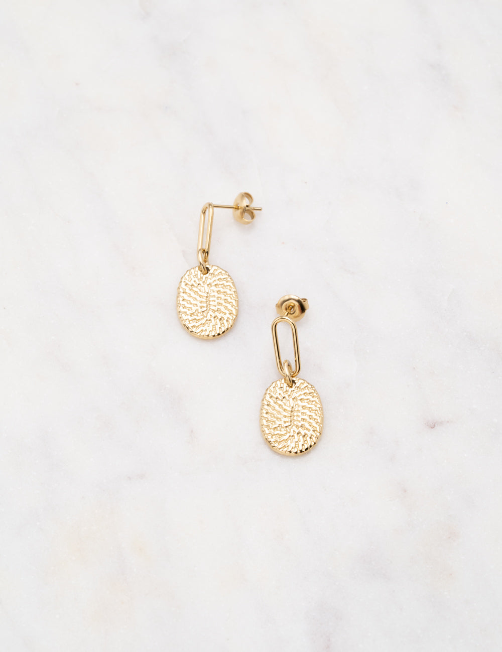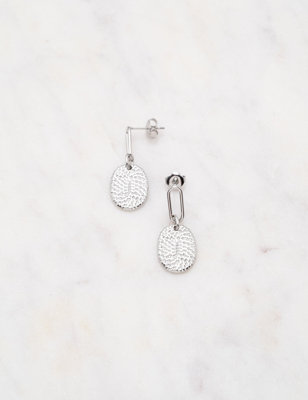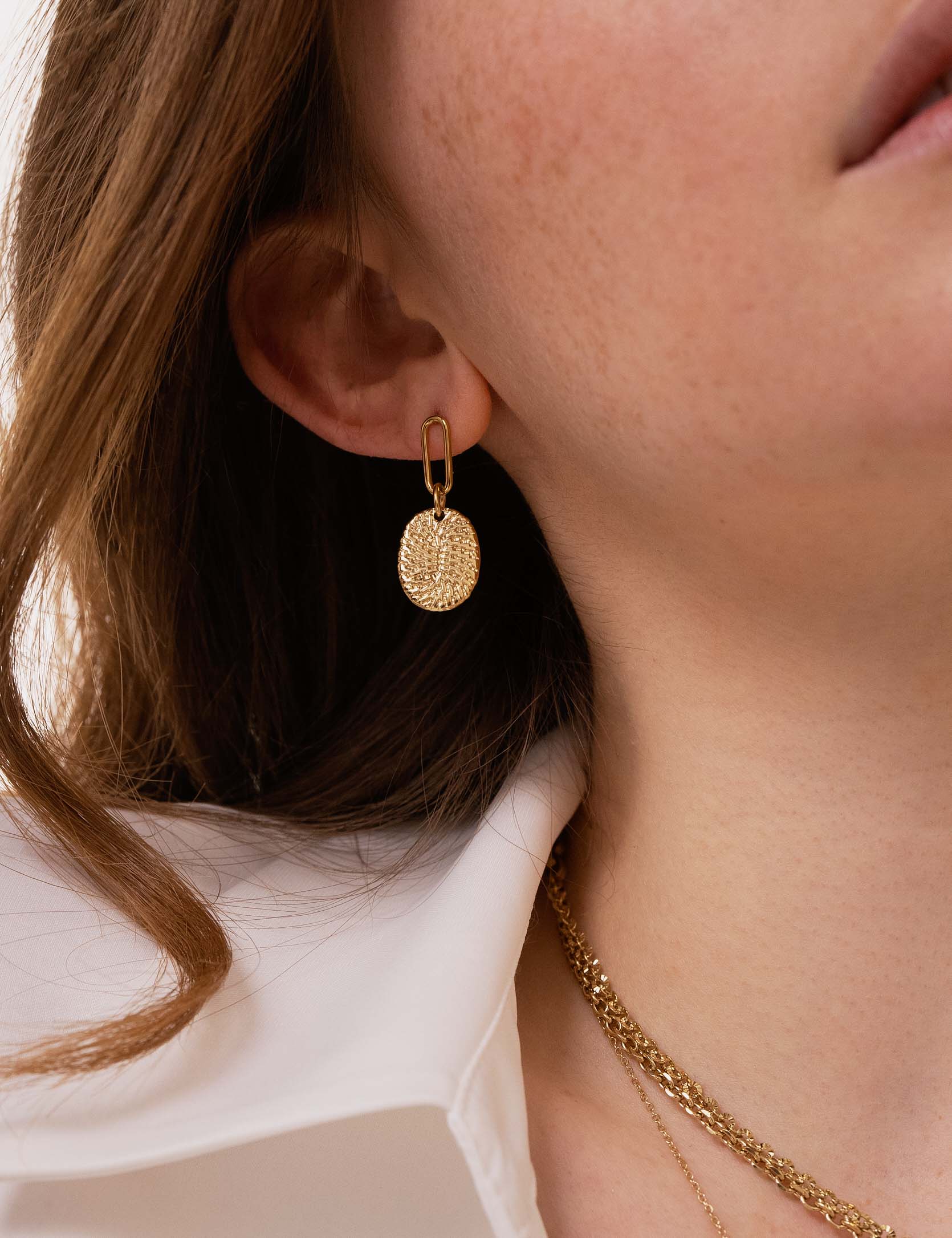 Boucles d'oreilles graphiques à puce composées d'un anneau et d'une pièce ovale texturée. Fermoir papillon.