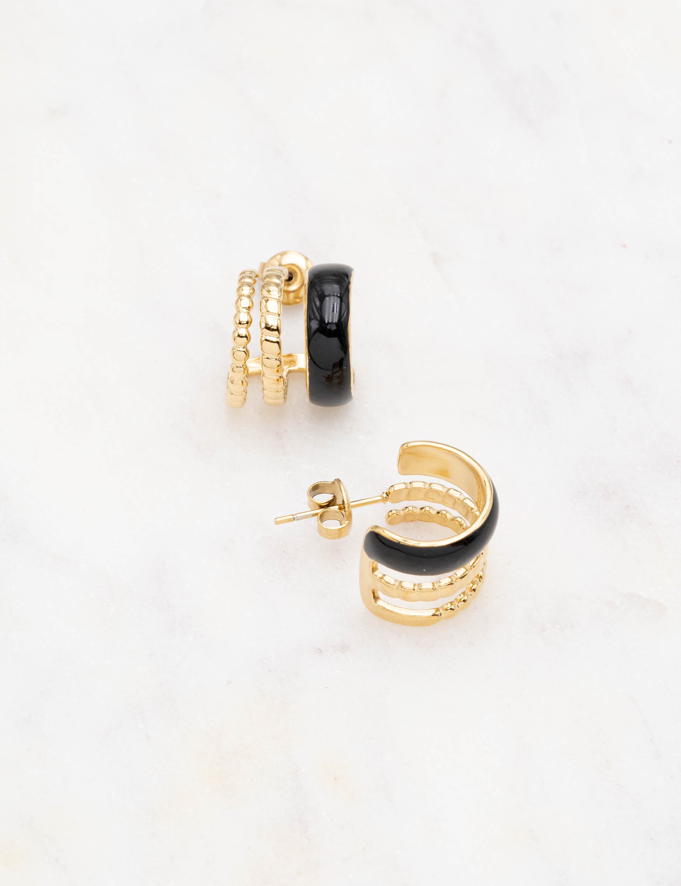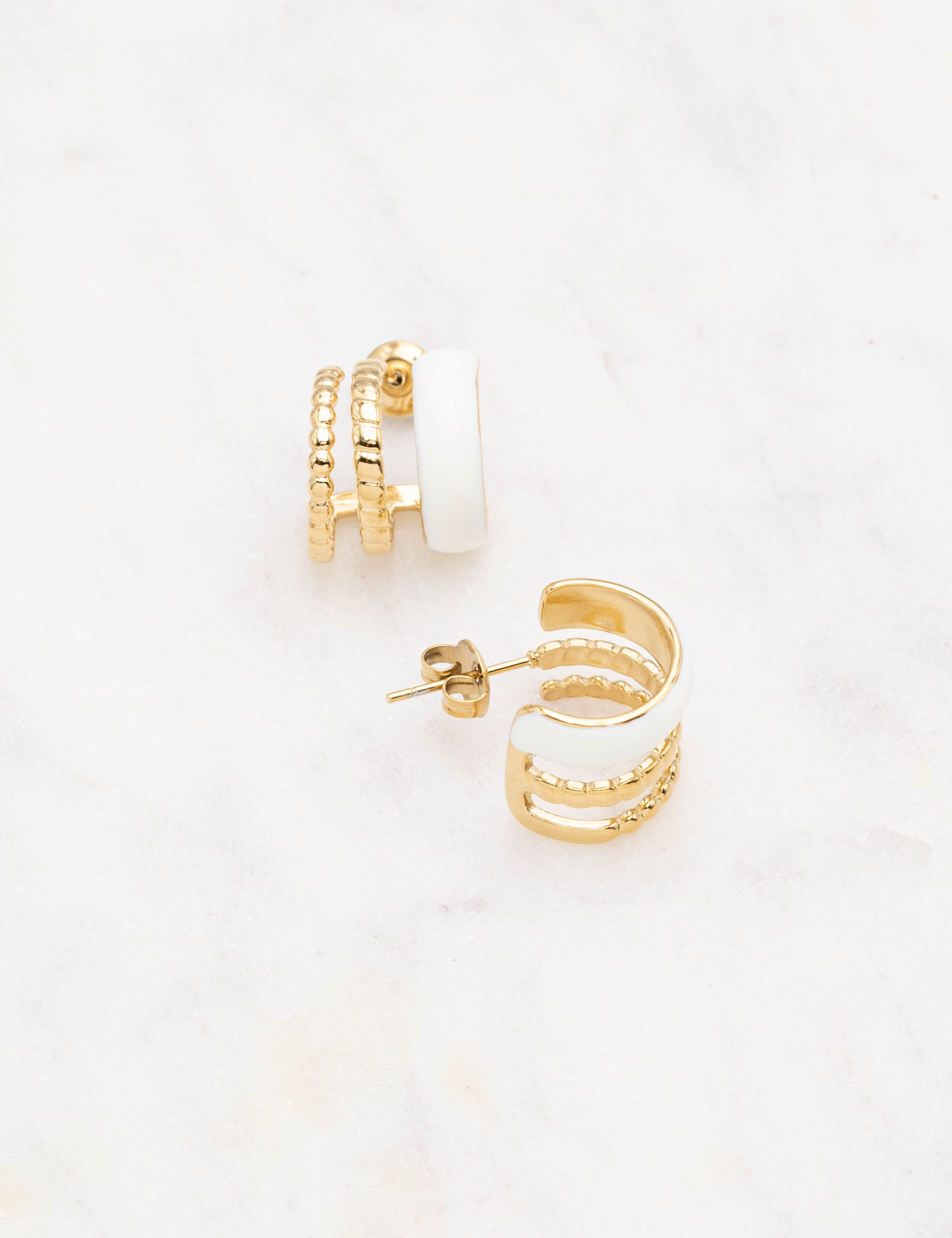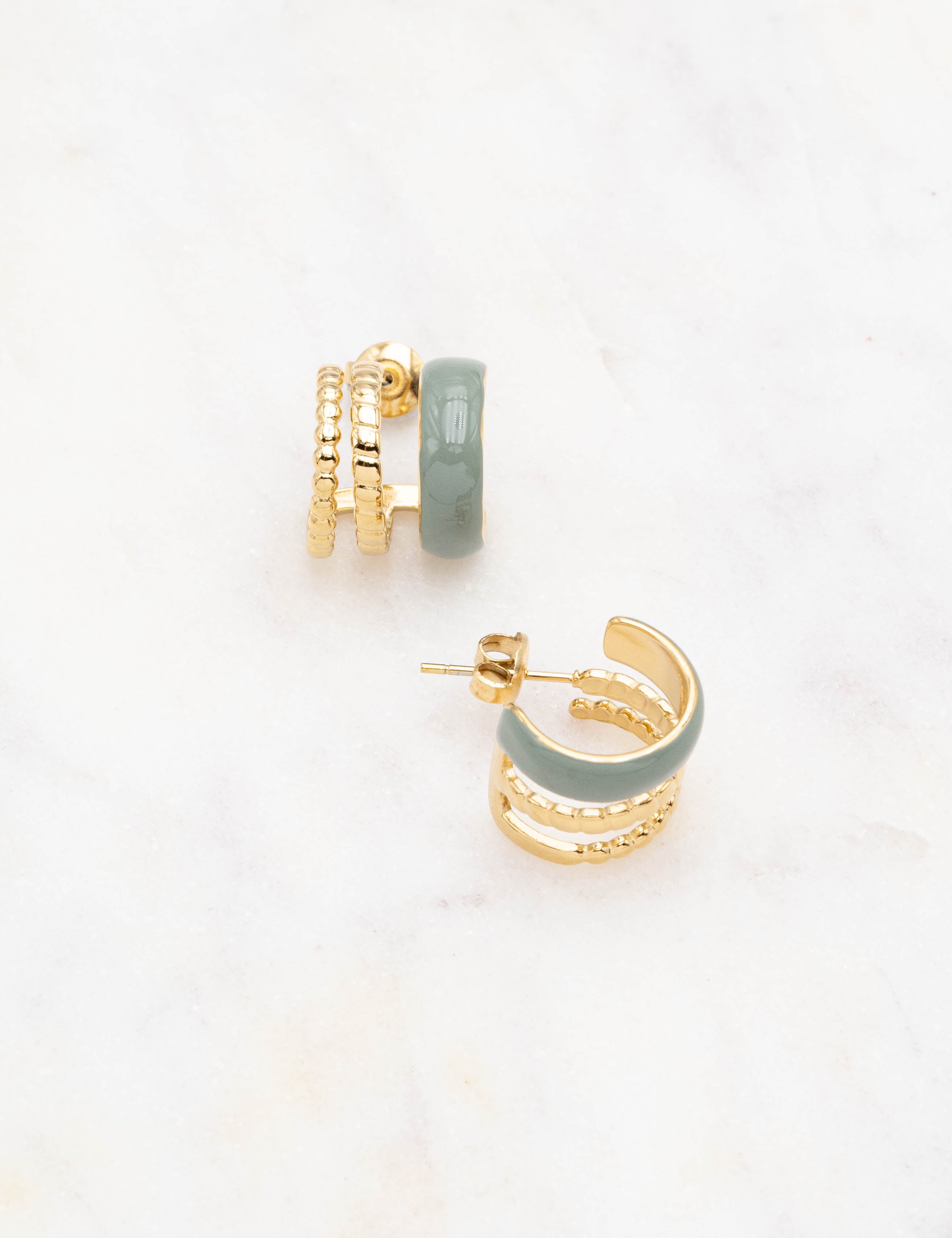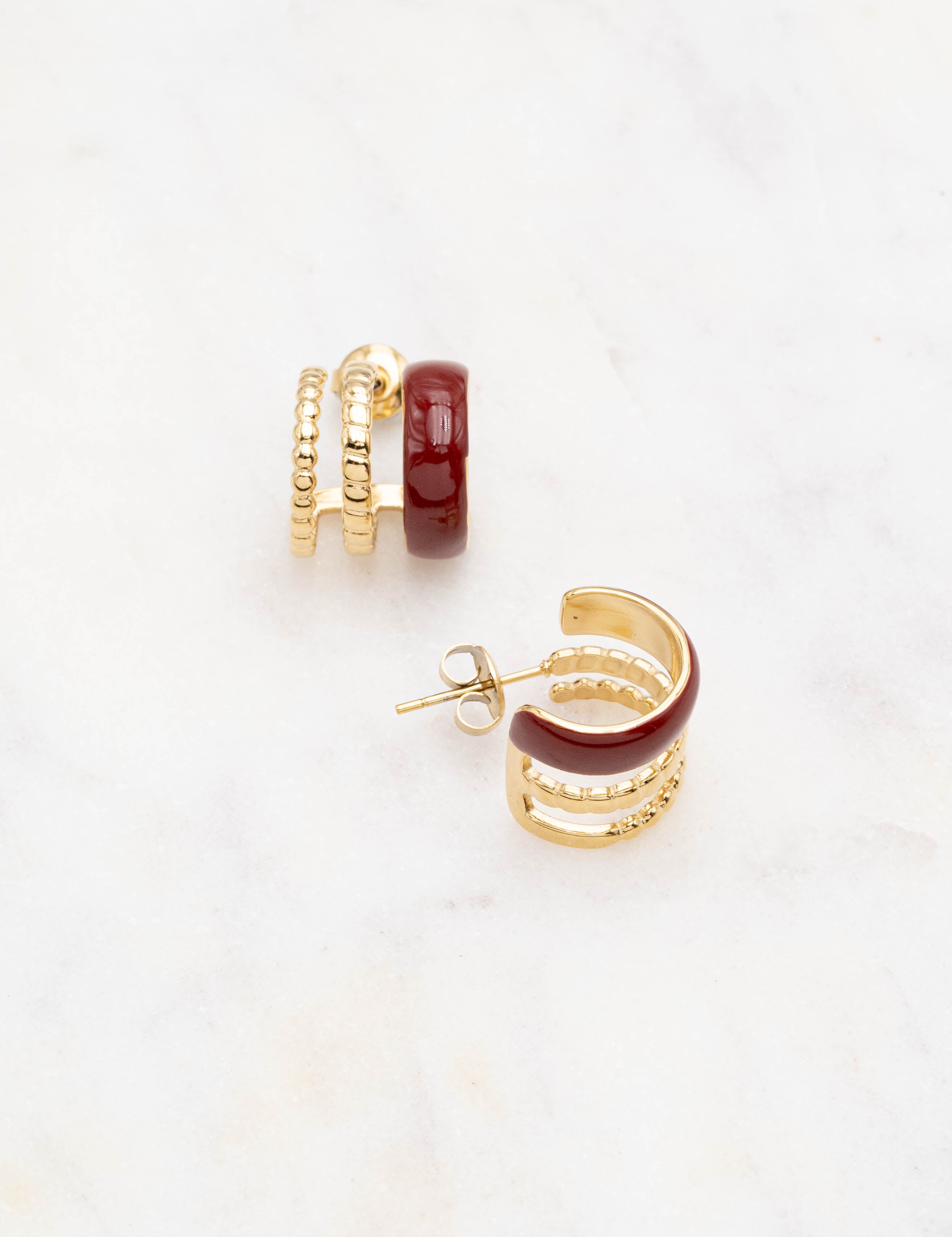 Boucles d'oreilles de type mini créoles à puce trois rangs avec effet canelé et émaillé coloré .