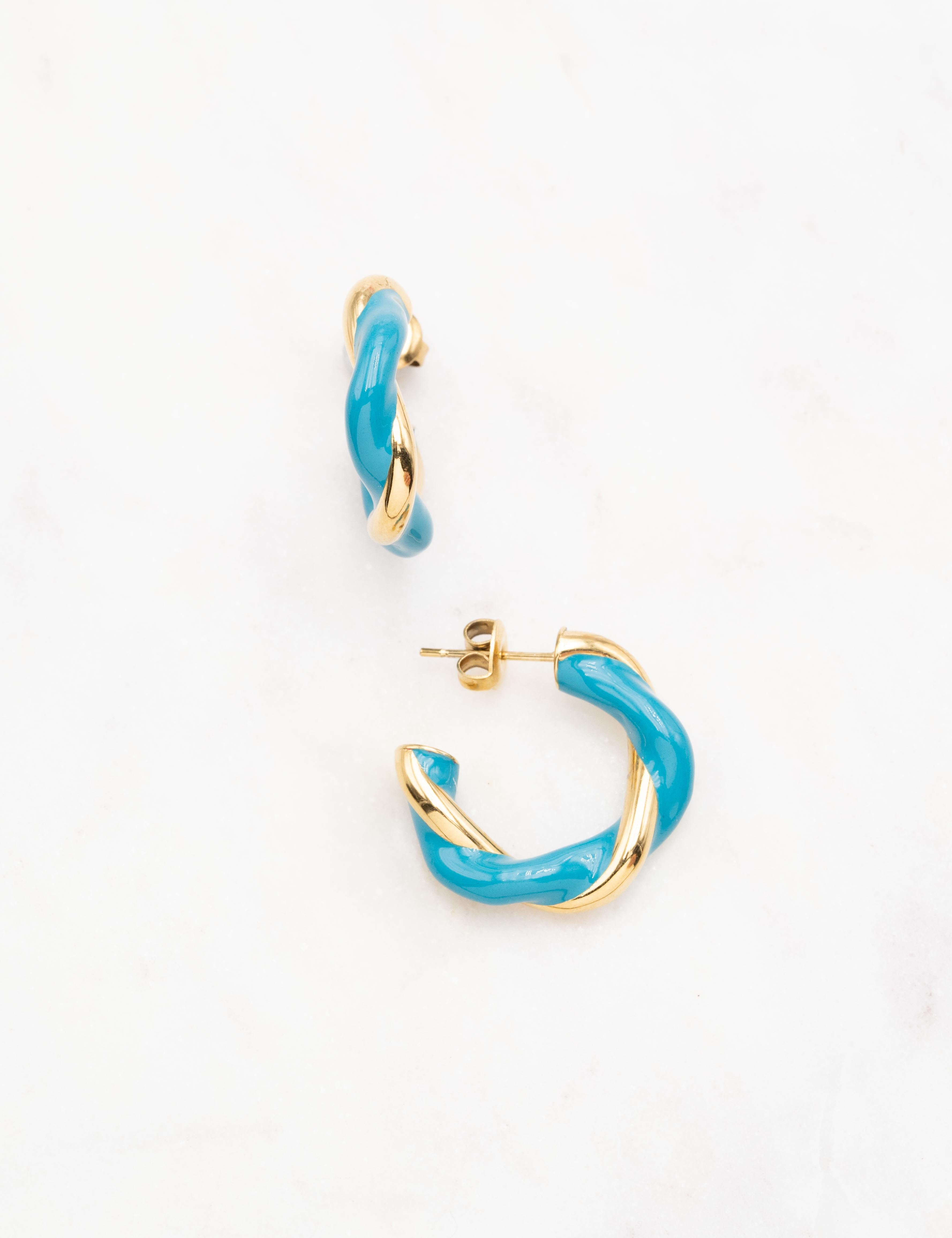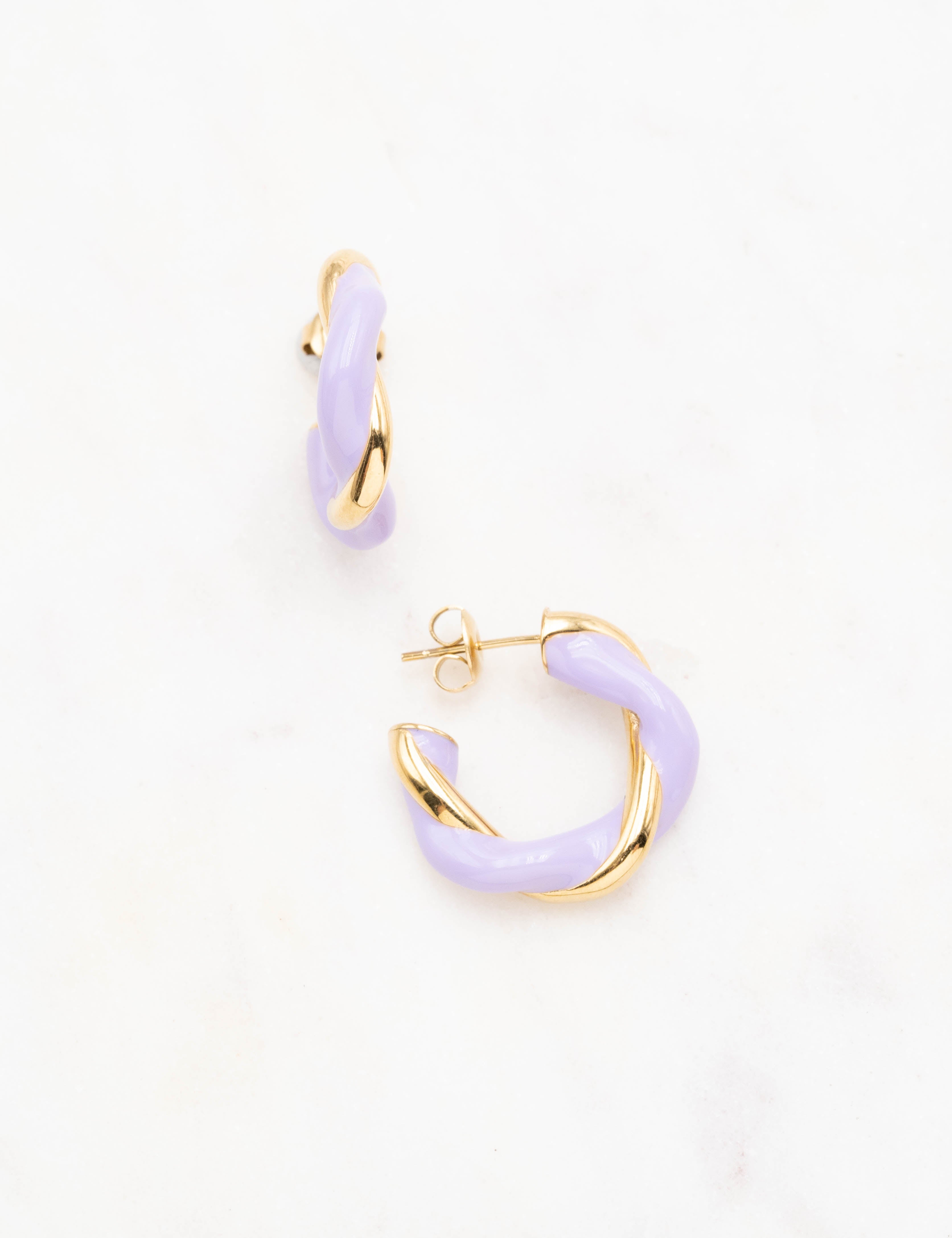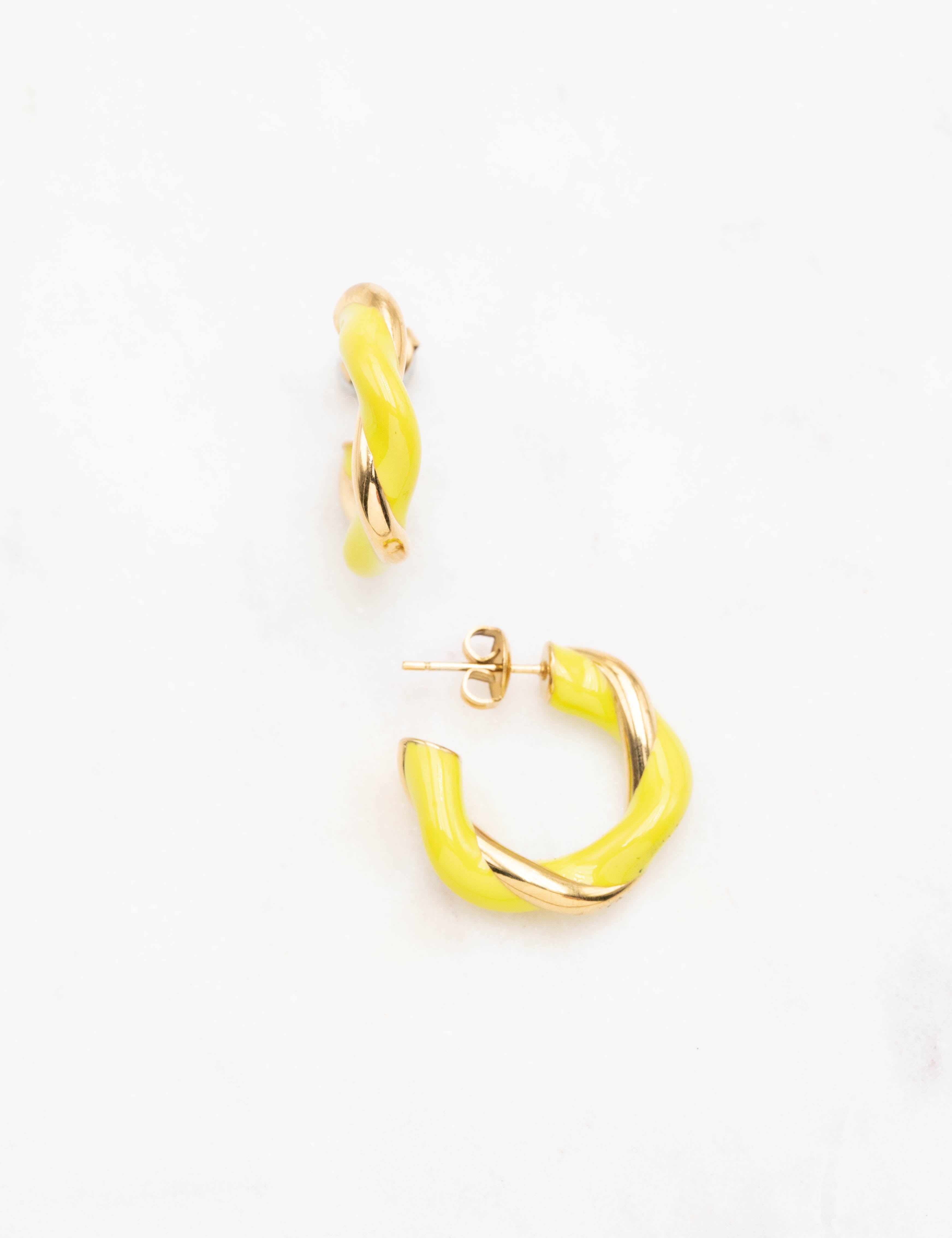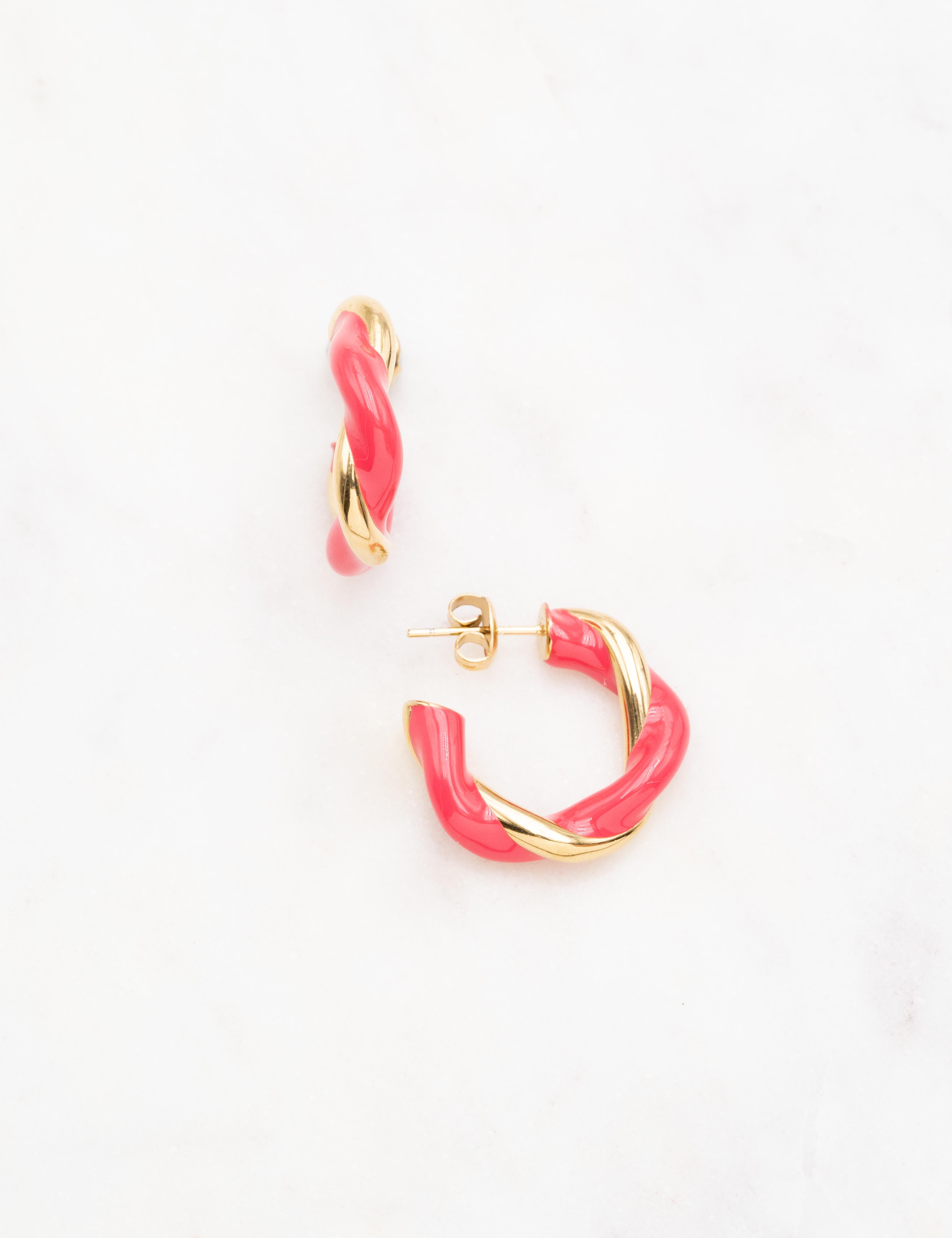 Boucles d'oreilles type créoles à puce torsadées émaillées colorées.