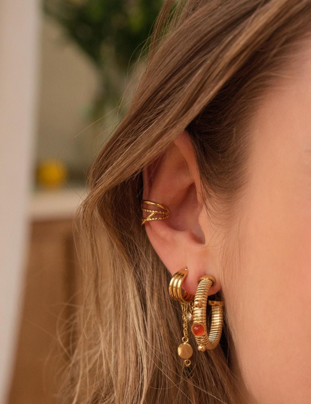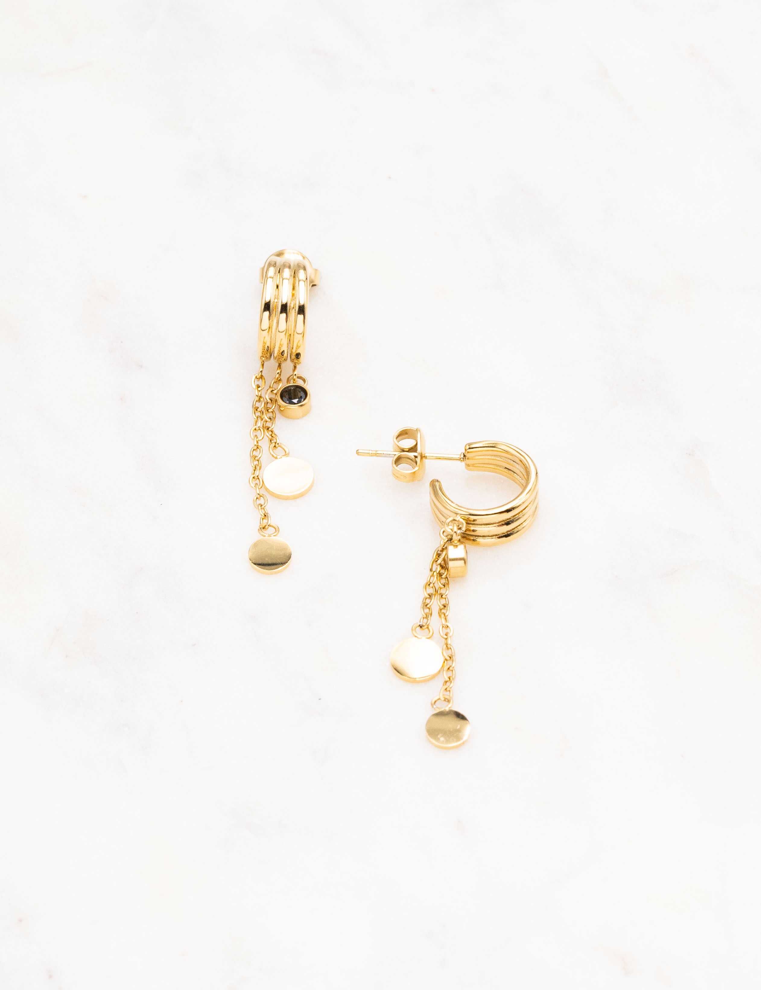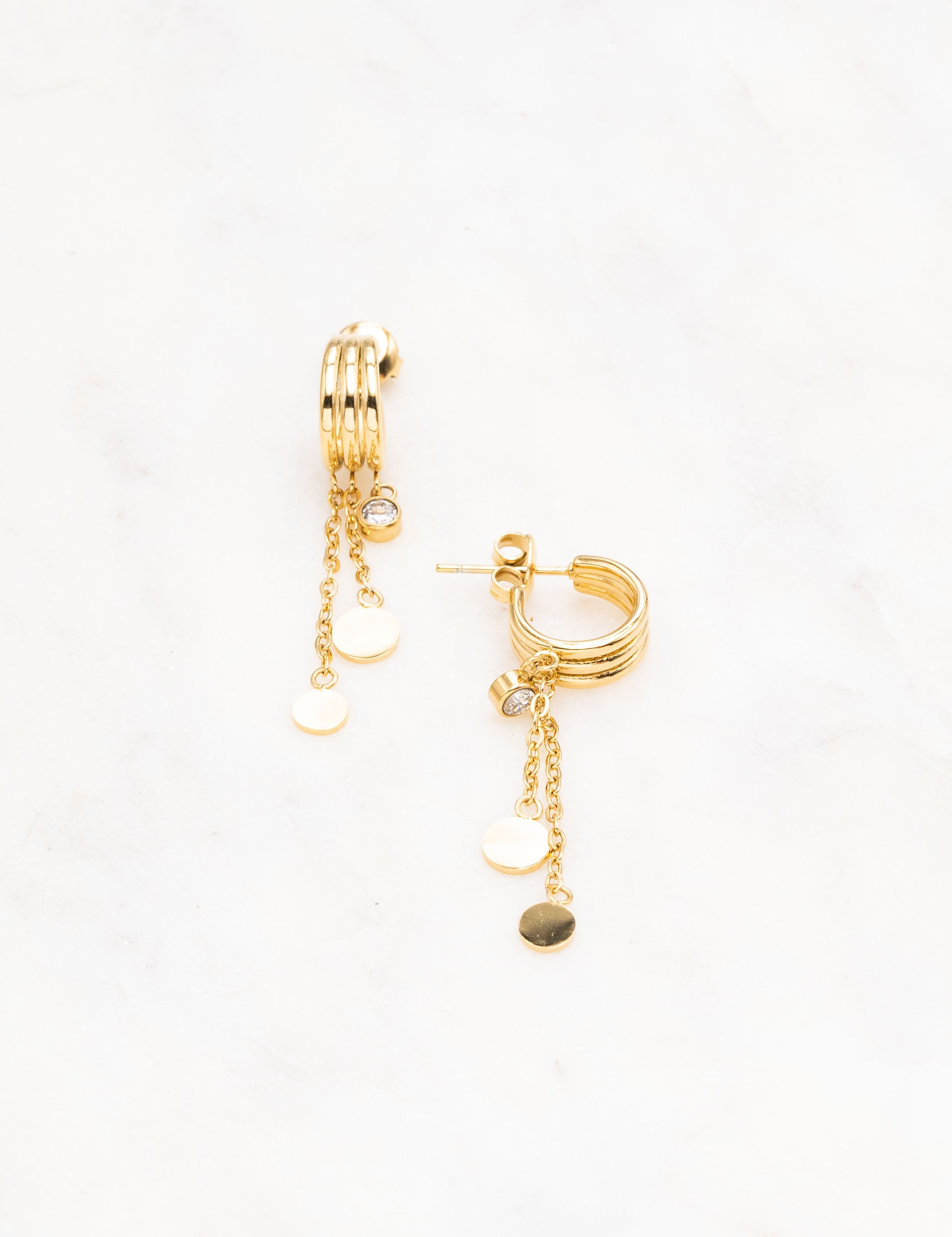 Boucles d'oreilles graphiques type créoles à puce composées d'une pampille strassée, d'un jeu de chaines et petites pièces rondes.