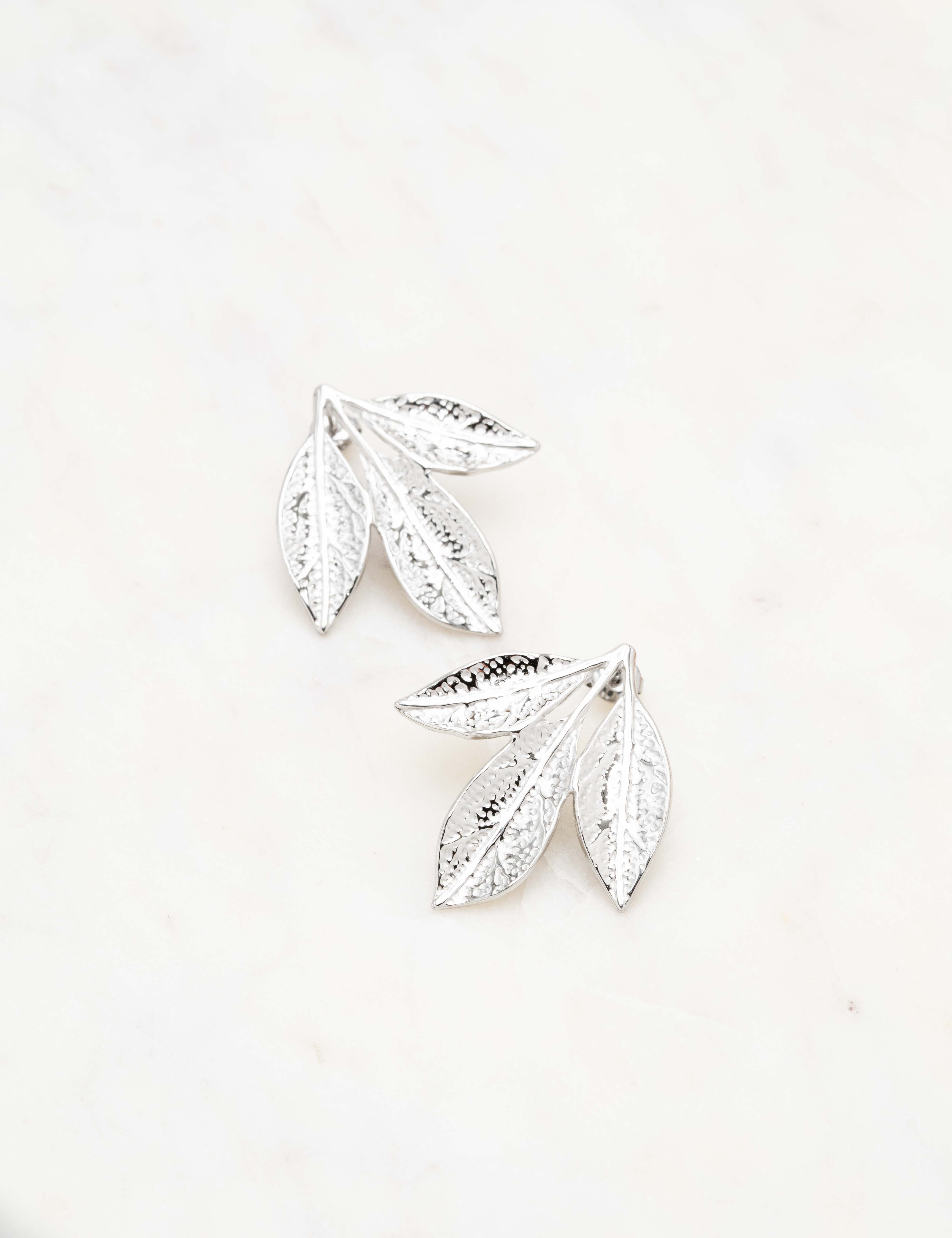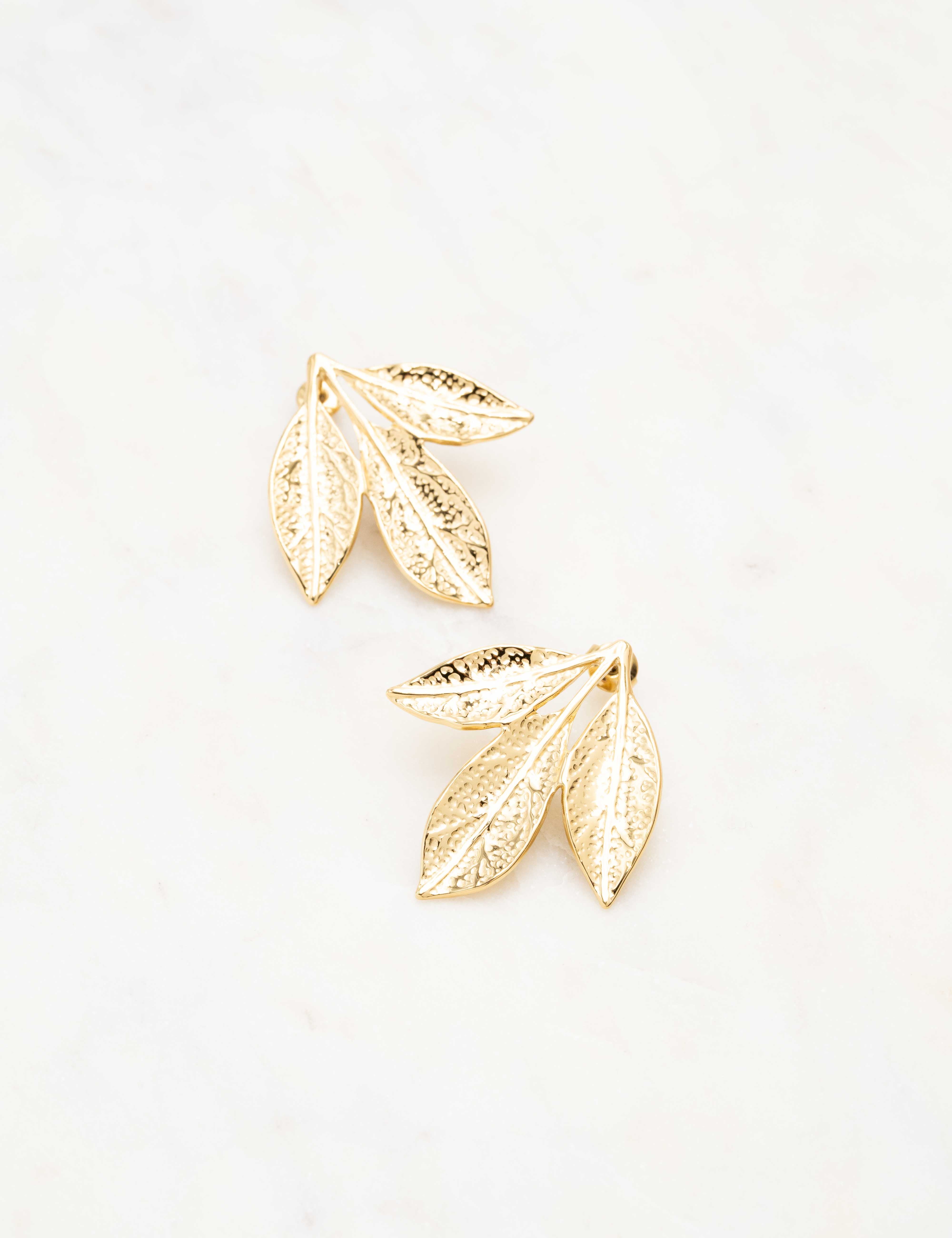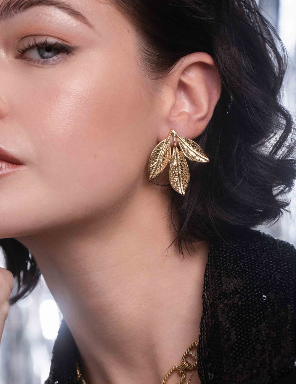 Boucles d'oreilles graphiques à puce composées de trois feuilles texturées.