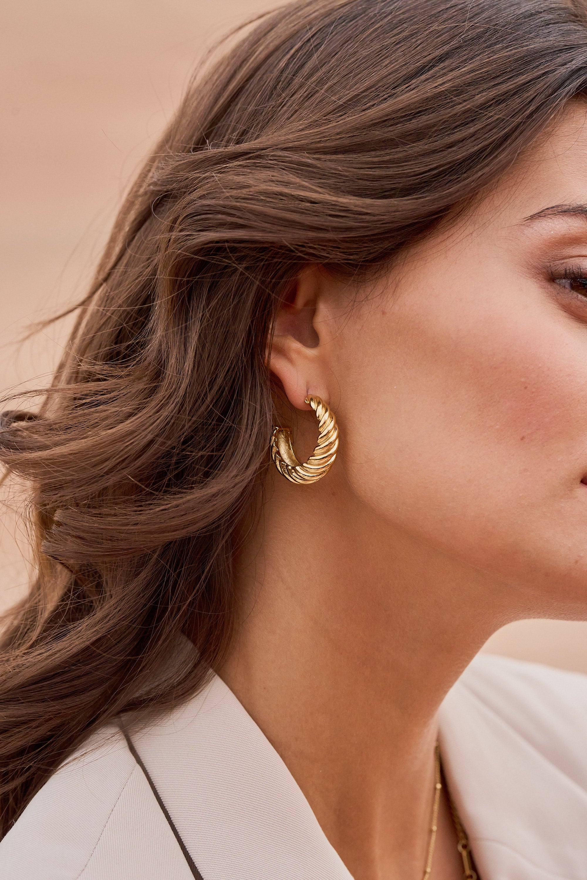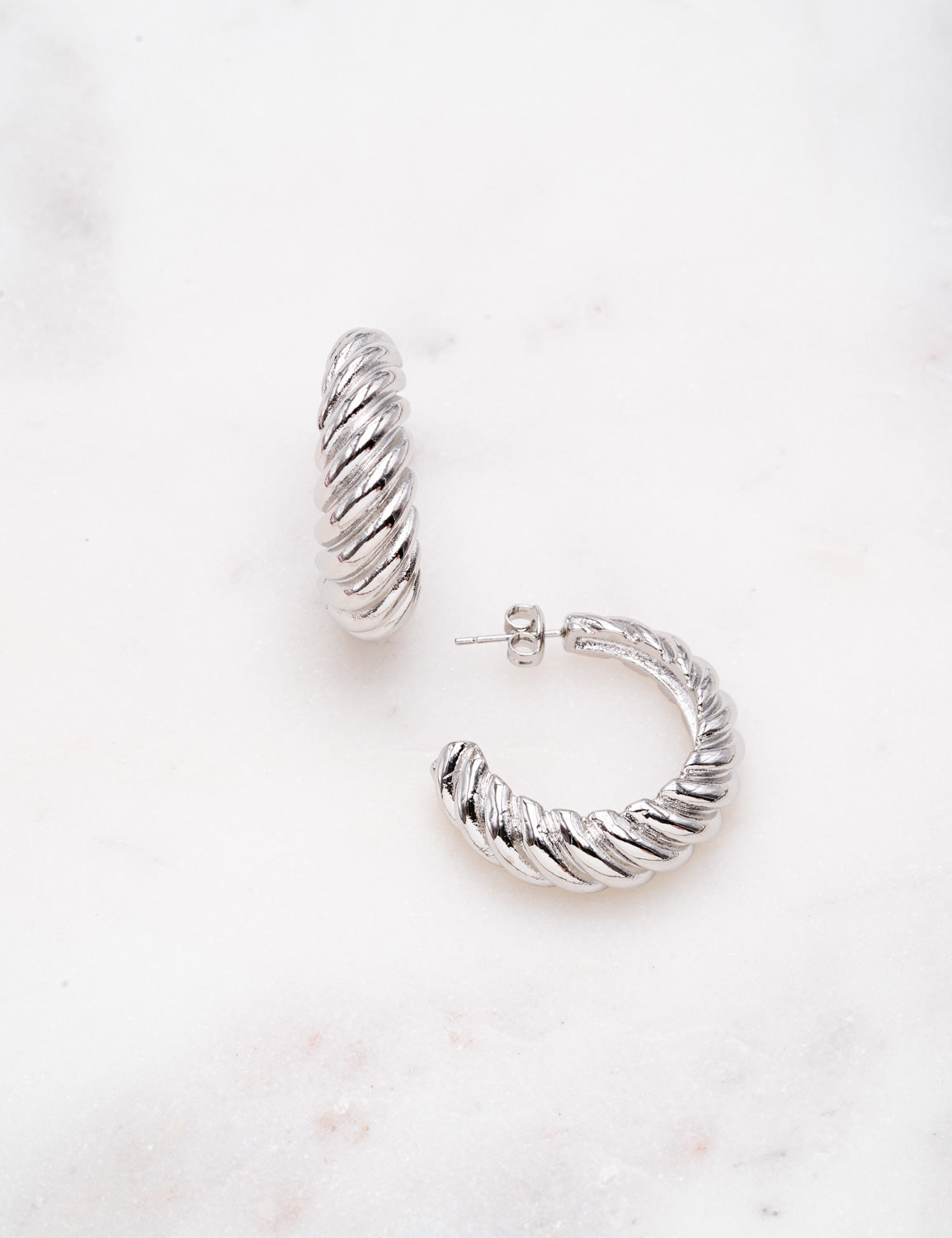 Boucles d'oreilles graphiques type créoles à puce texturées effet torsadé. Fermoir papillon.