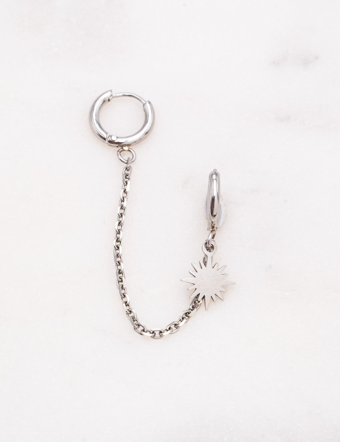Mono boucle d'oreille type créole à fermoir charnière avec chaine et pampille au motif d'étoile.
