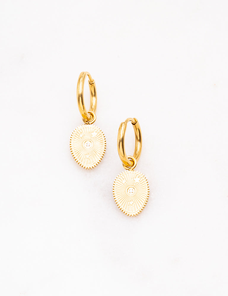 Boucles d'oreilles type créoles composées d'une pièce ovale avec des étoiles et de strass (oxyde de zirconium). Fermoir charnière.