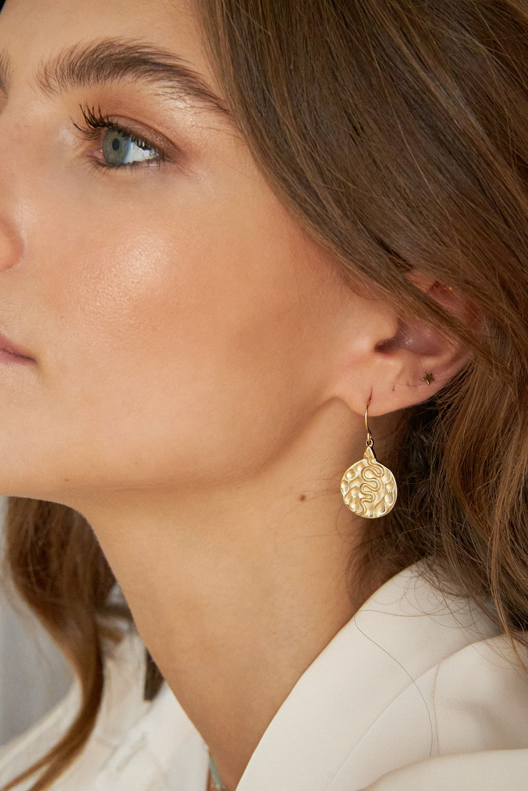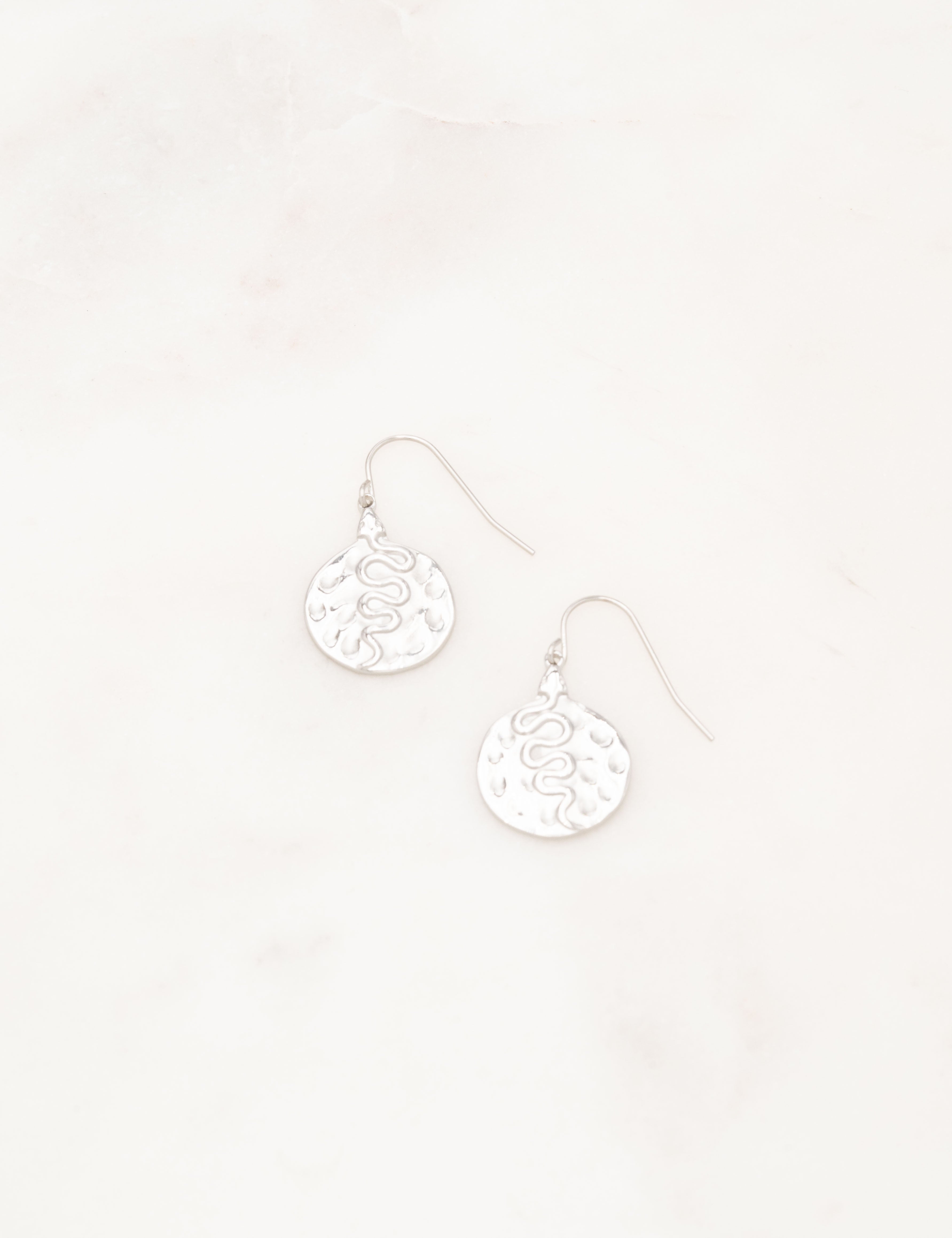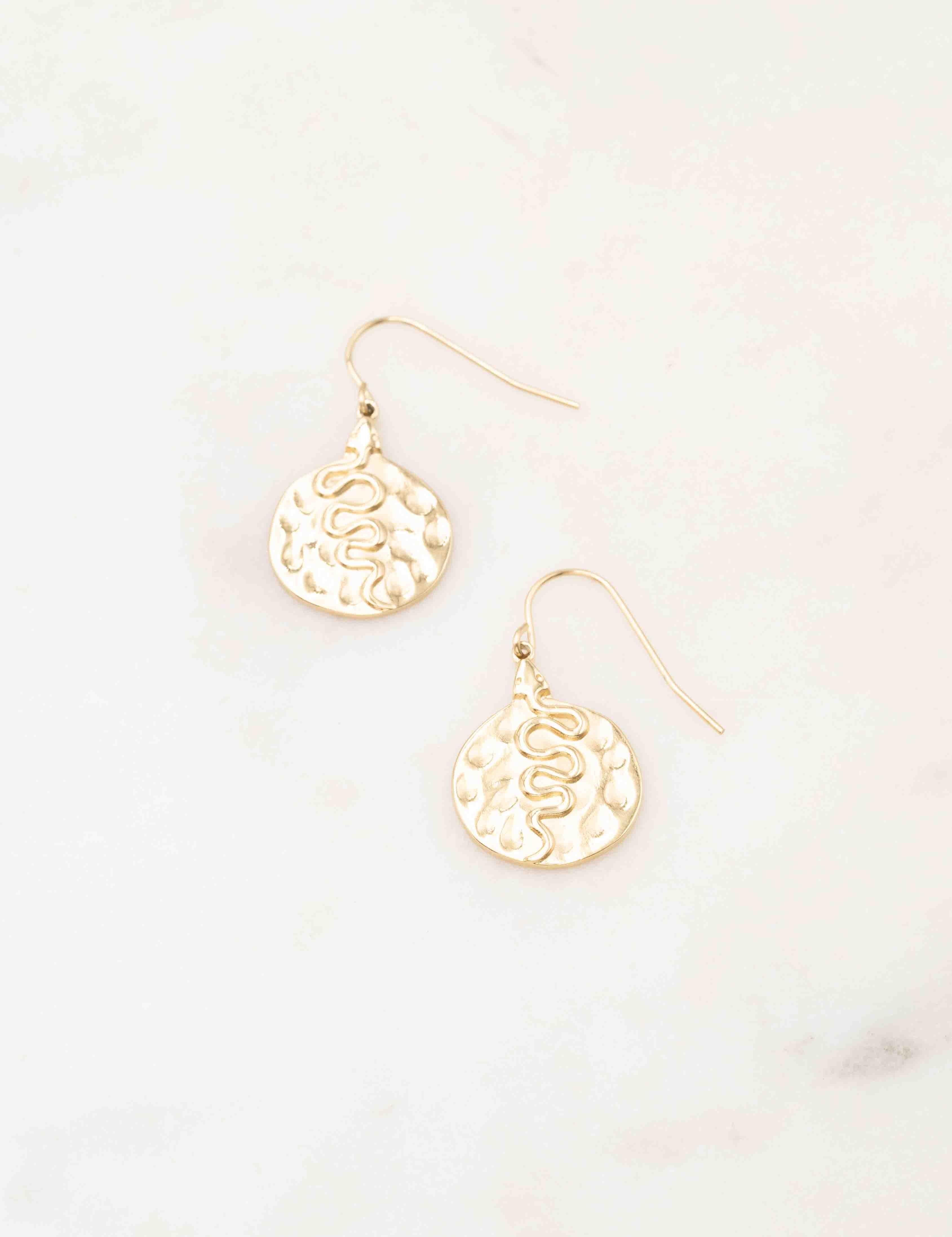 Boucles d'oreilles à crochet composées d'une pièce martelée avec un motif de serpent gravé.