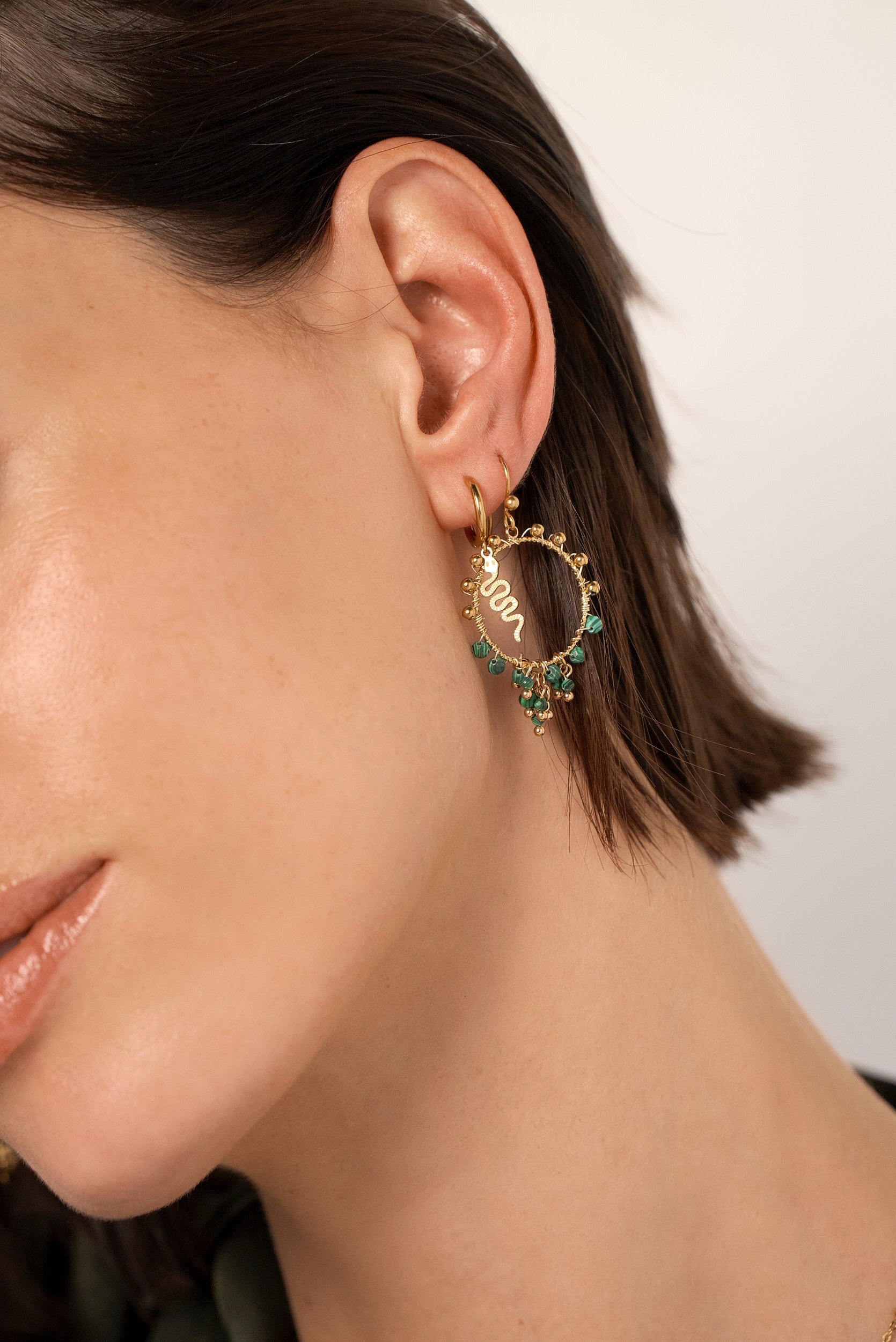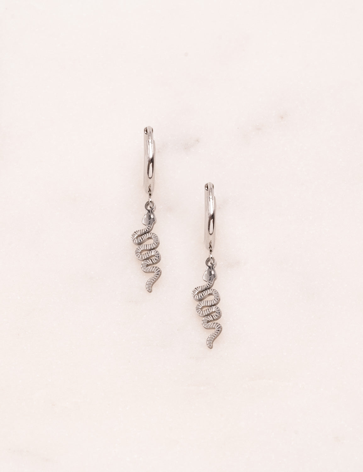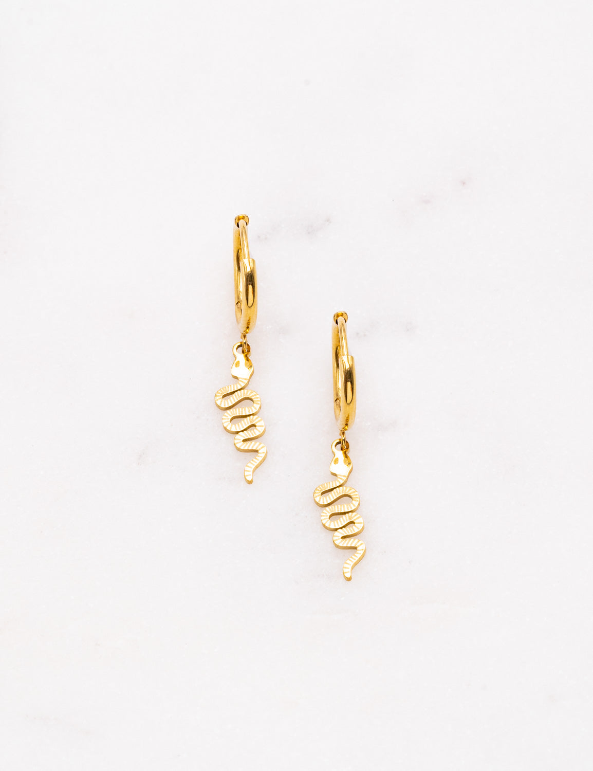 Boucles d'oreilles de type créoles composées d'une pampille en forme de serpent. Fermoir charnière.