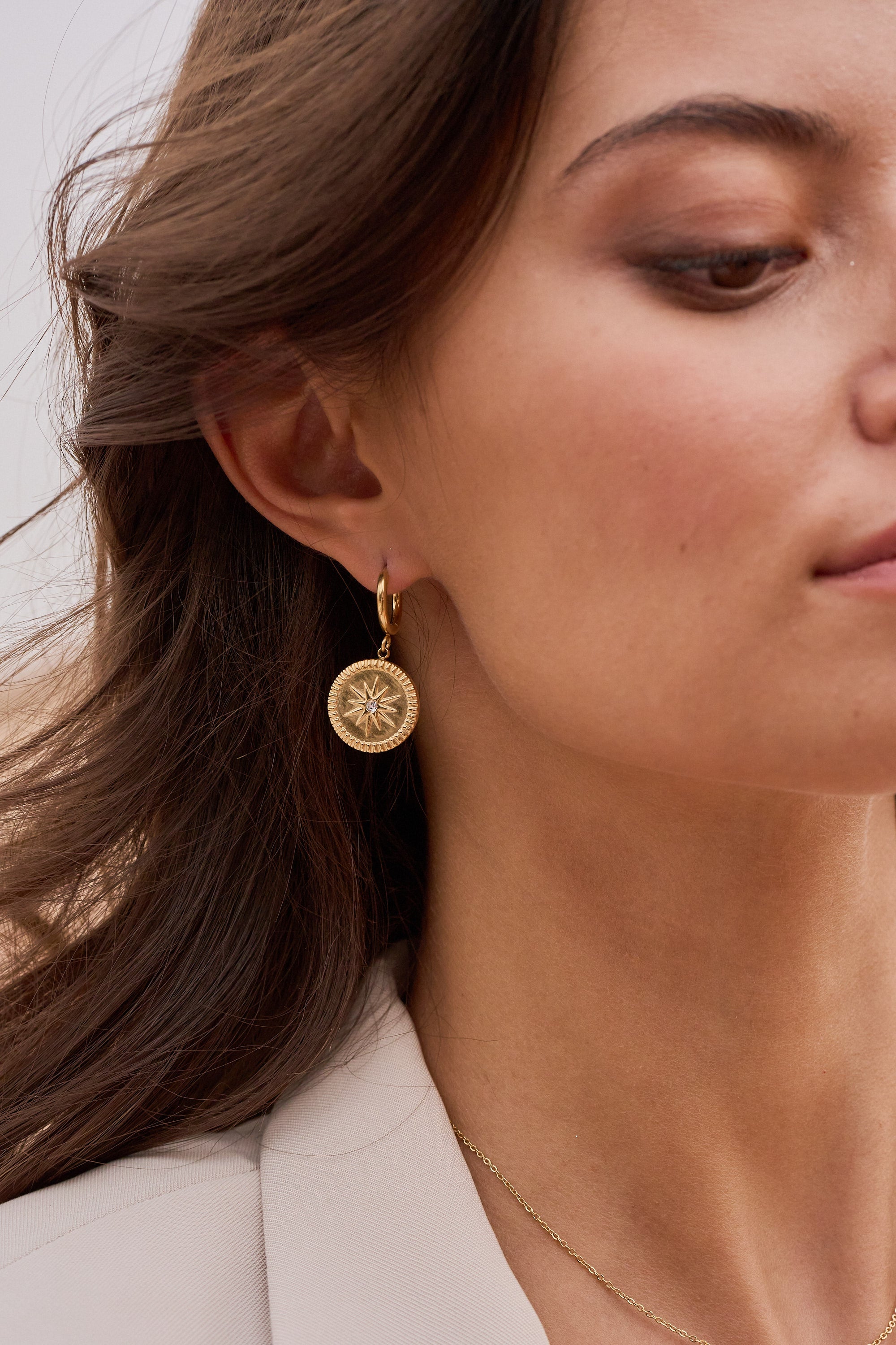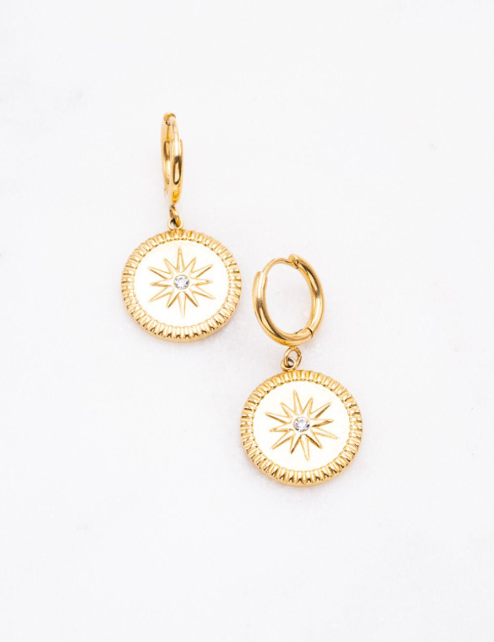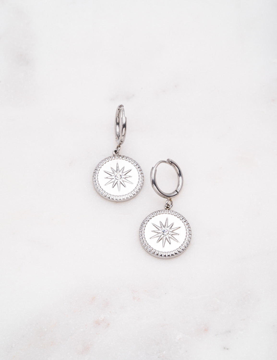 Boucles d'oreilles type créoles composées d'un pendant graphique avec un motif étoilé serti d'un strass. Fermoir charnière.