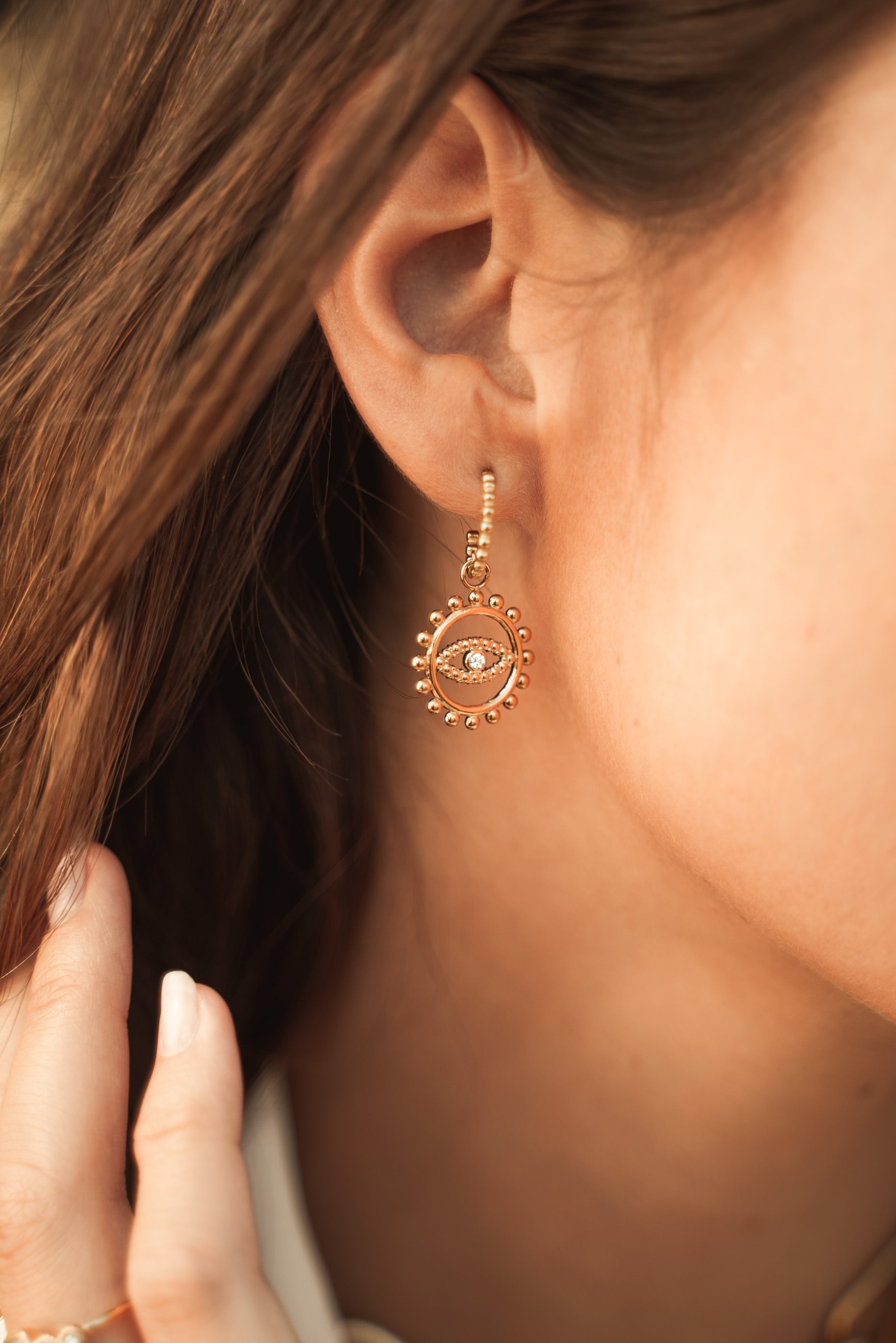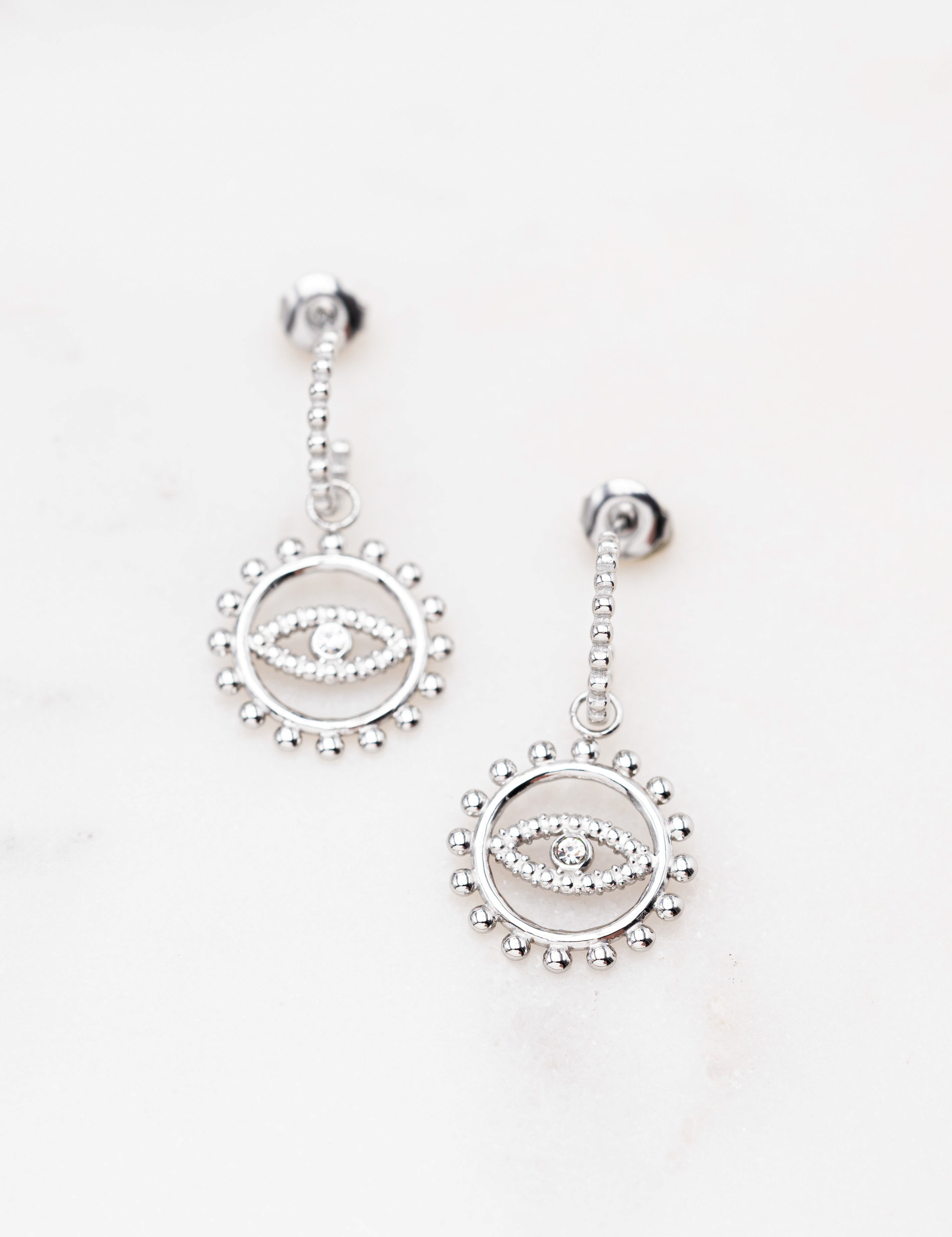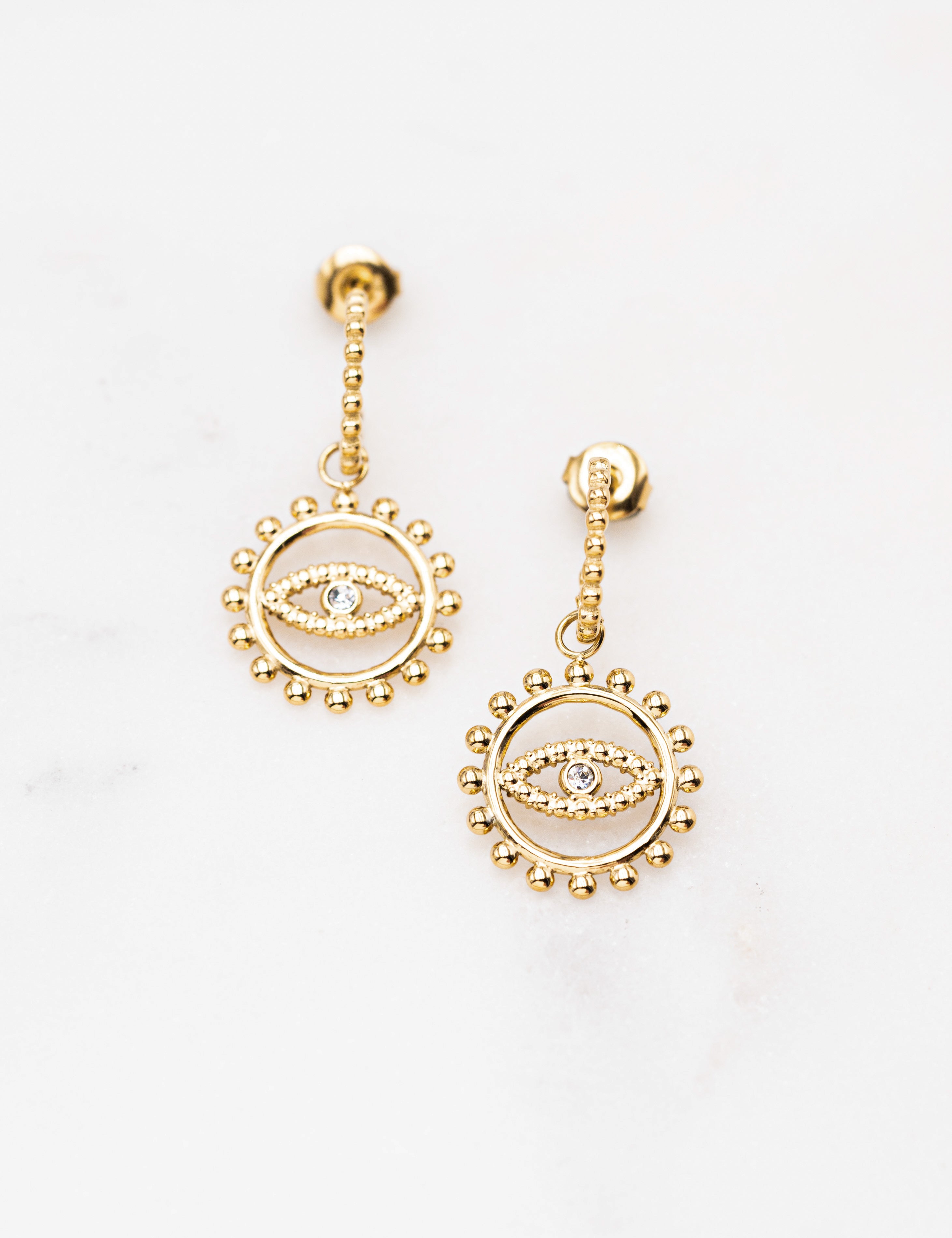 Boucles d'oreilles type créoles effet cannelé à puce avec un pendant ajouré, texturé avec un motif "oeil" serti d'un strass .