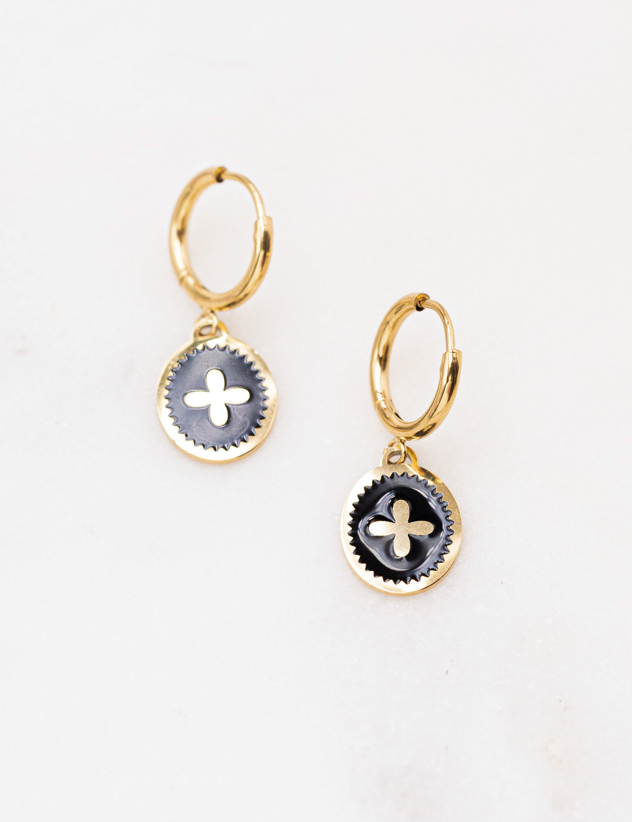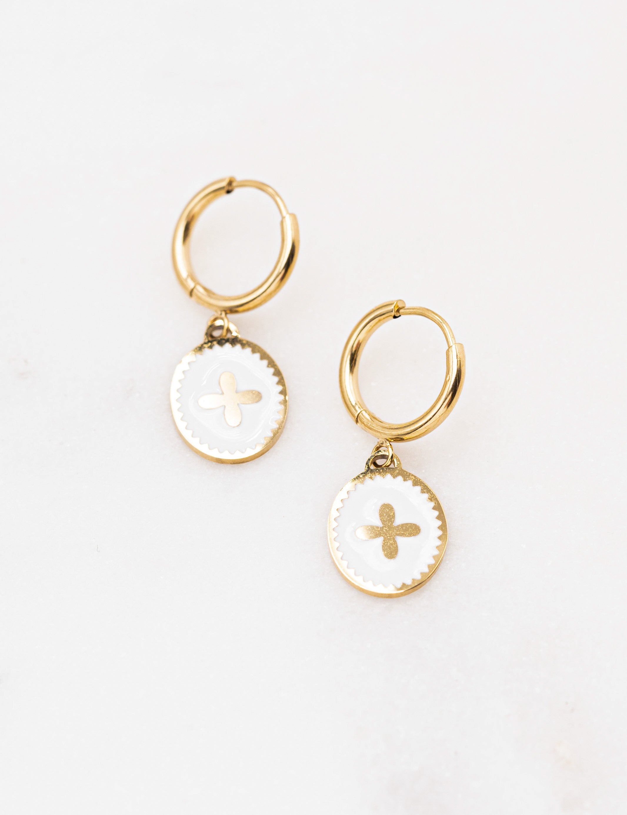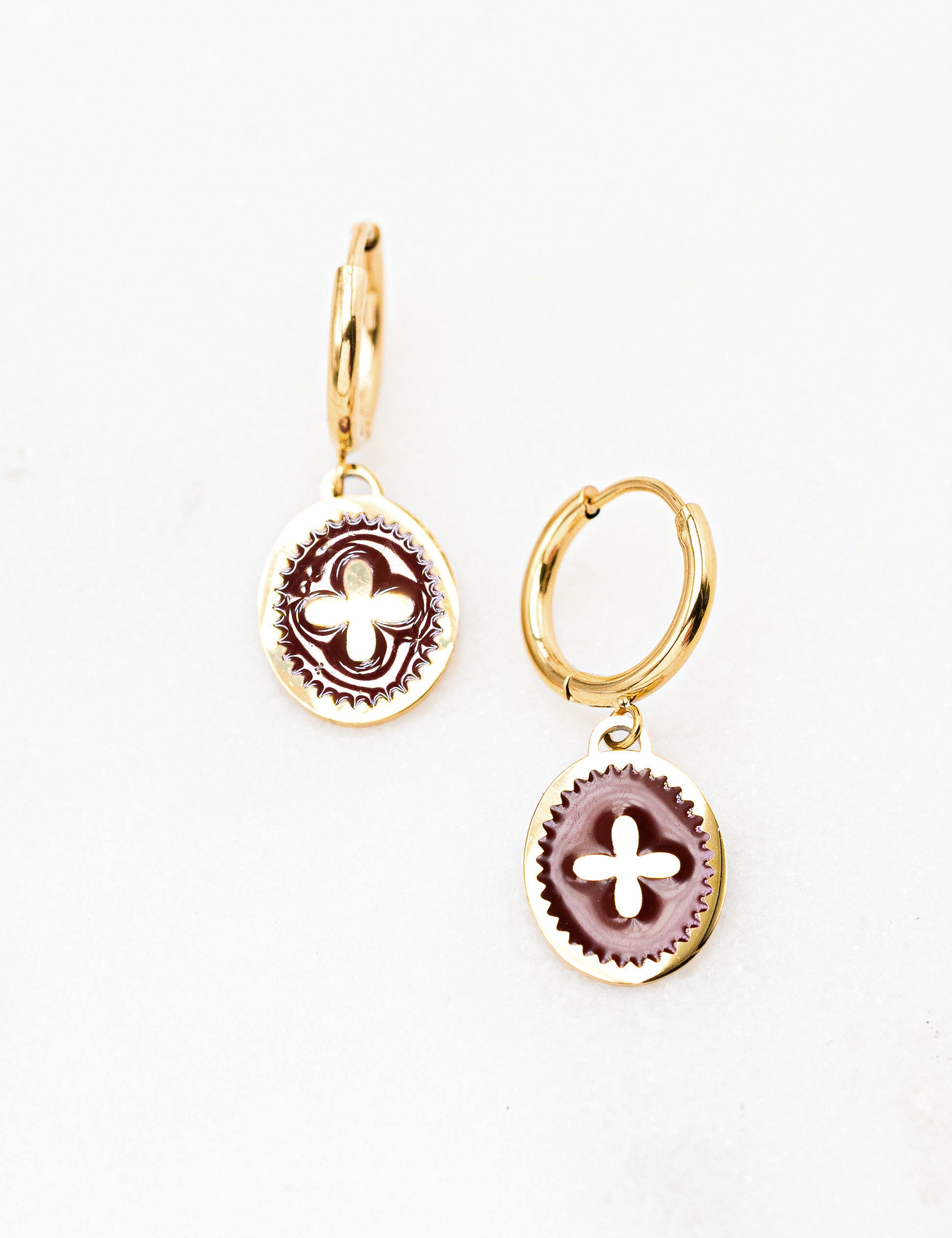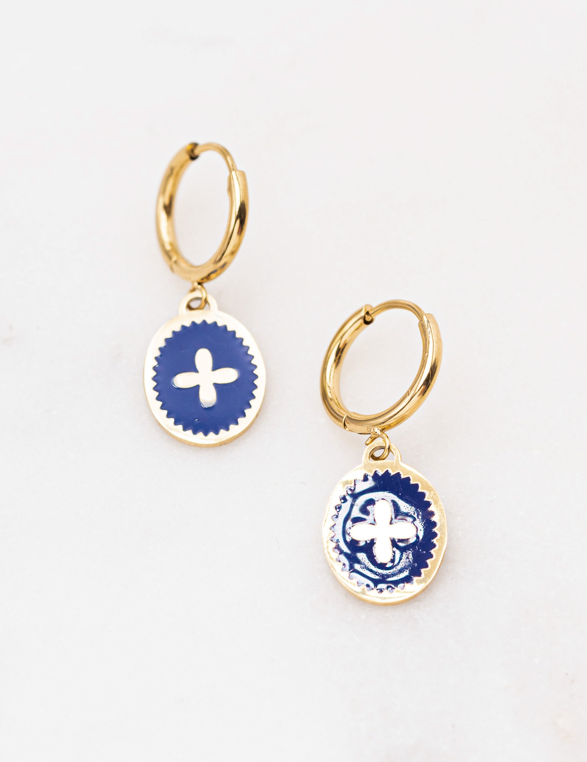 Boucles d'oreilles type créoles avec une pampille émaillée colorée et motif croix au centre. Fermoir charnière.
