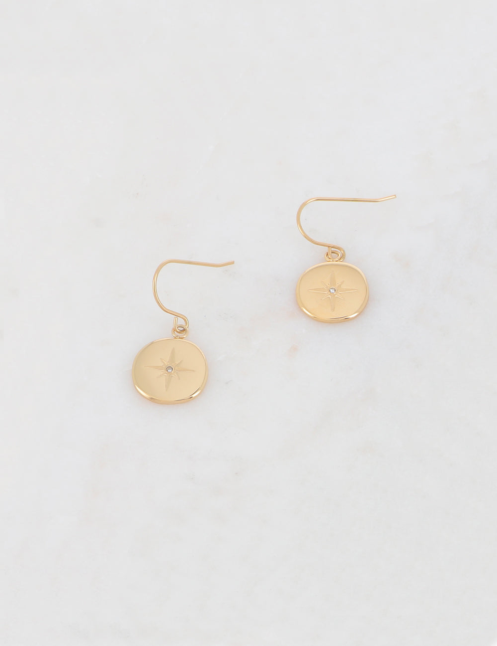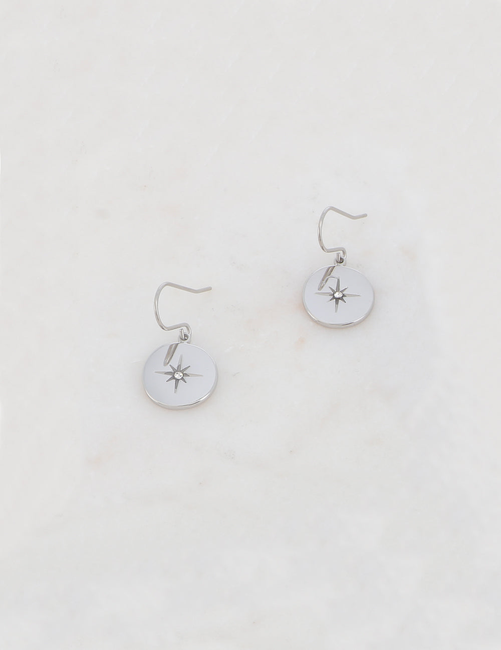 Boucles d'oreilles à crochet composées d'un pendant gravé d'un motif étoilé et serti d'un petit strass (oxyde de zirconium).