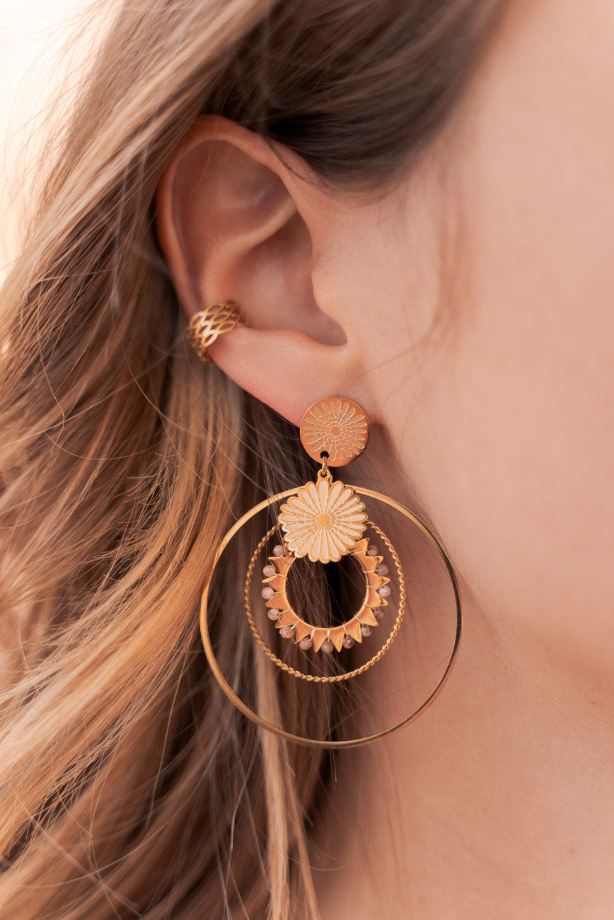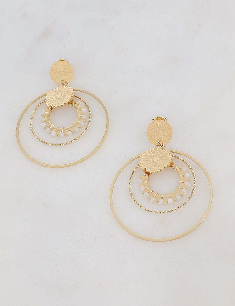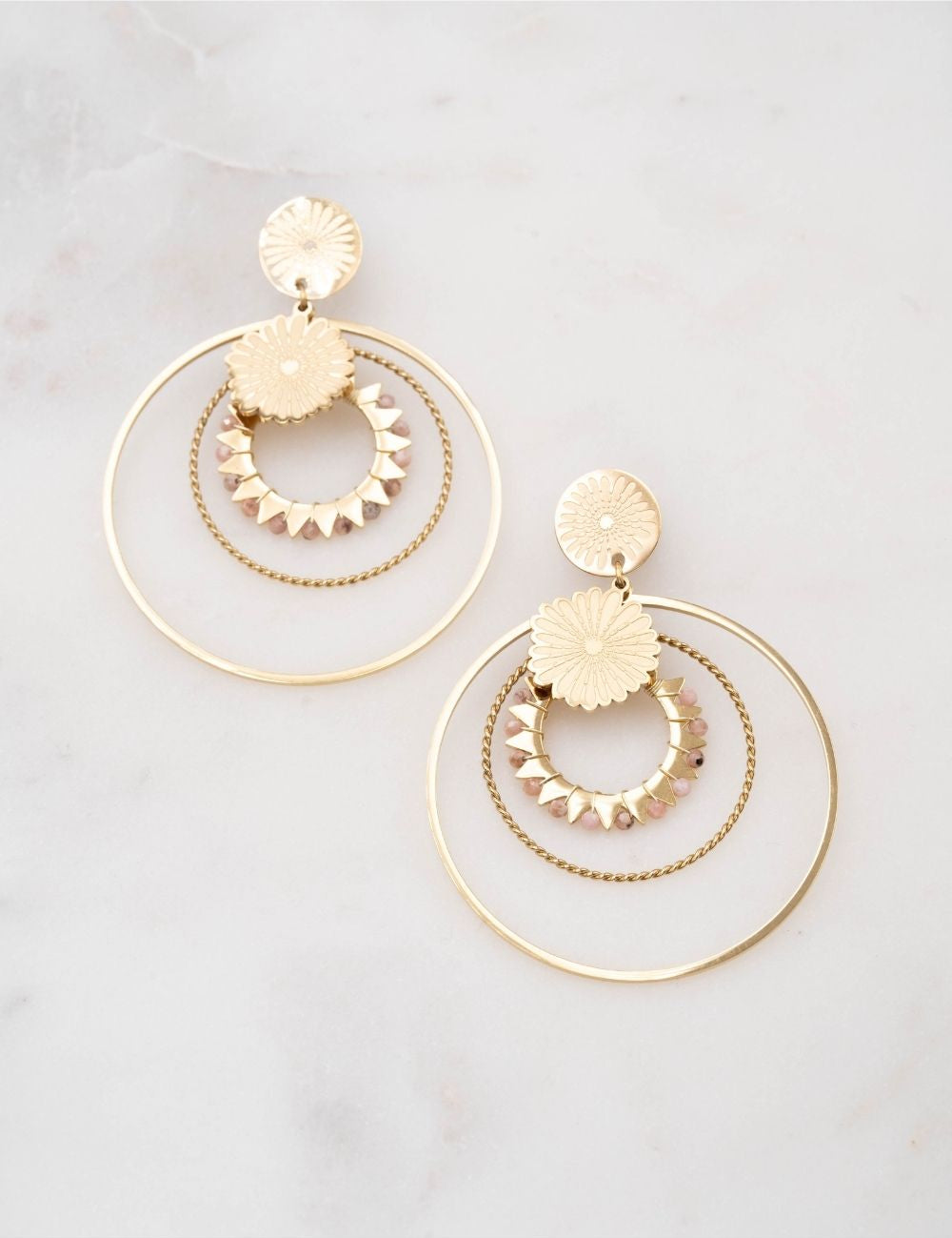 Boucles d'oreilles à puce composées de multi anneaux et serties de perles en pierre naturelle. Fermoir papillon.