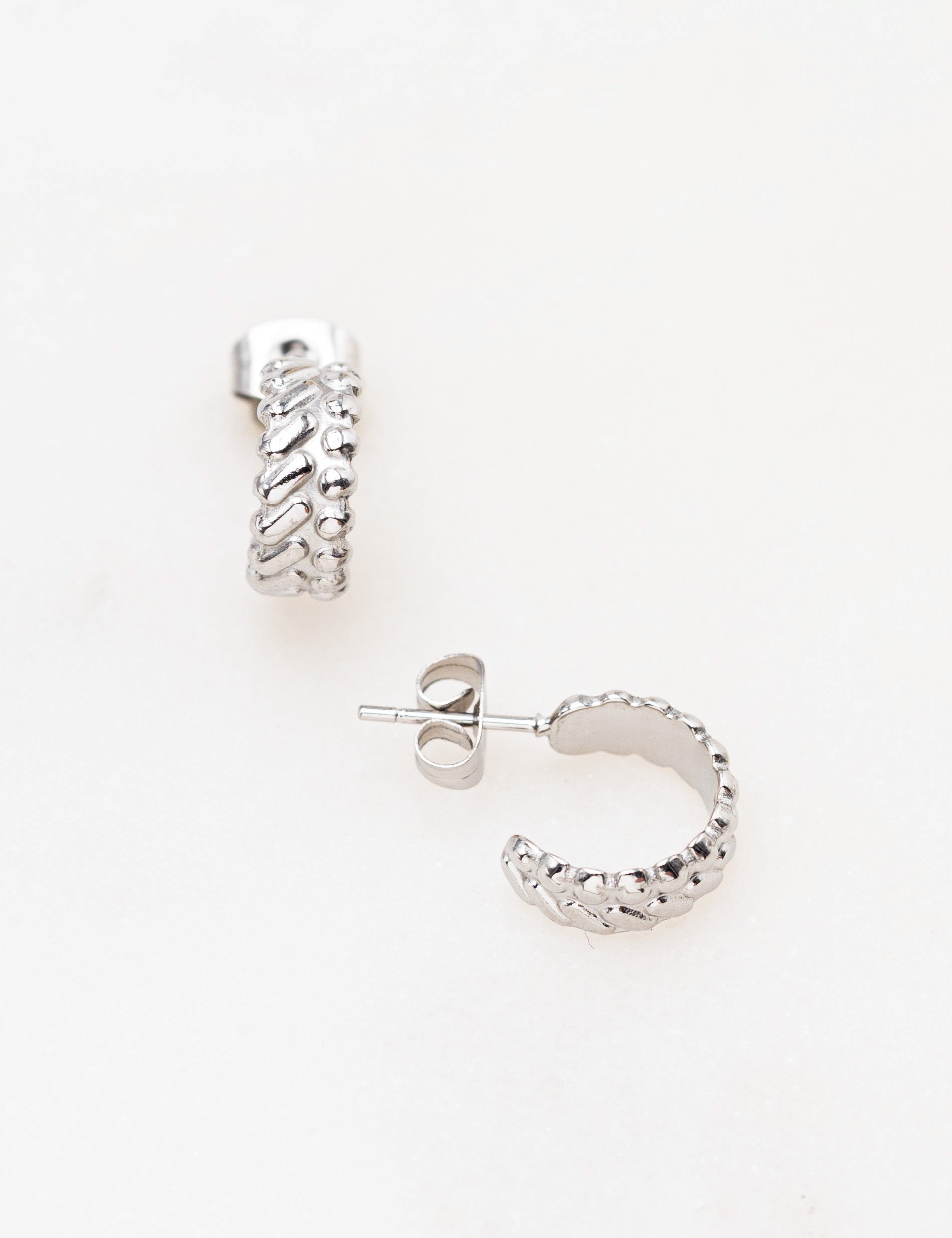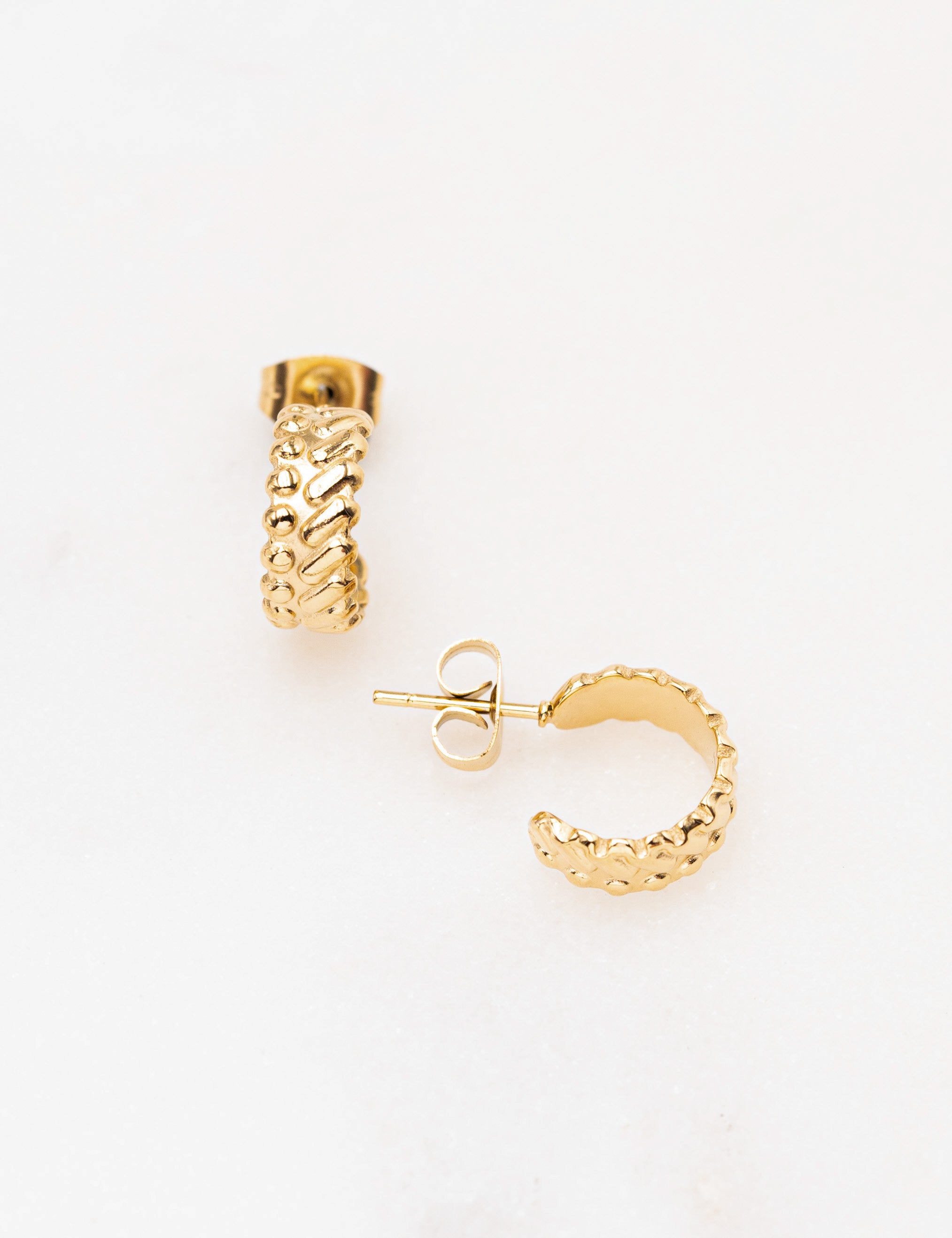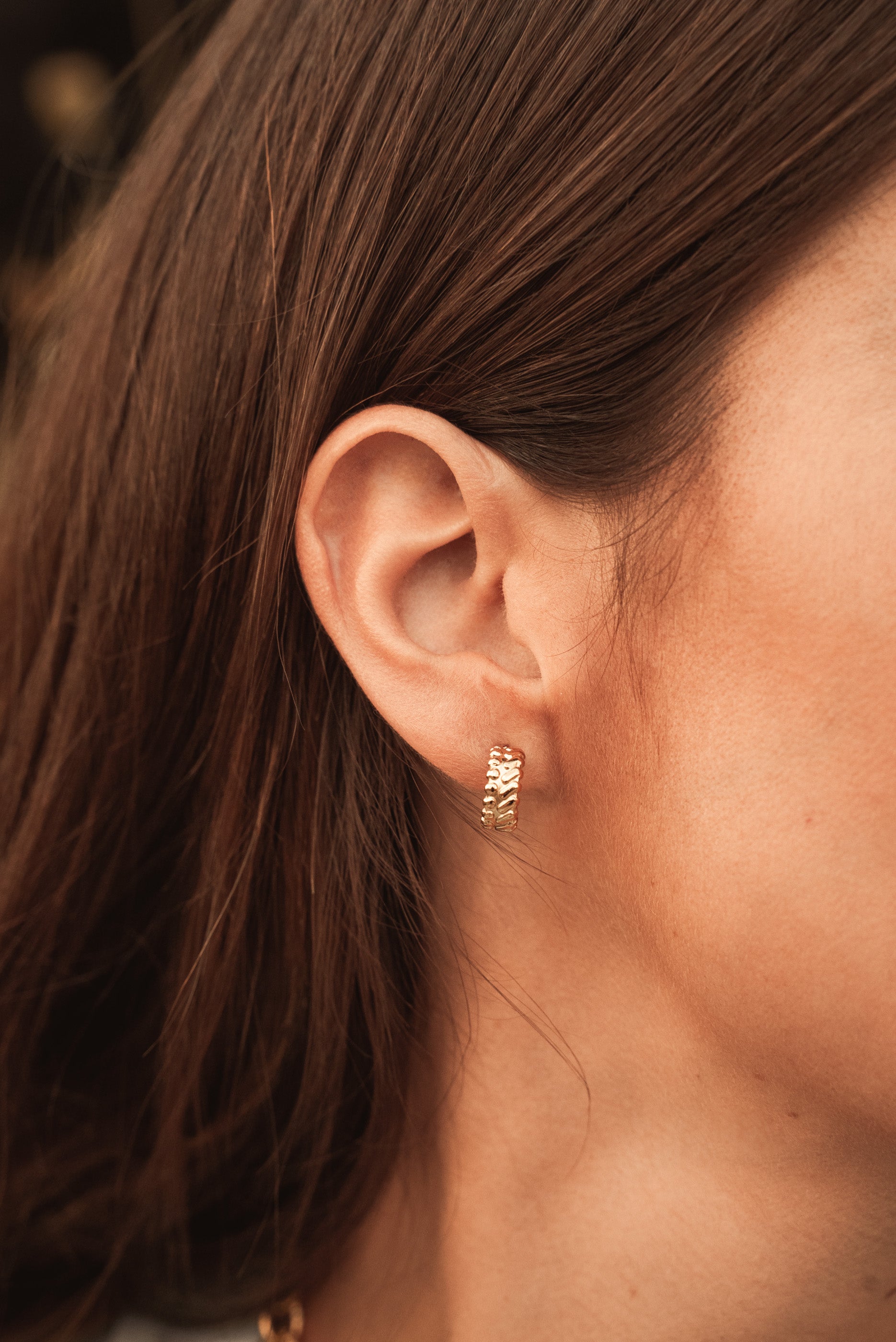 Boucles d'oreilles type créoles à puce avec des motifs graphiques. Fermoir papillon. Disponibles en doré et argenté.