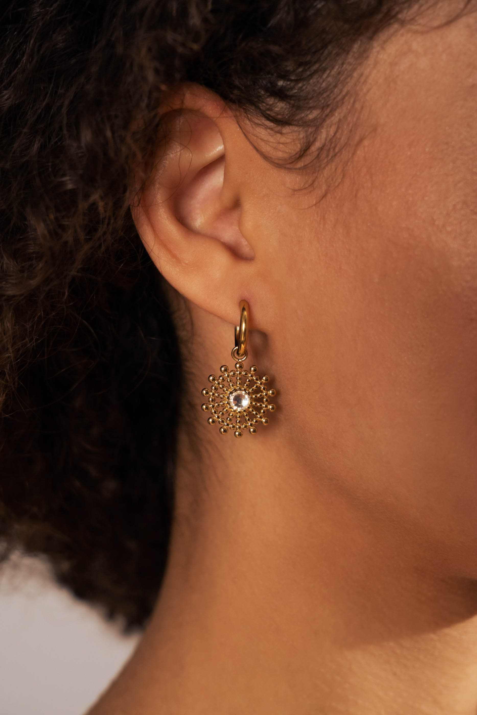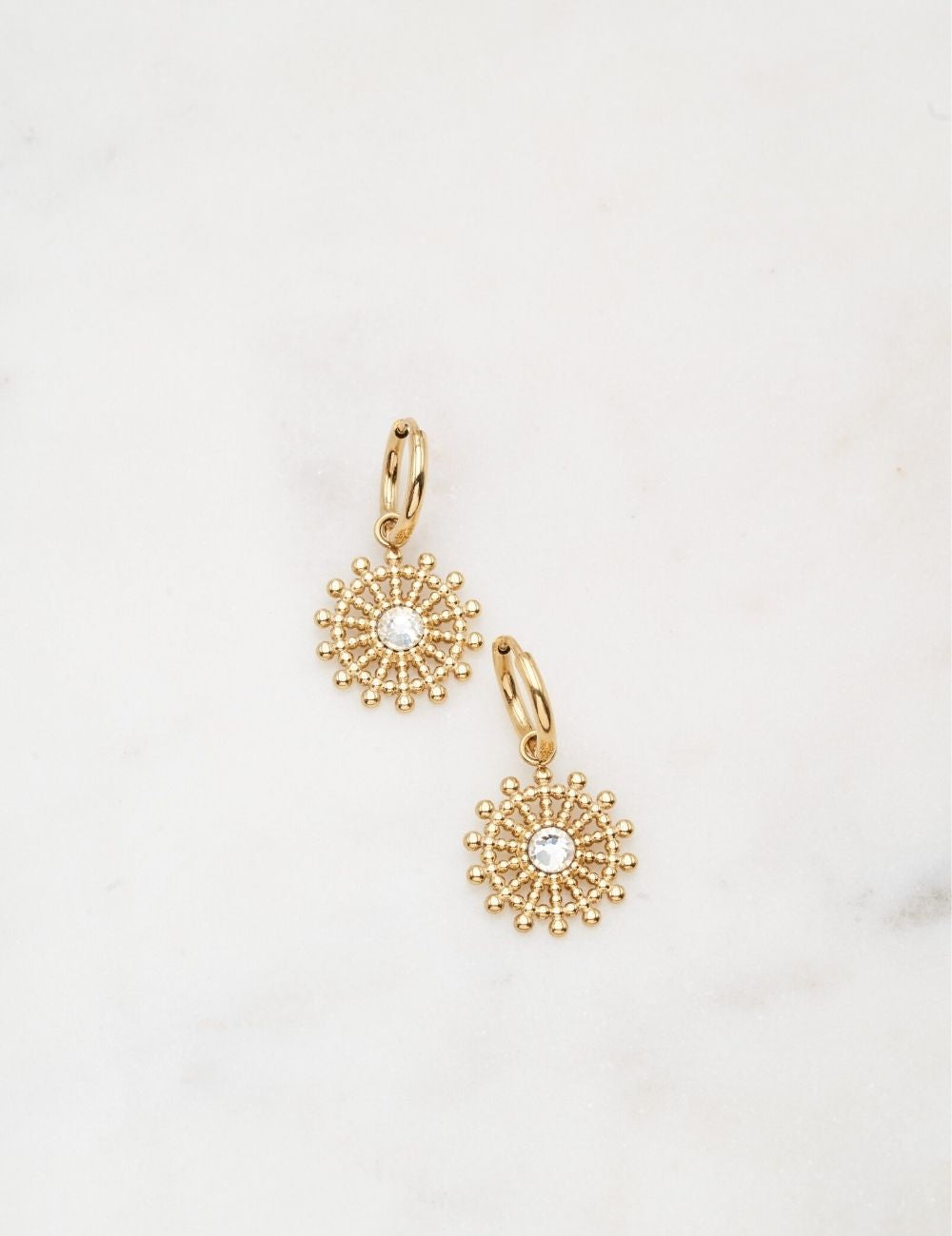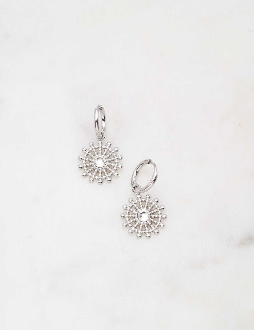 Boucles d'oreilles type créoles composées d'une pièce graphique ronde ajourée ornée d'un strass. Fermoir charnière.