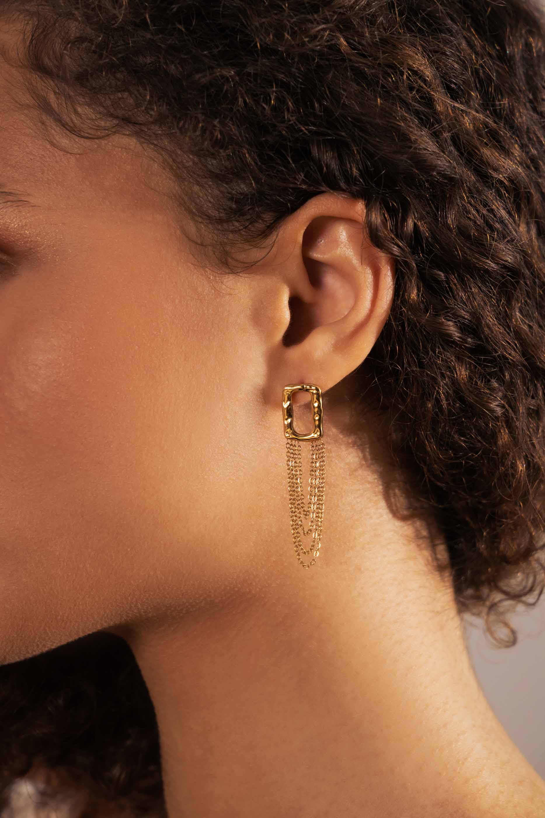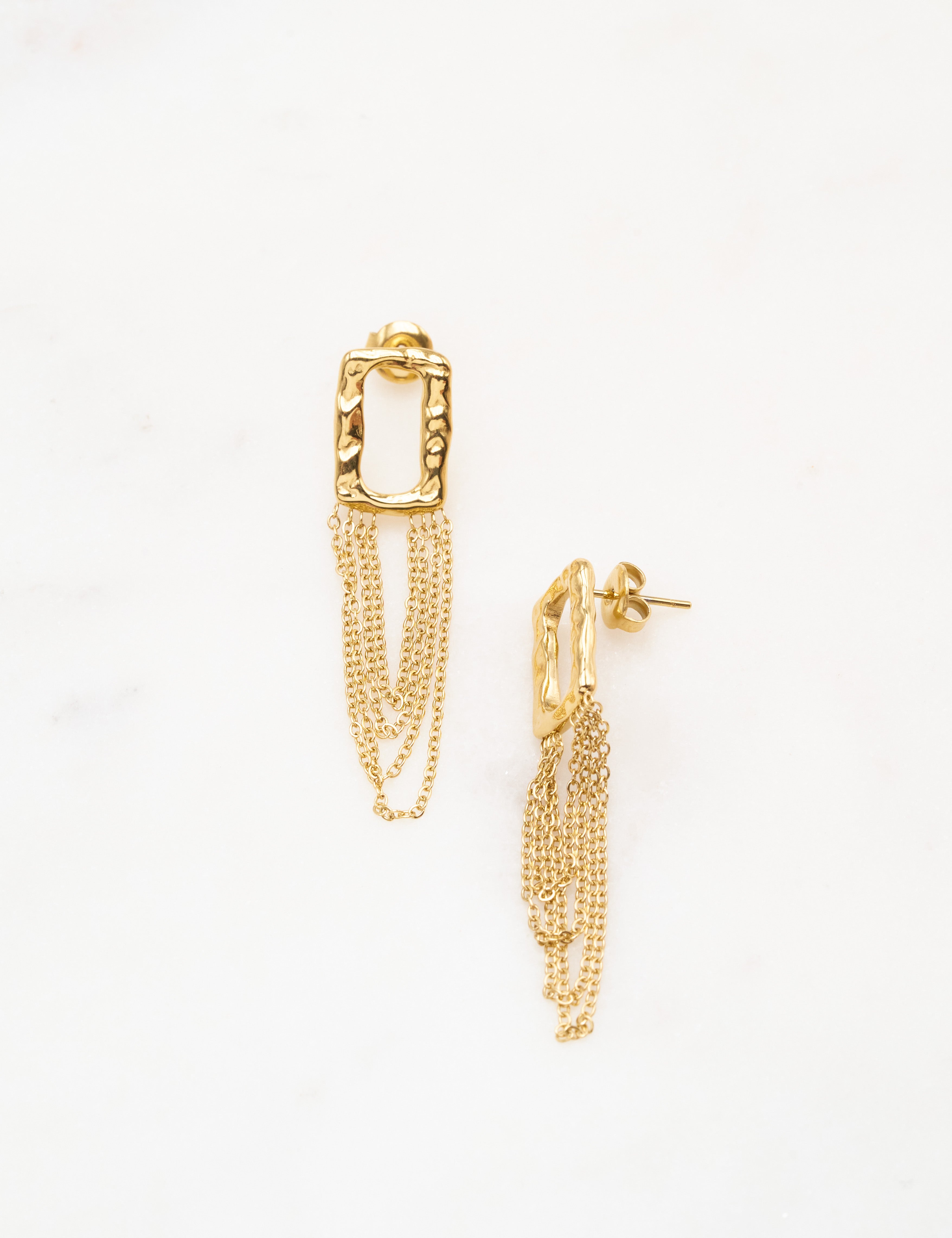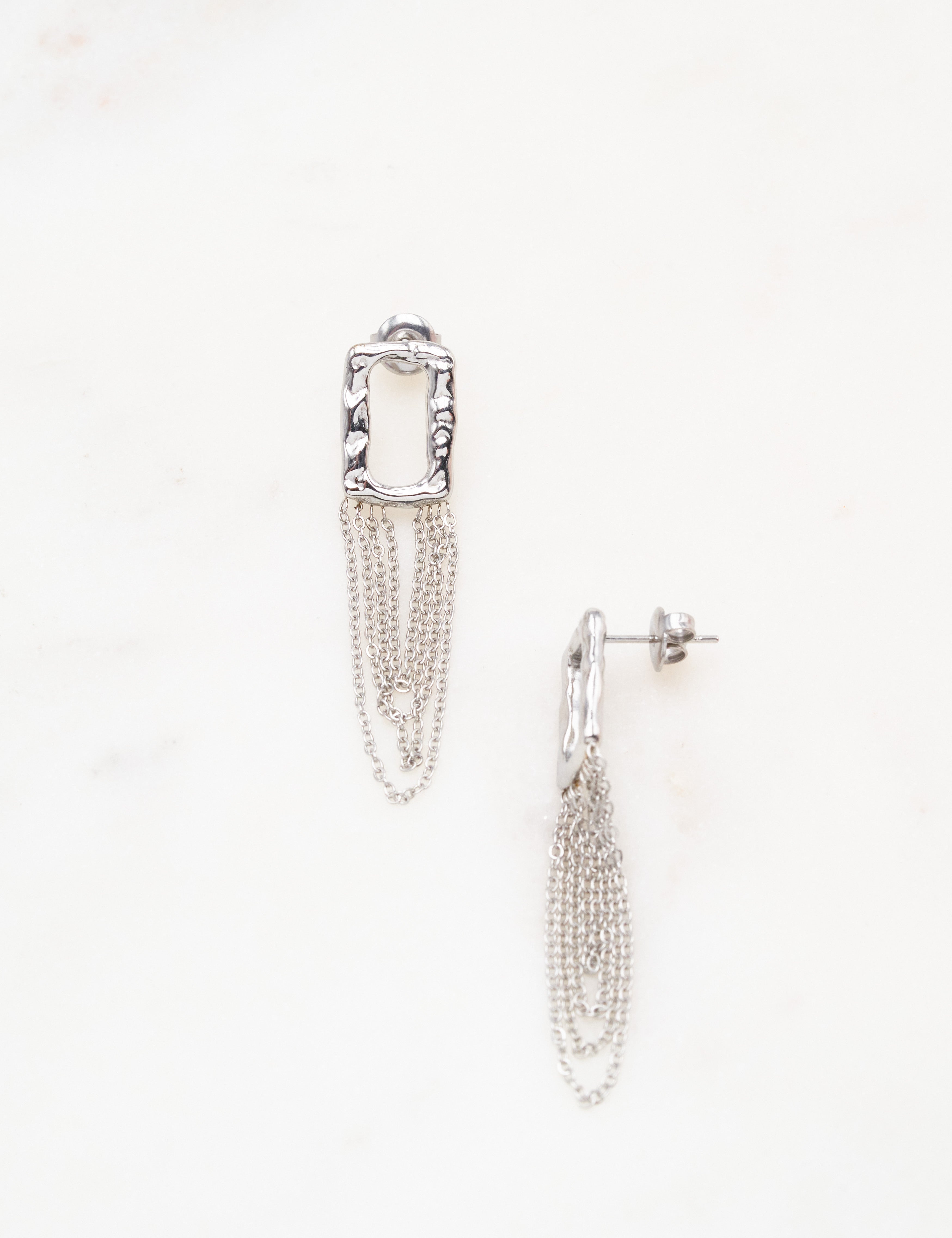 Boucles d'oreilles à puce avec un pendant martelé composé d'un jeu de chaines. Fermoir papillon