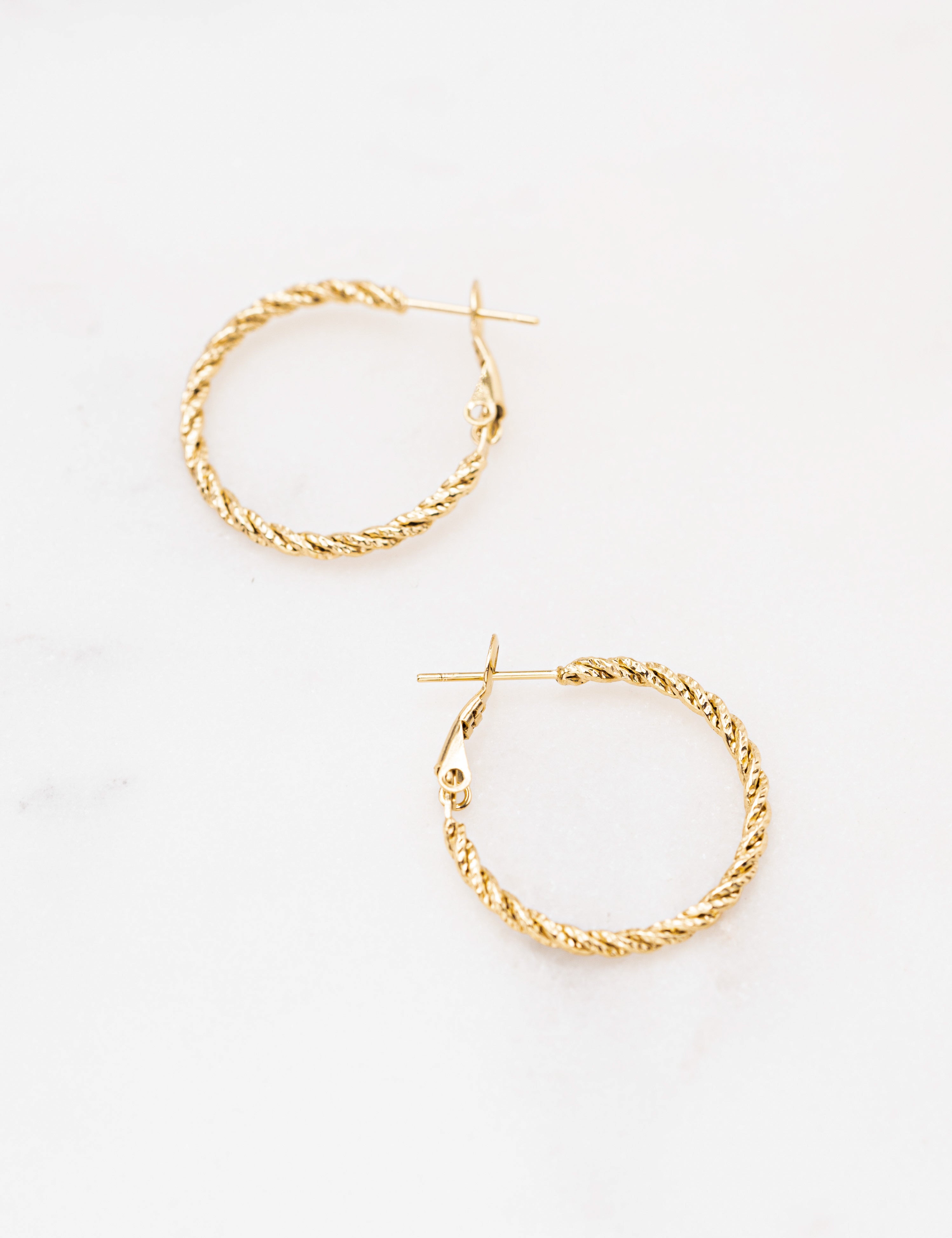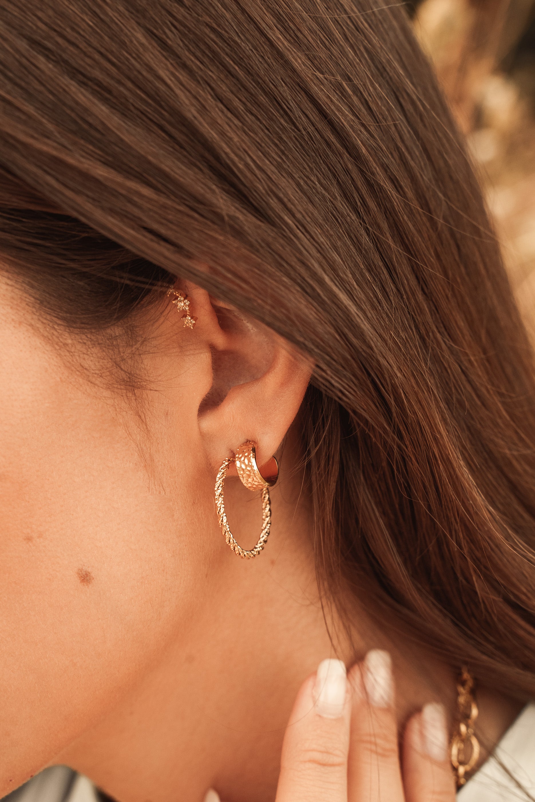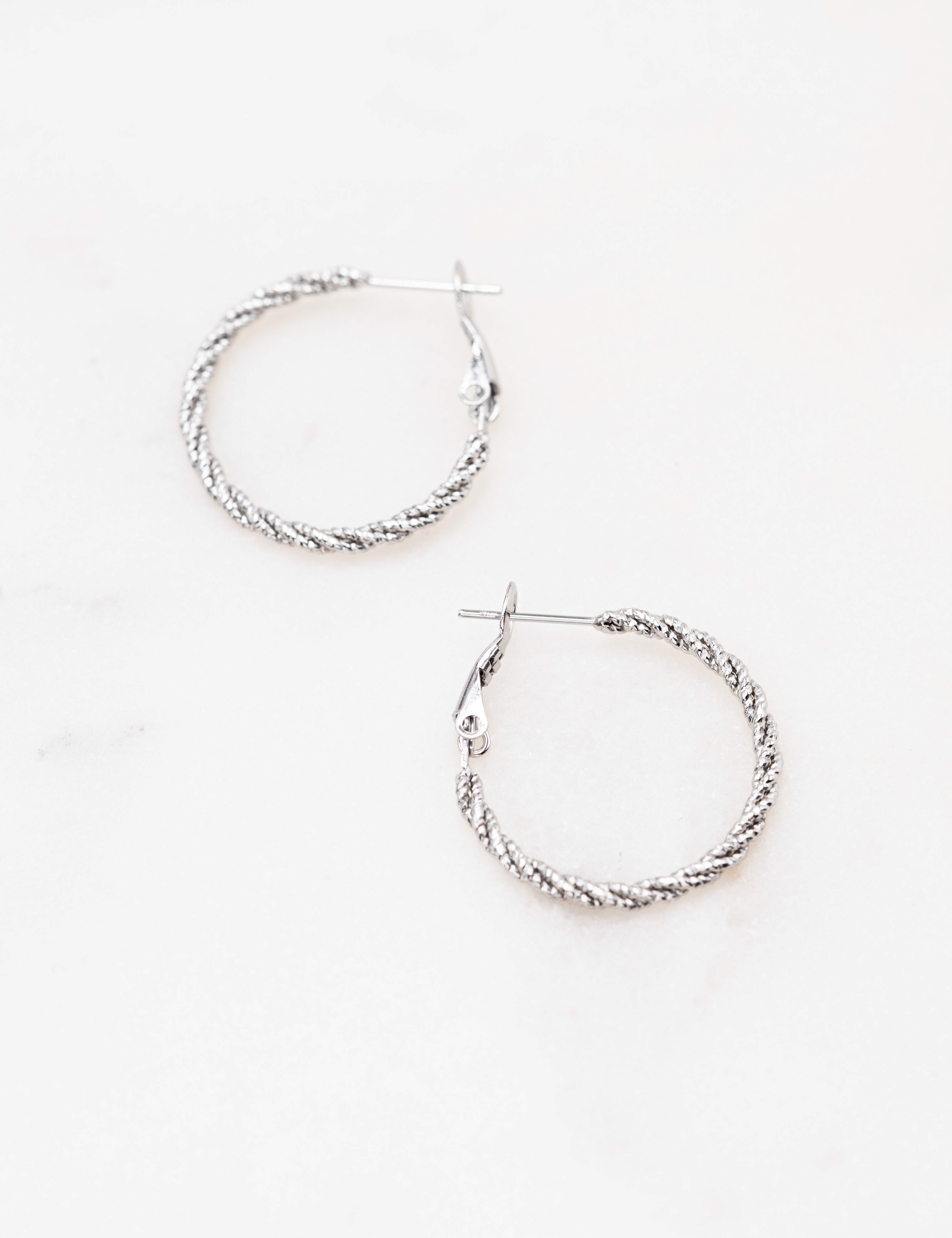 Boucles d'oreilles type créoles effet tressé. Fermoir cliquet. Disponible en plusieurs coloris : doré et argenté.
