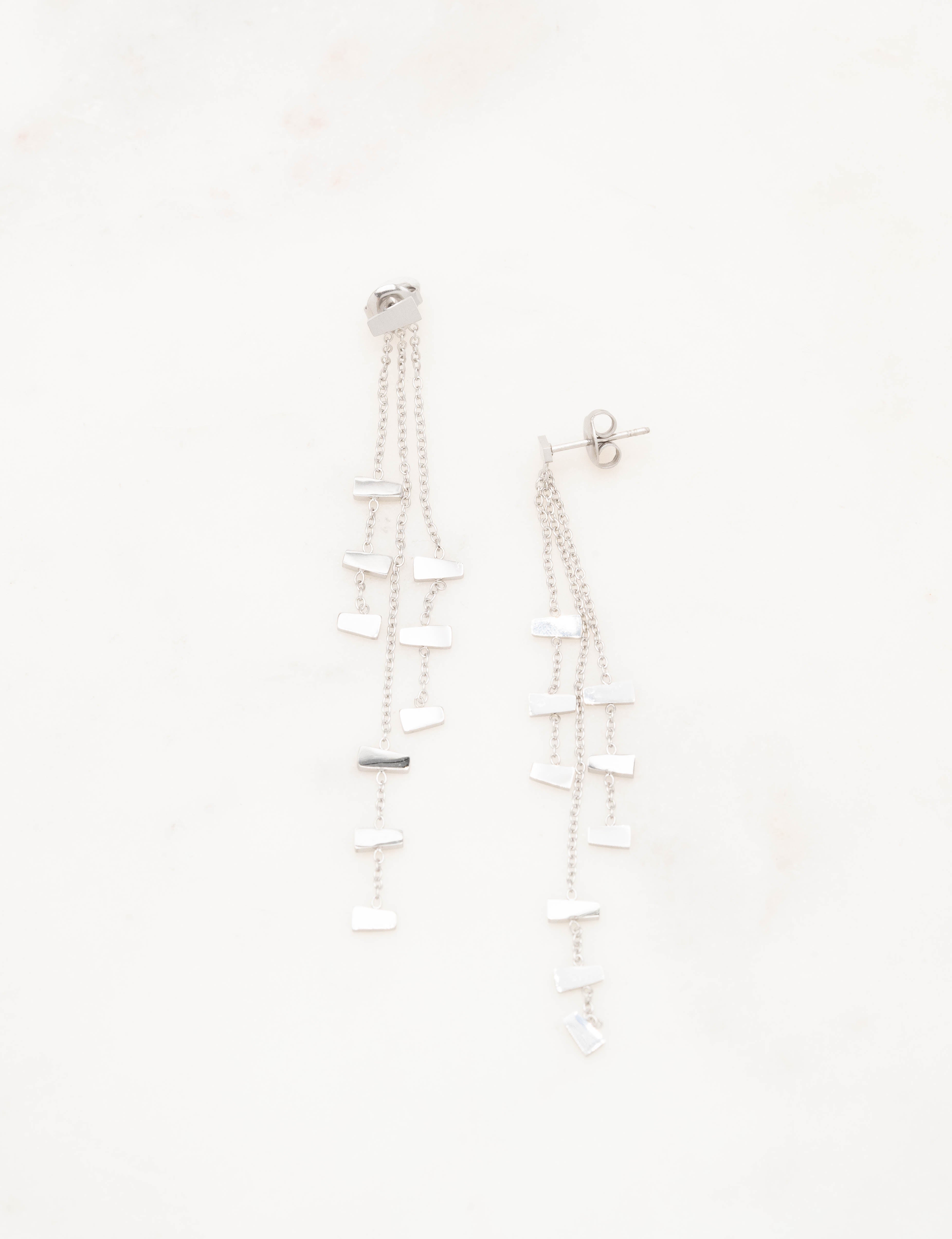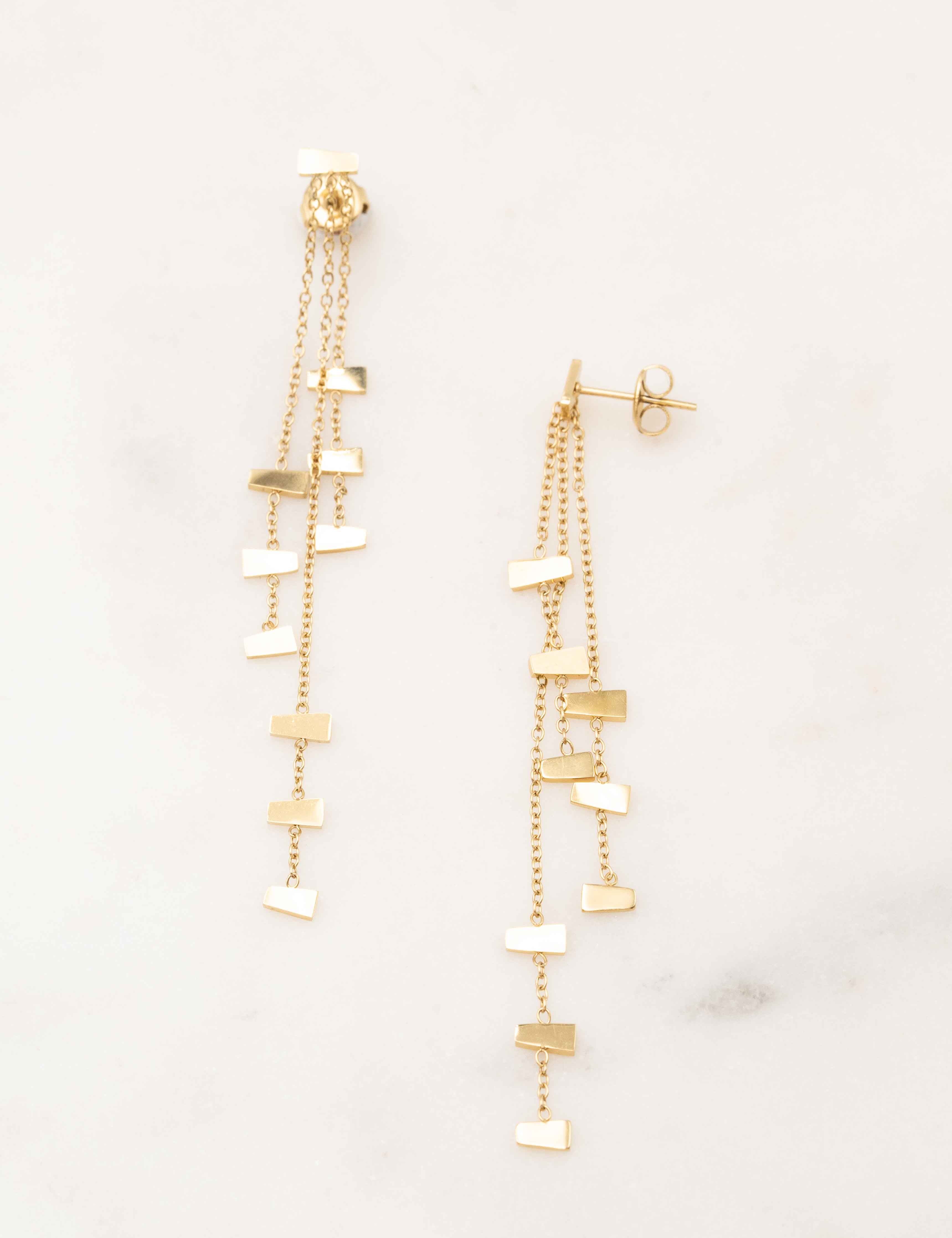Boucles d'oreilles à puce composées de chaines et de pièces graphiques. Fermoir papillon