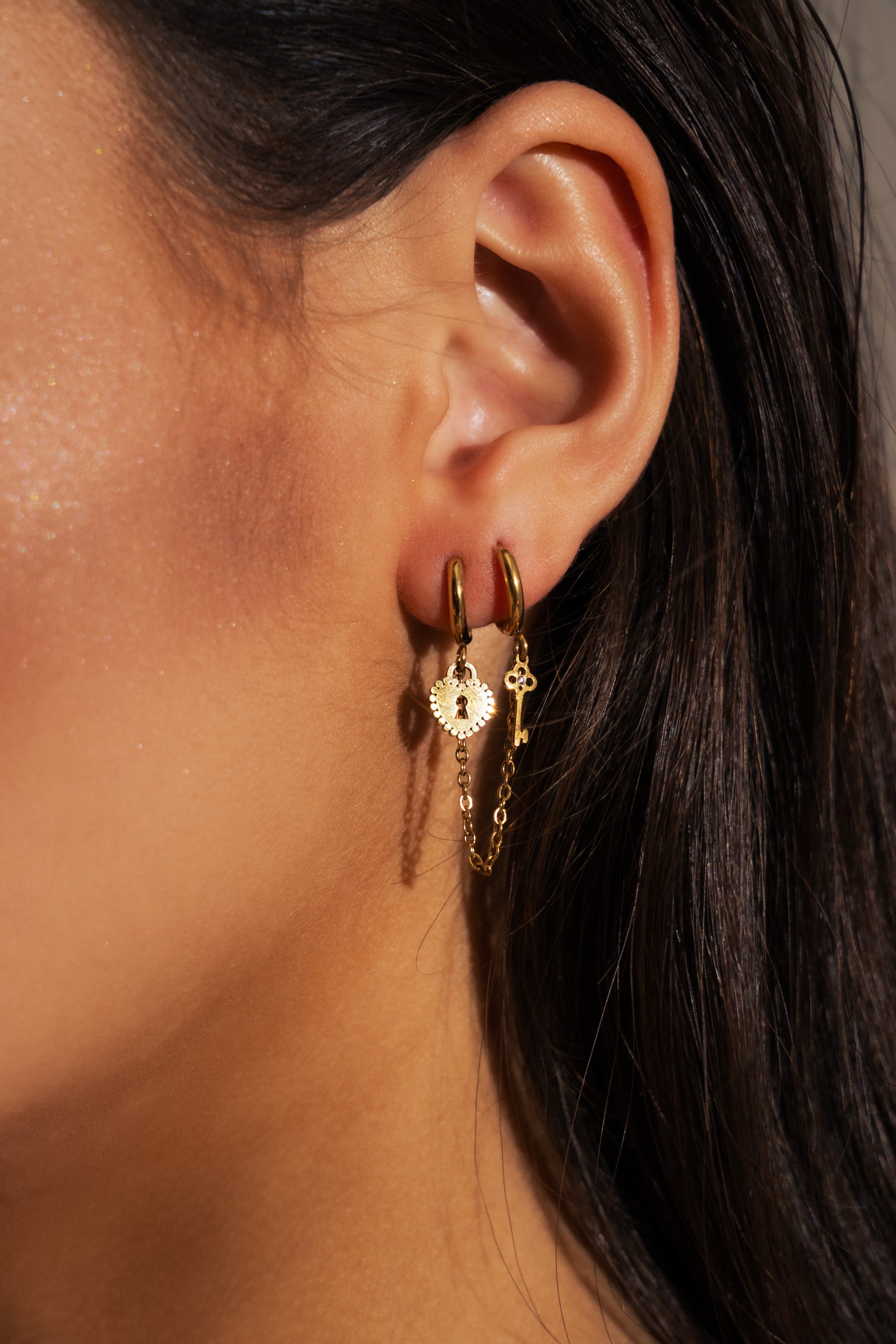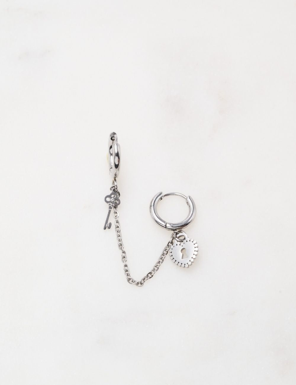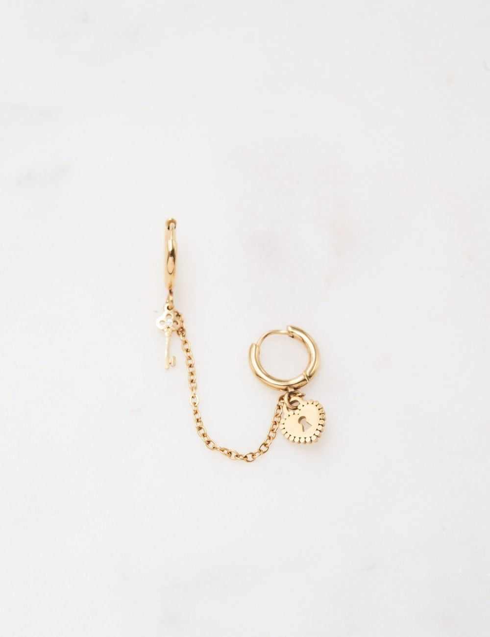 Mono boucle d'oreille type créole à fermoir charnière avec chaine , une pampille coeur et une pampille clé sertie d'un strass . Il s'agit d'une mono boucle (adaptée pour une oreille à deux trous).
