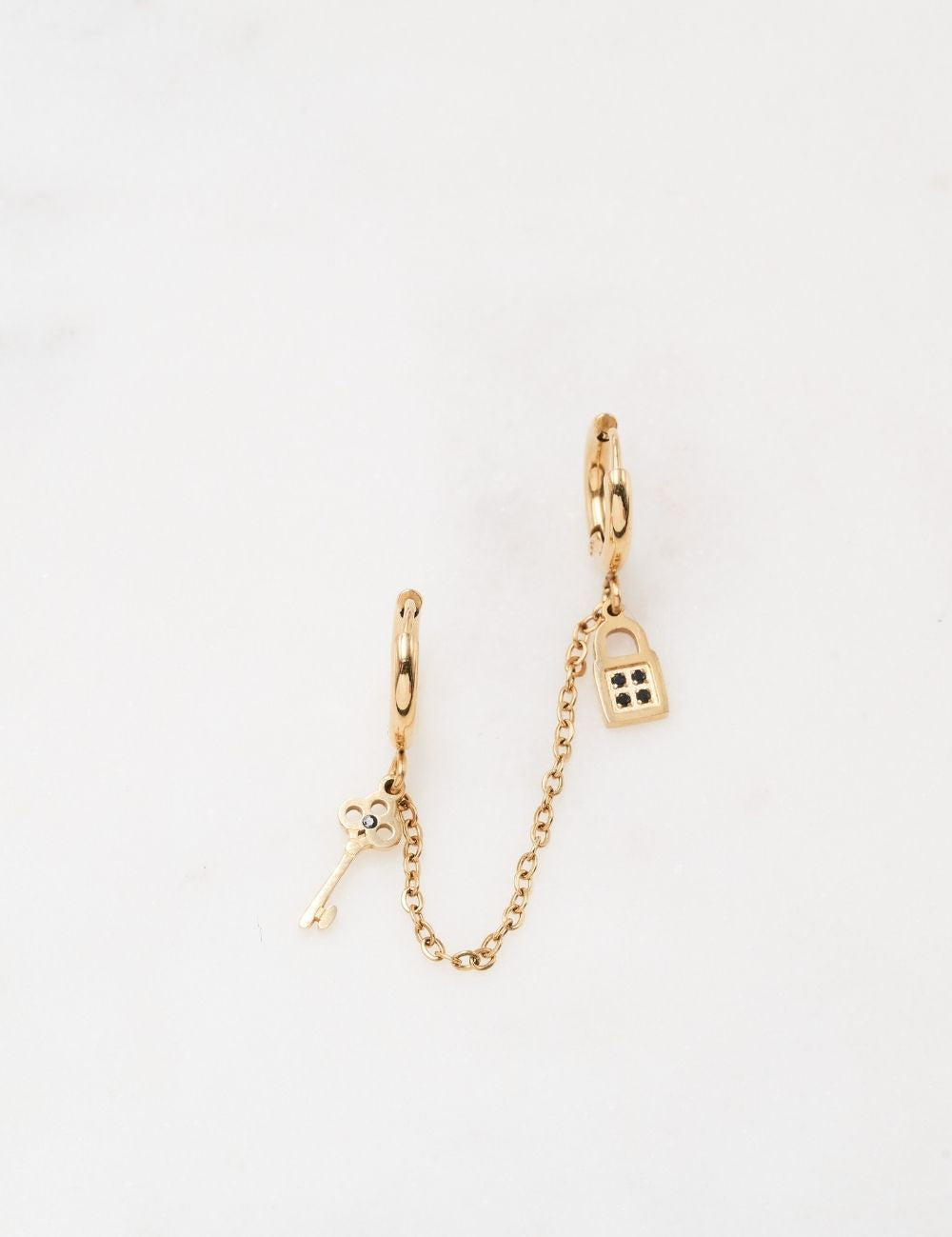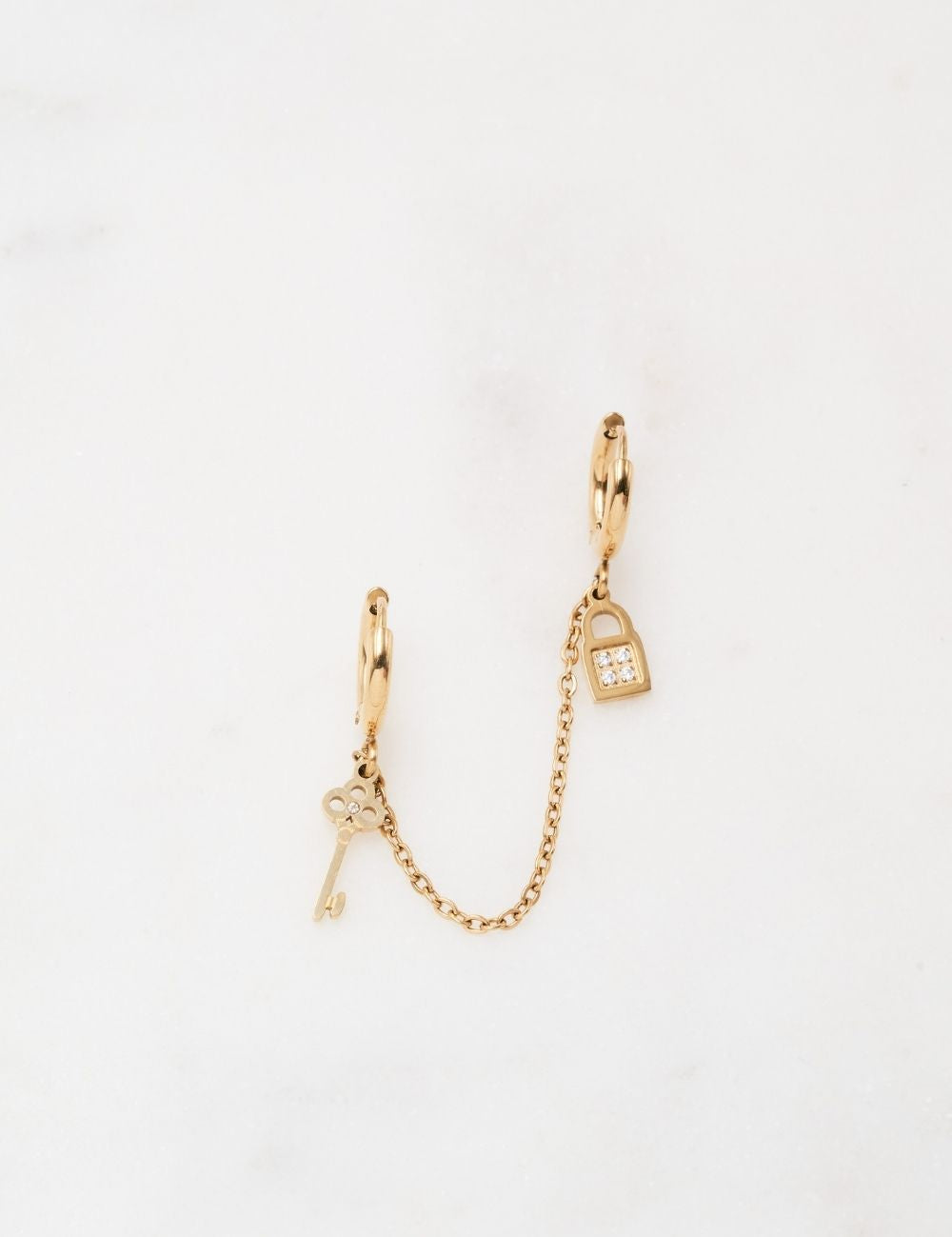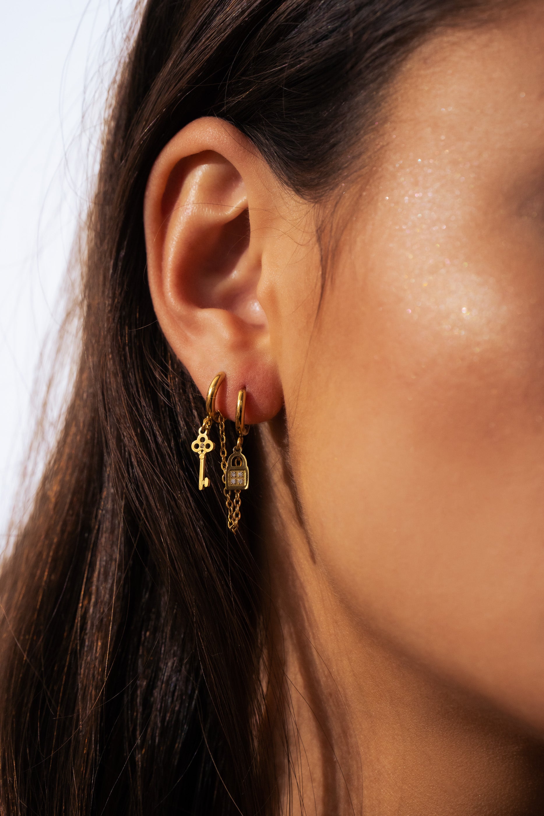 Mono boucle d'oreille type créole à fermoir charnière avec chaine, une pampille cadenas strassé et une pampille clé strassée . Il s'agit d'une mono boucle (adaptée pour une oreille à deux trous).