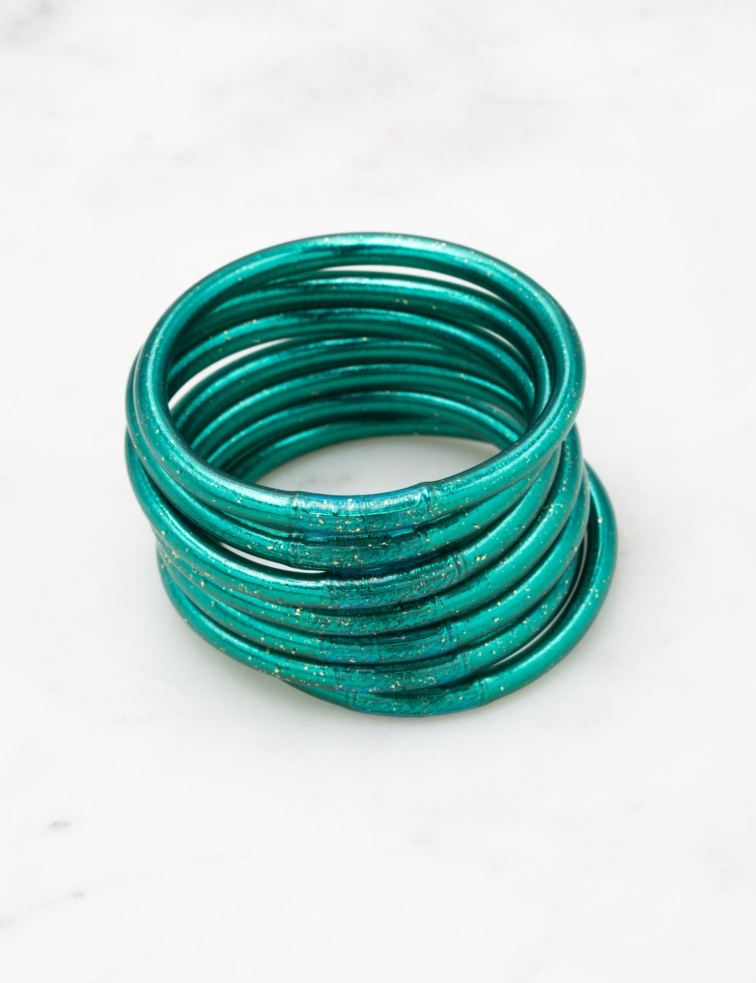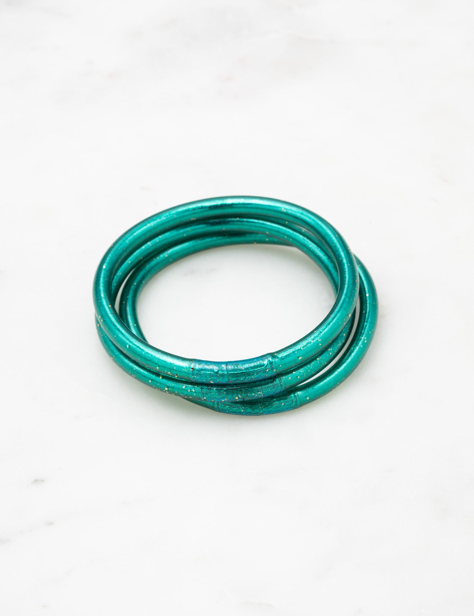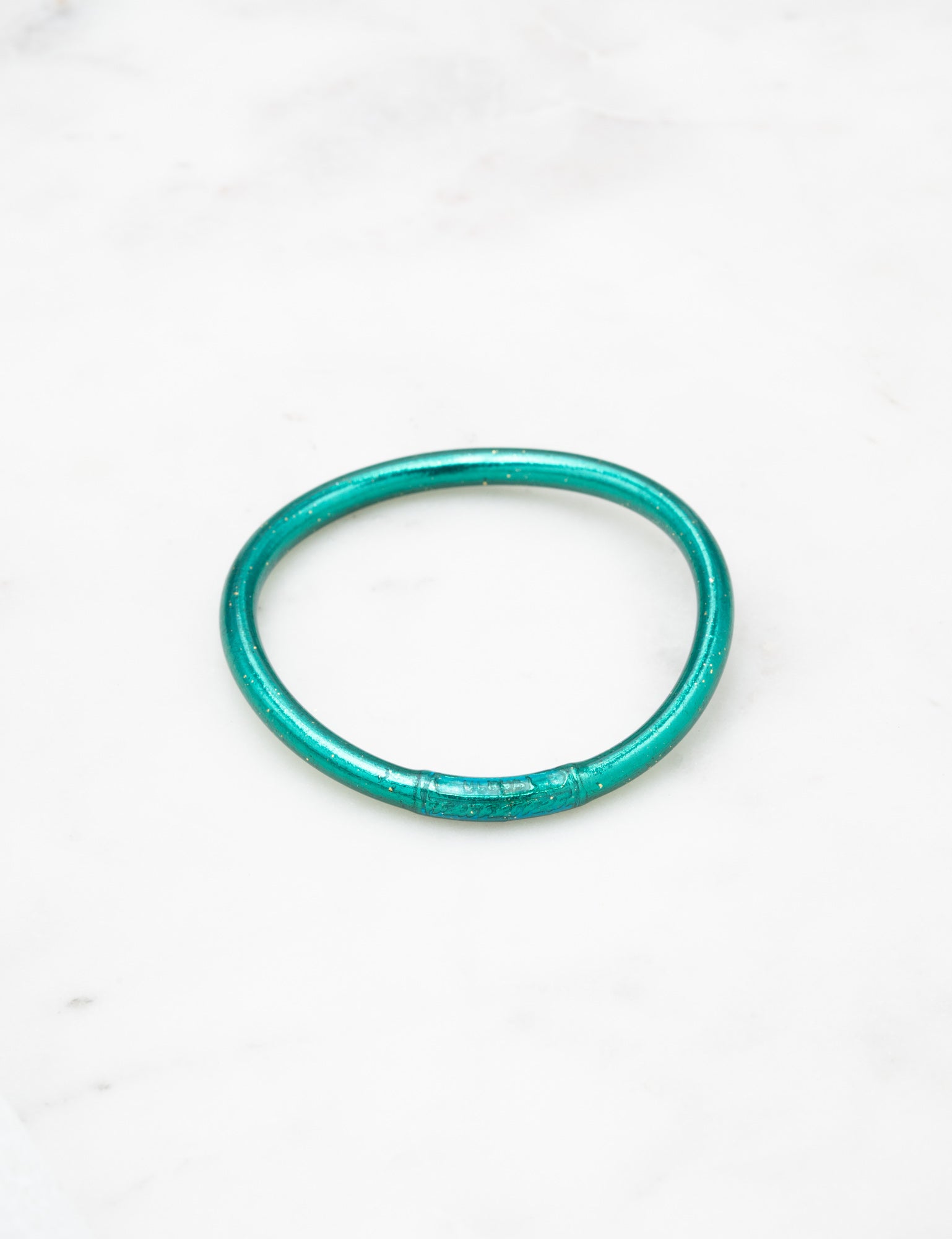 Jonc souple transparent rempli de feuilles dorées décoratives, scellé avec un mantra gravé "Bonheur, Chance, Fortune et Amour" en thaïlandais