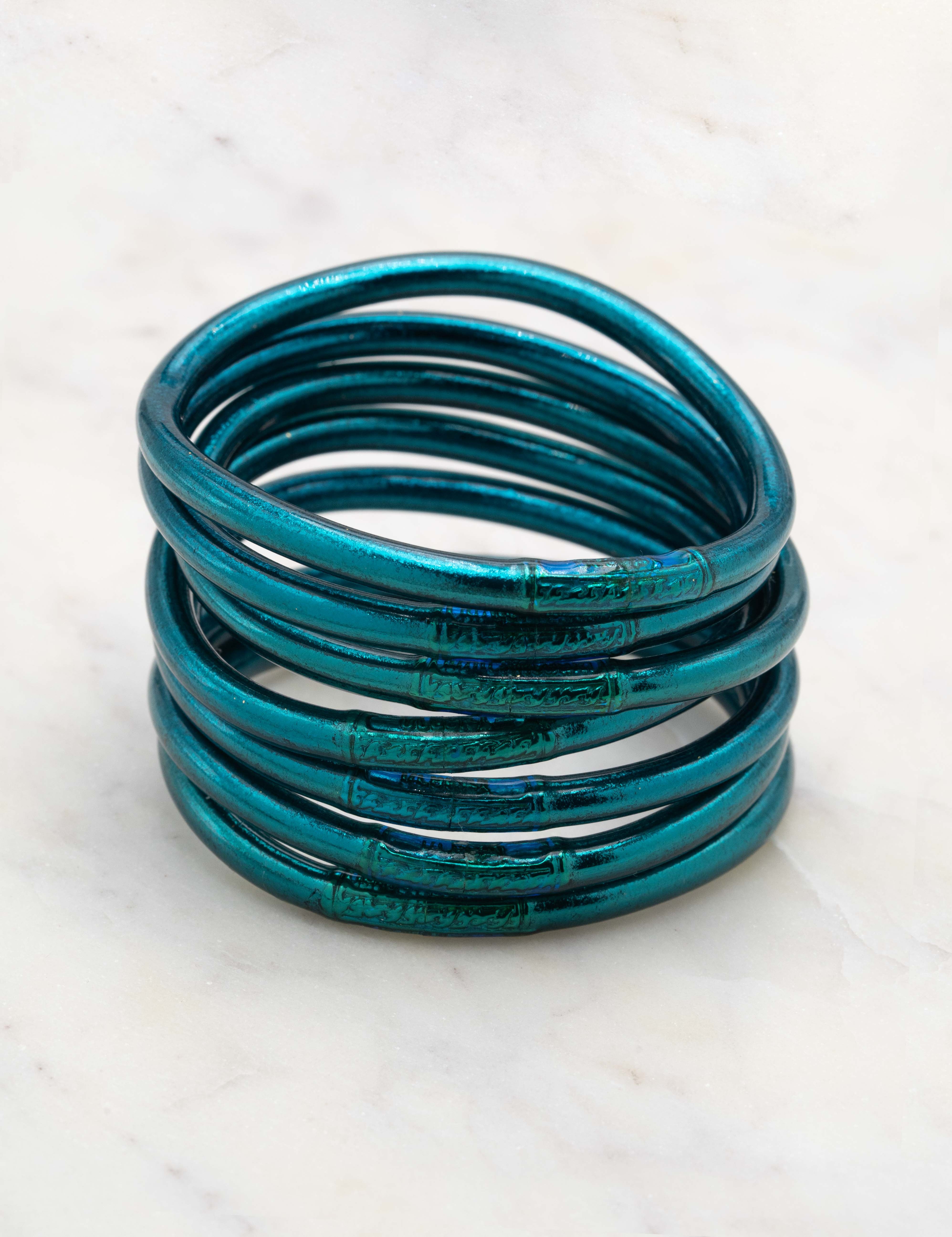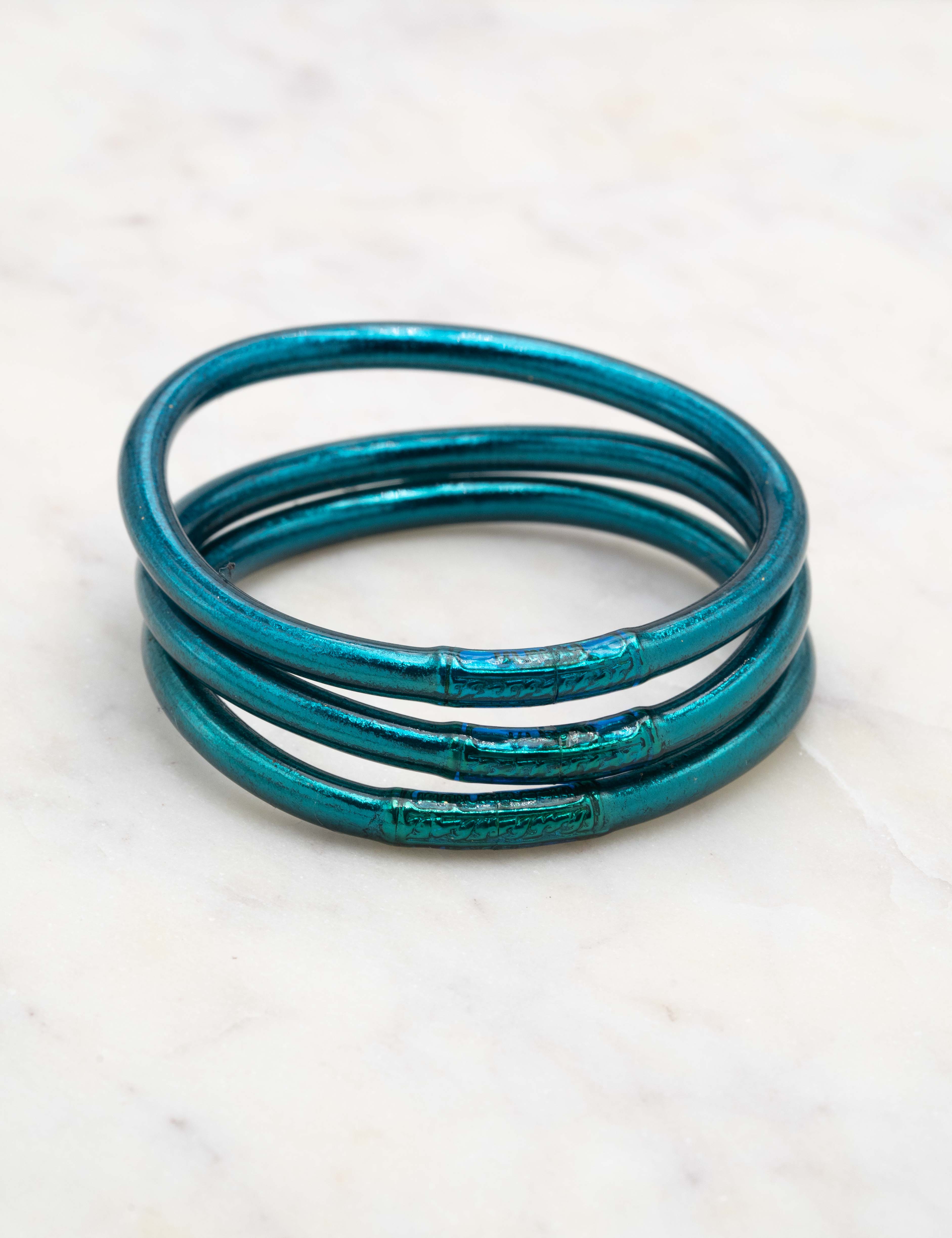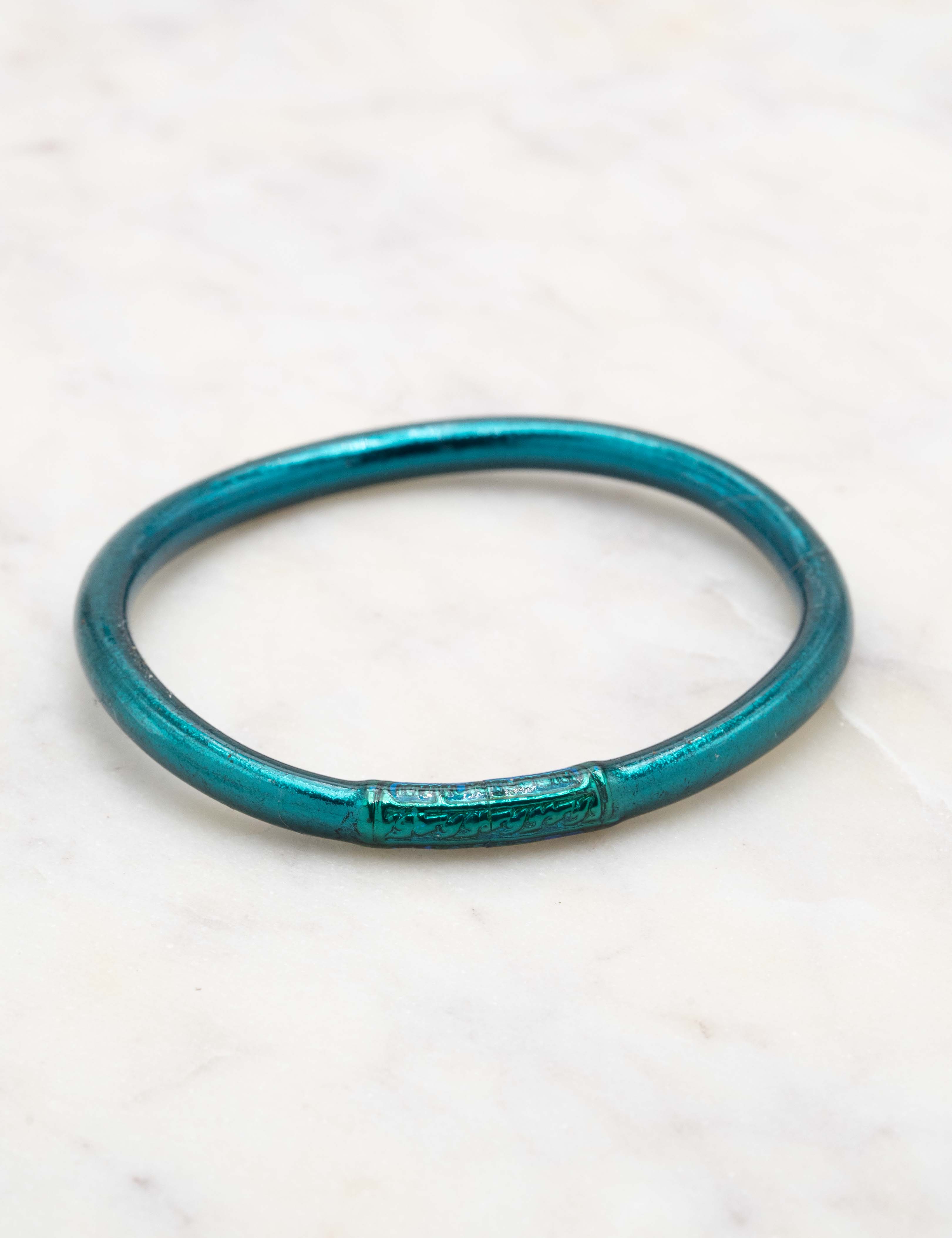 Jonc souple transparent rempli de feuilles argentées décoratives, scellé avec un mantra gravé "Bonheur, Chance, Fortune et Amour" en thaïlandais