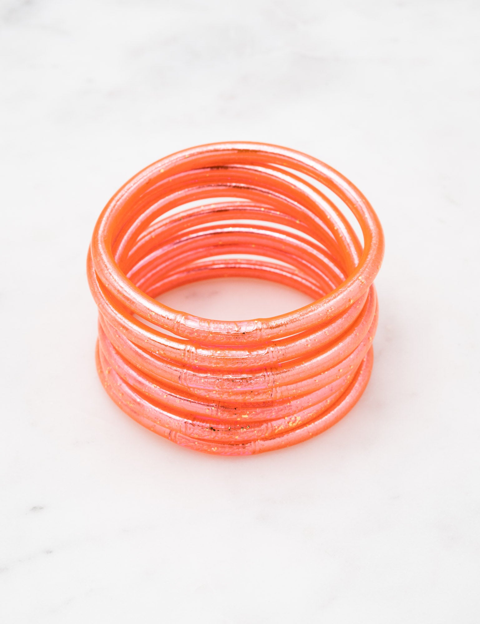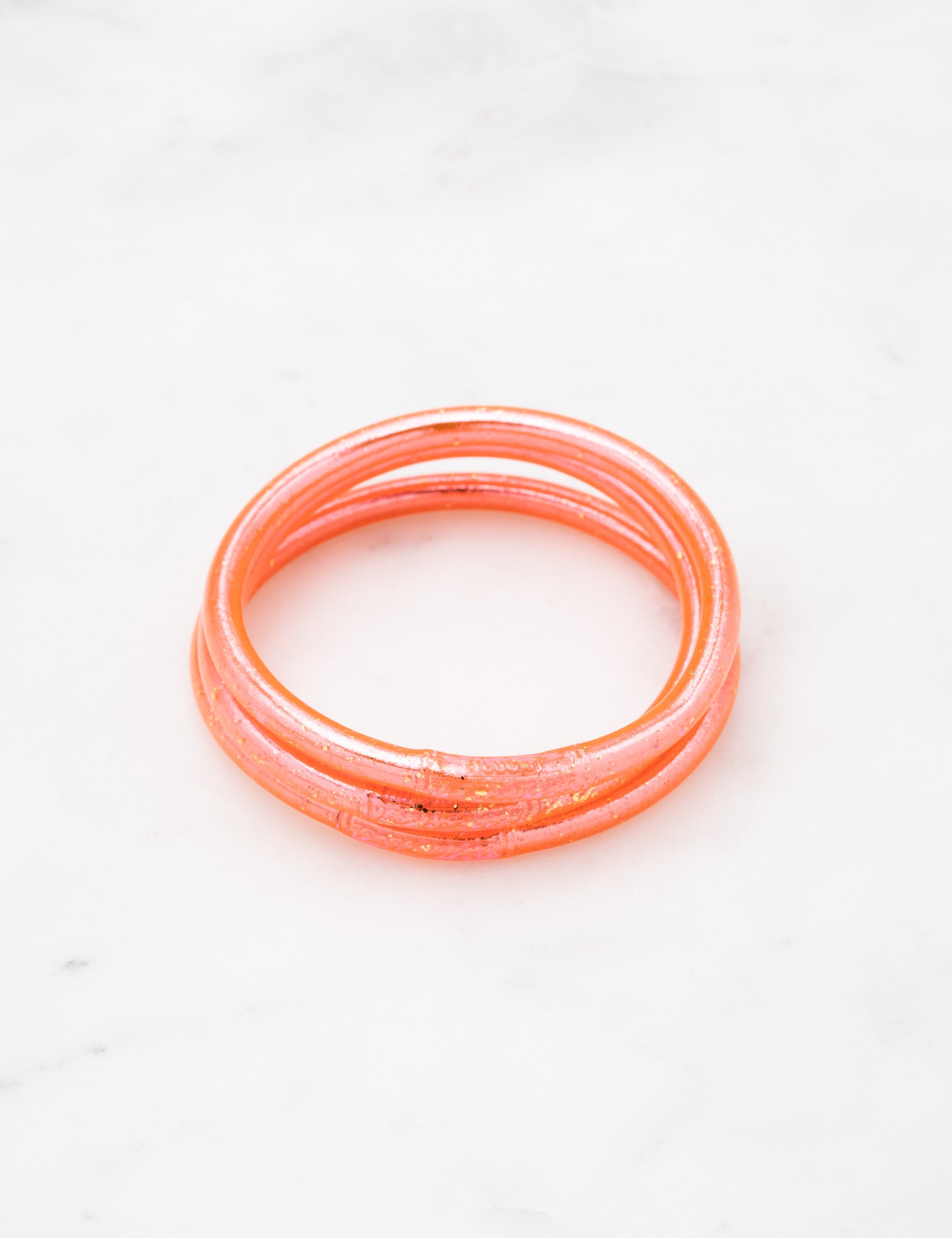 Jonc souple transparent rempli de feuilles dorées décoratives, scellé avec un mantra gravé "Bonheur, Chance, Fortune et Amour" en thaïlandais