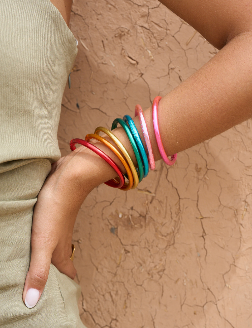 L'eau savonneuse permet aussi de les enfiler et enlèvera également l'excès de paillette qui pourrait se trouver sur le bracelet.