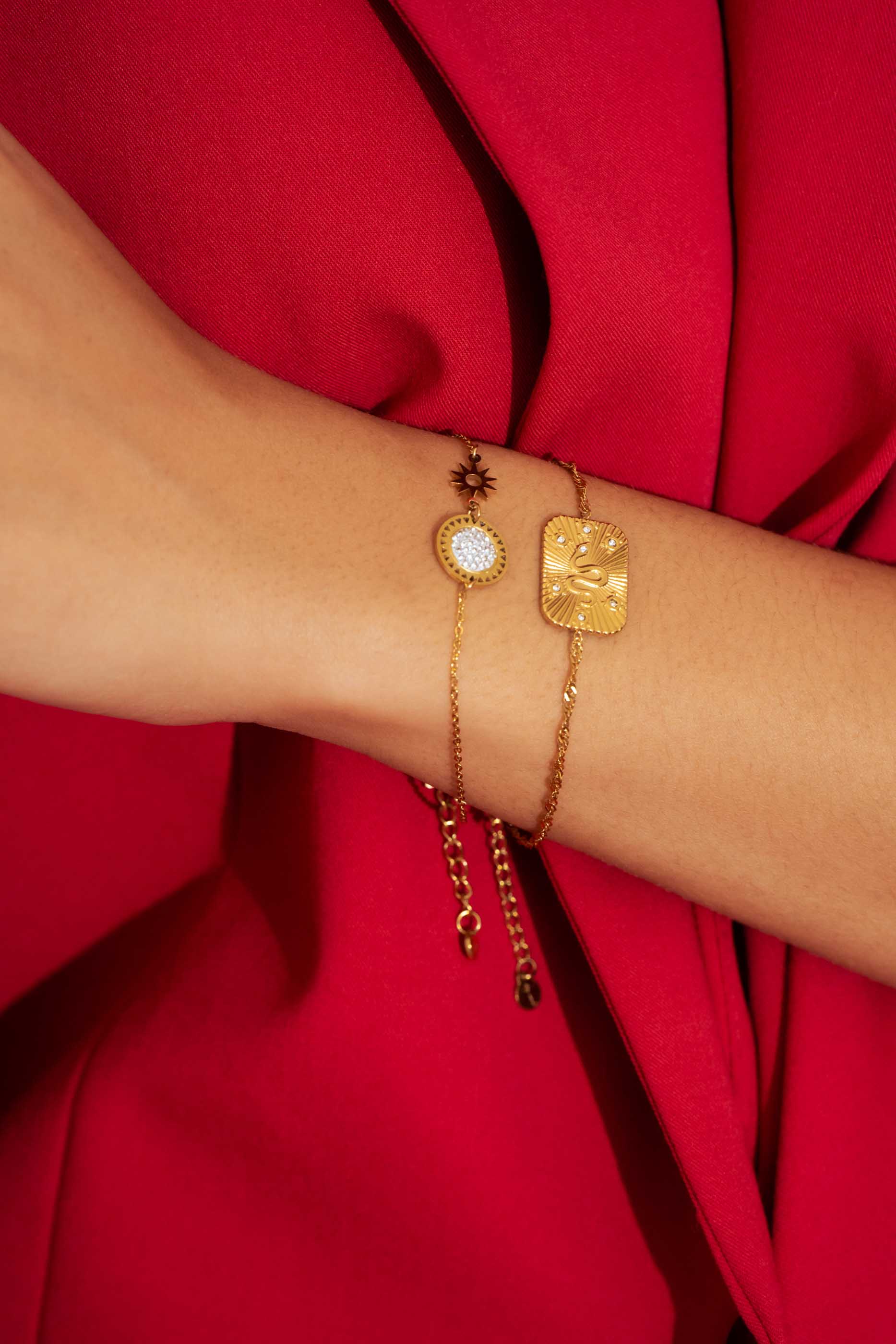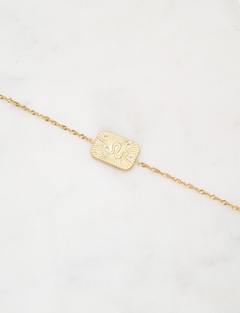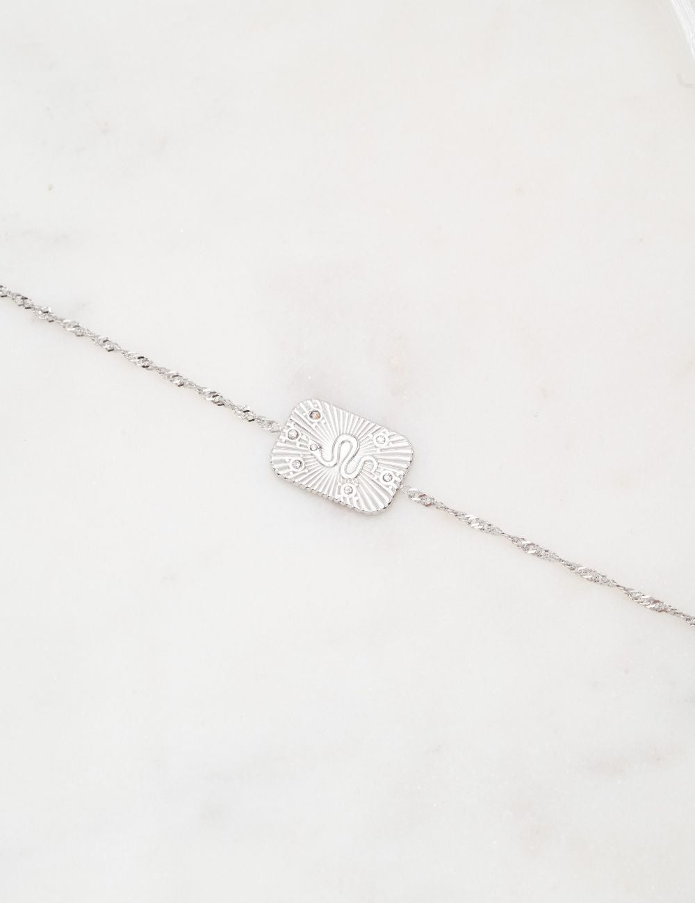Bracelet sur chaine réglable avec une pièce texturée avec un motif de serpent gravé et serti de strass. Fermoir mousqueton et chainette de réglage.