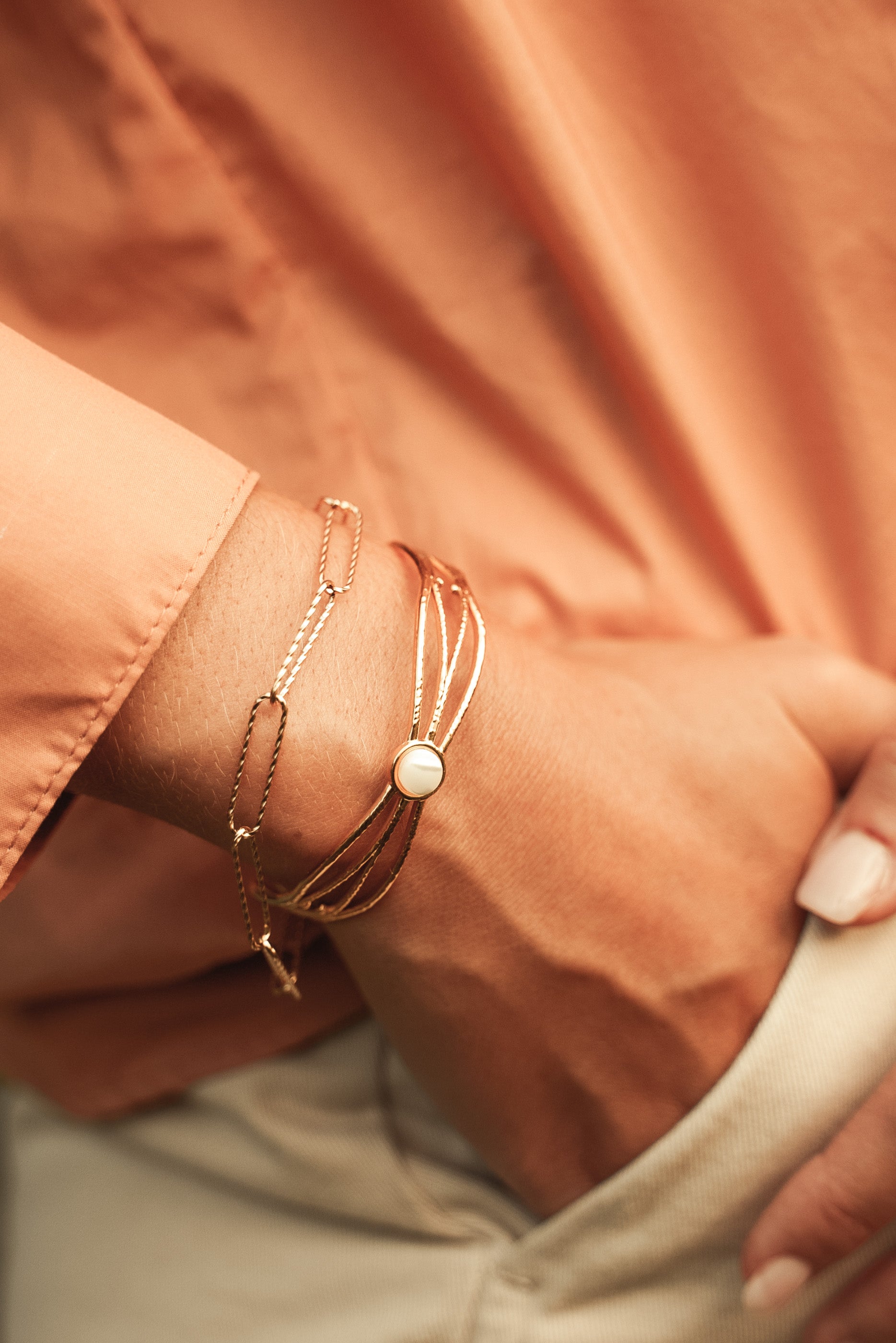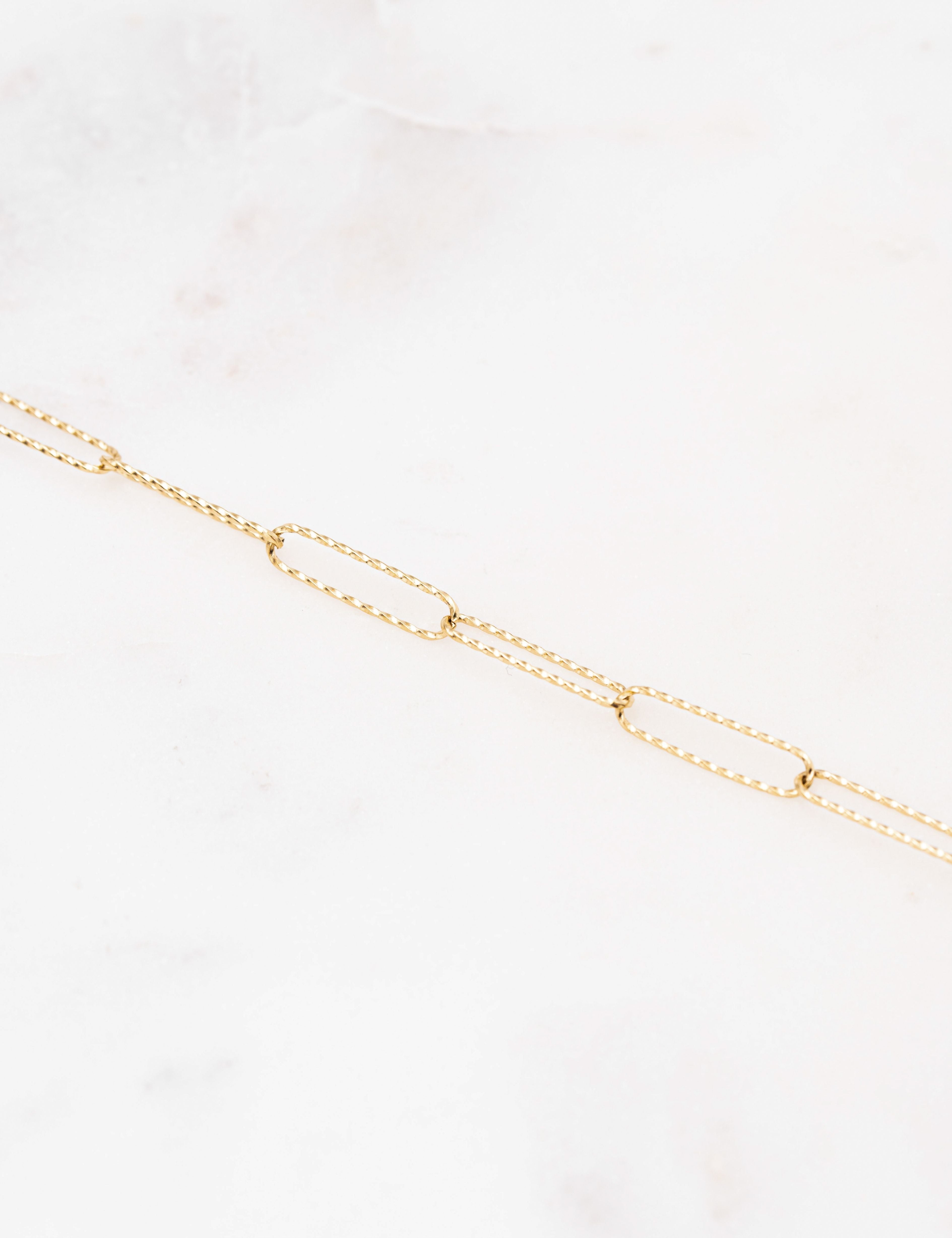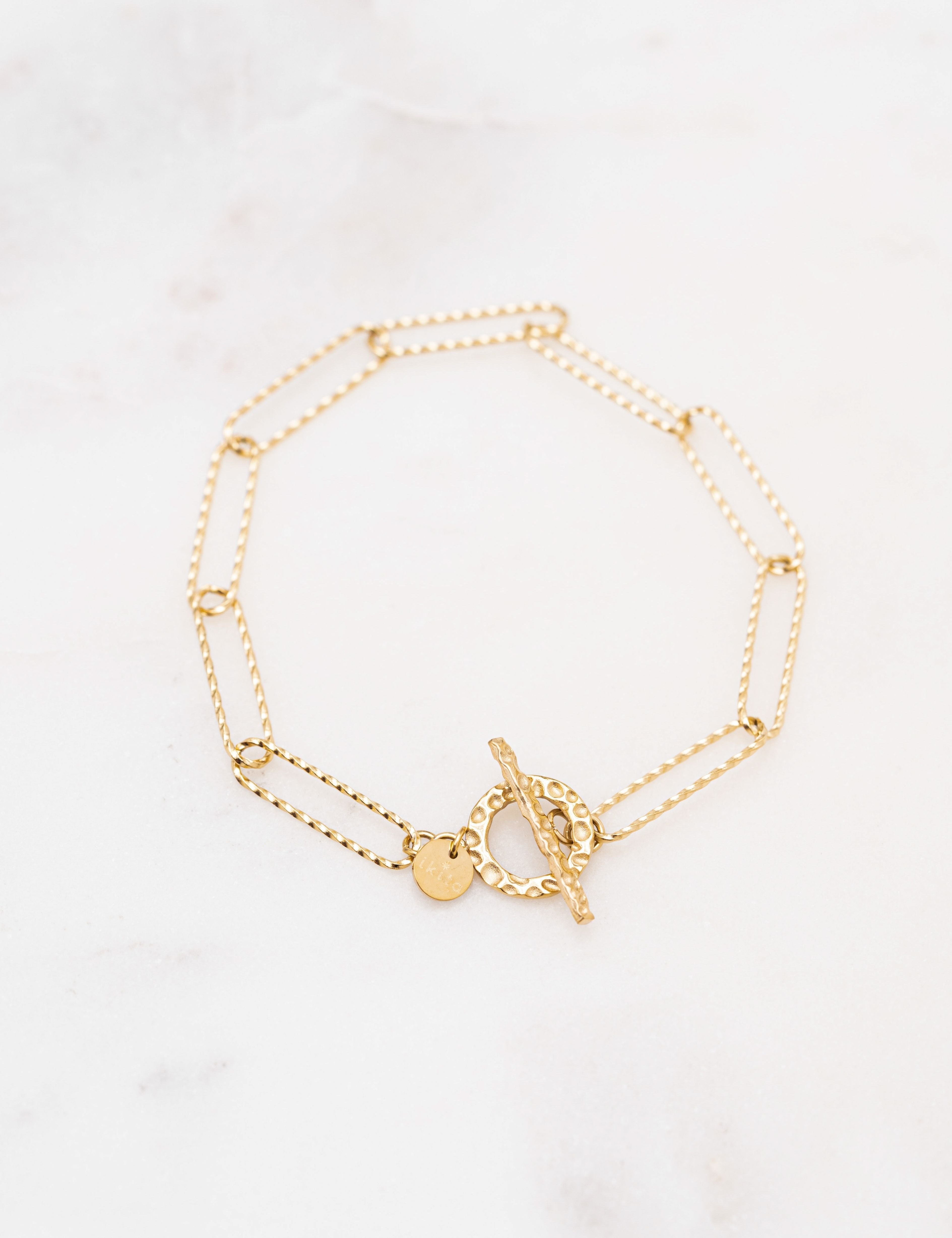 Bracelet sur chaine réglable à maillons effet martelé. Fermoir central façon toggle.