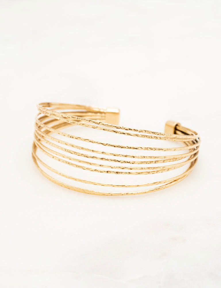 Bracelet malléable type jonc graphique multitrangs texturés.