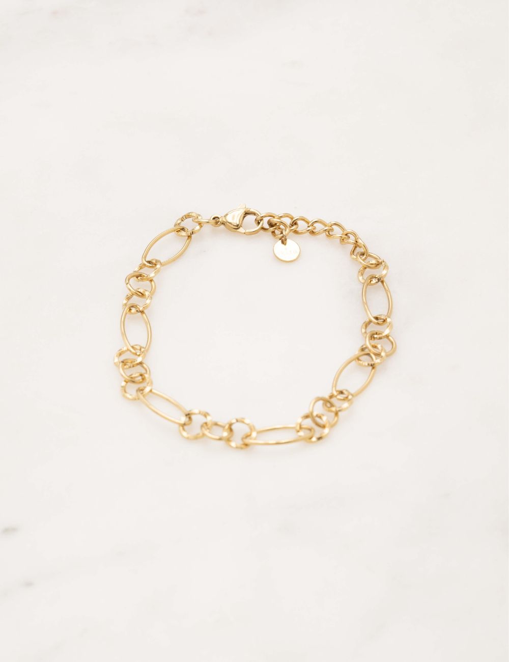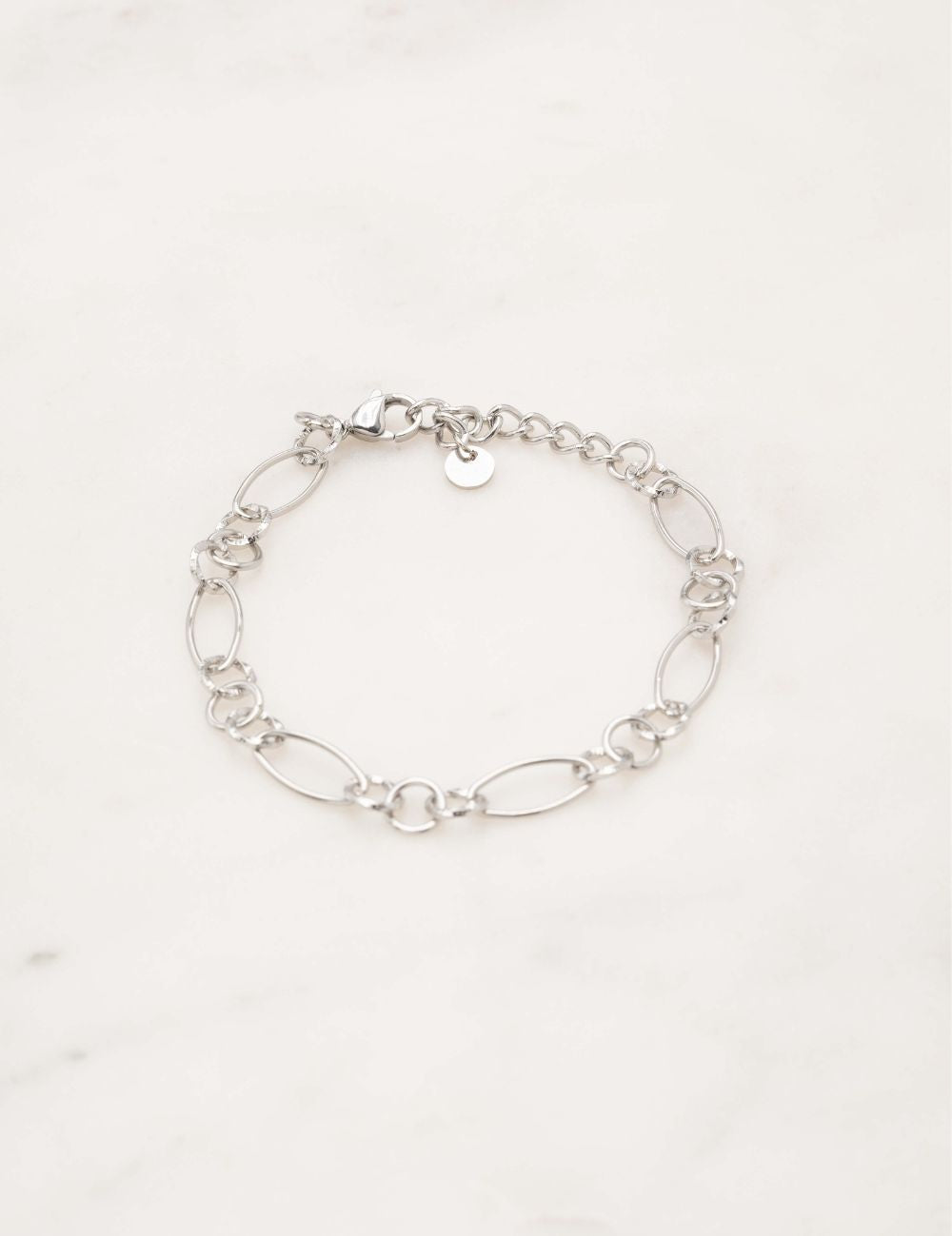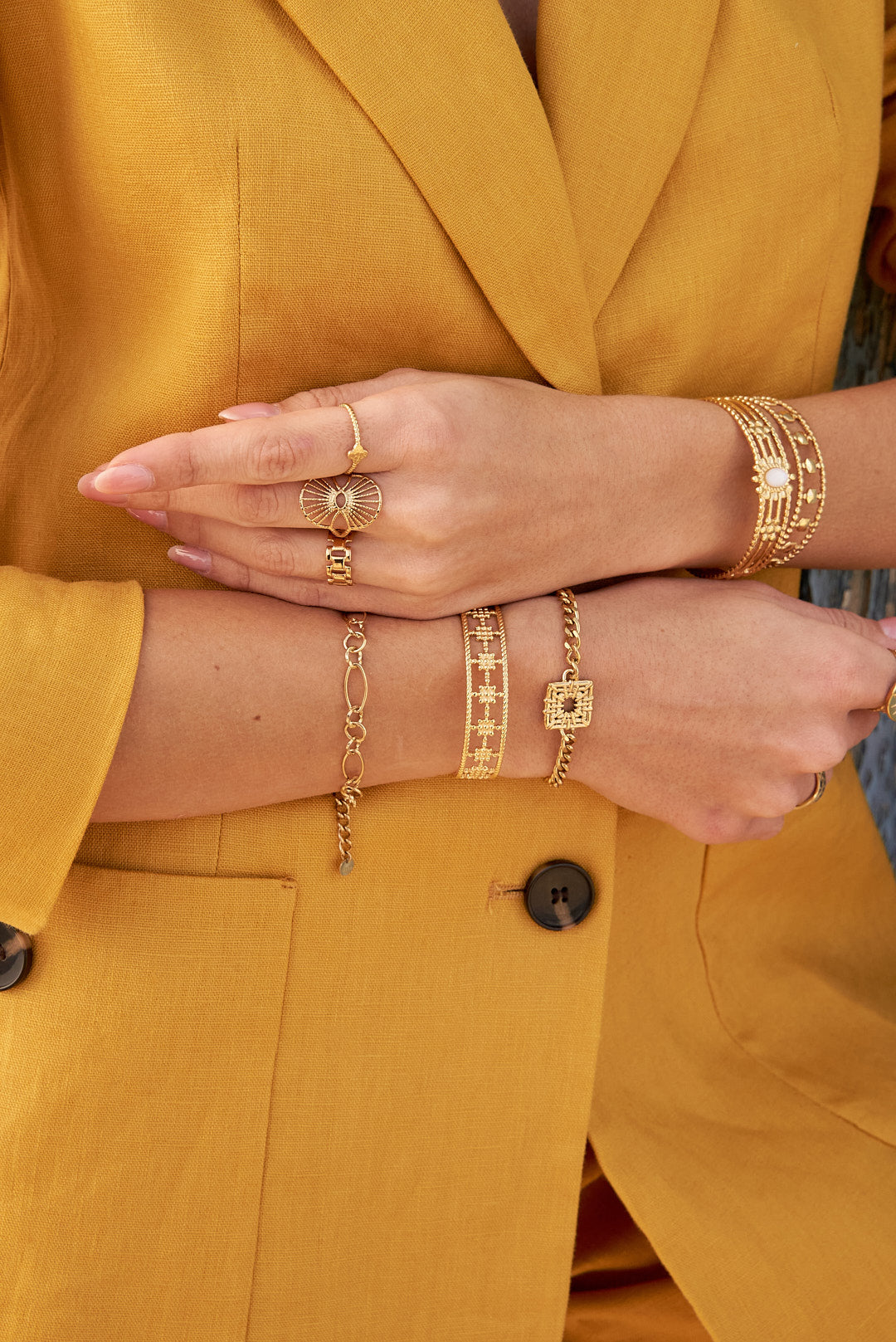 Bracelet réglable graphique composé d'un jeu d'anneaux et de maillons. Fermoir mousqueton et chainette de réglage.