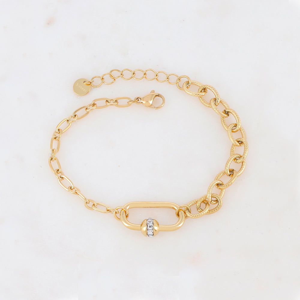 Bracelet réglable sur chaine  avec un jeu de mailles dorées (lisse et texturé) composé d'un anneau ovale effet lock* orné de strass.