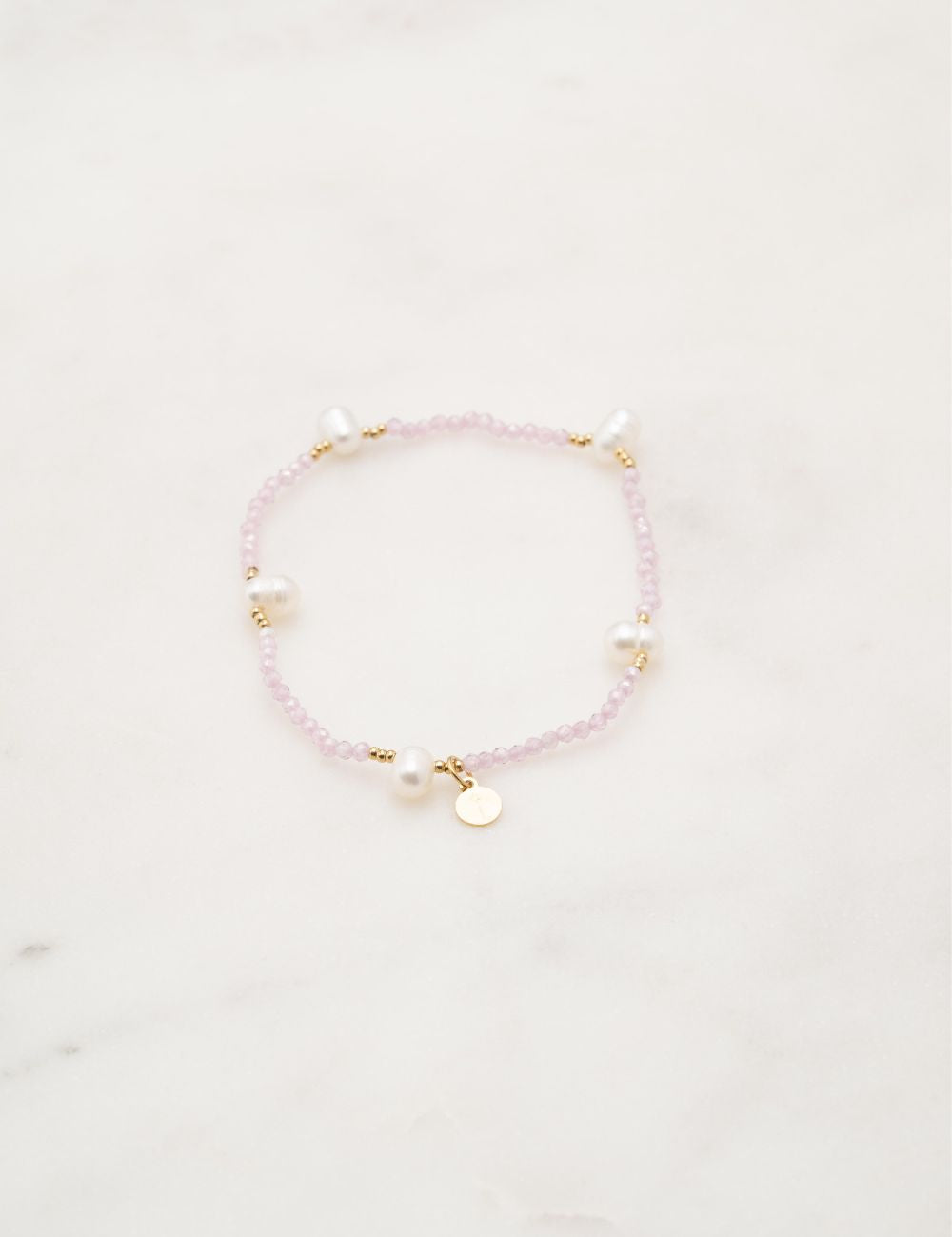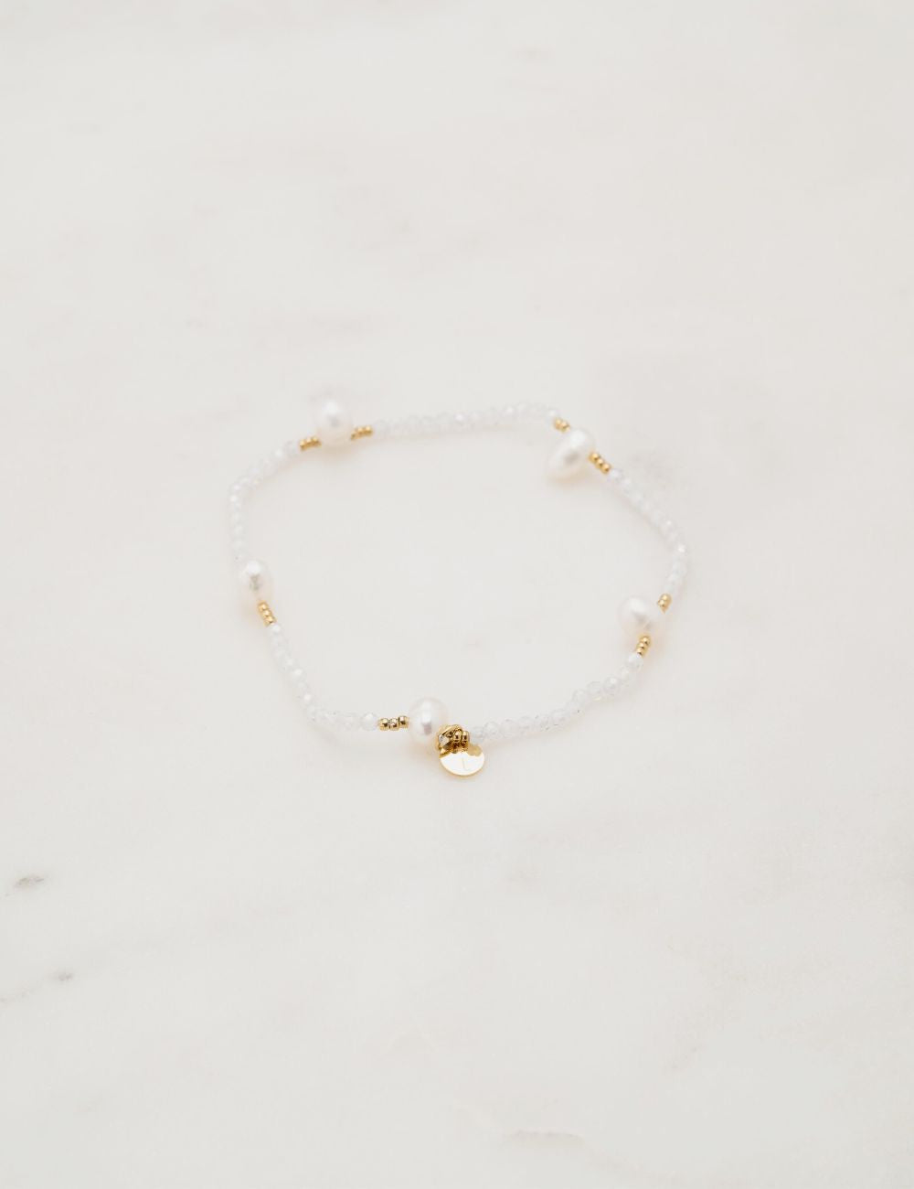 Bracelet élastique composé d'un joli enfilage de perles en pâte de verre, perles d'eau douce et petites perles dorées.