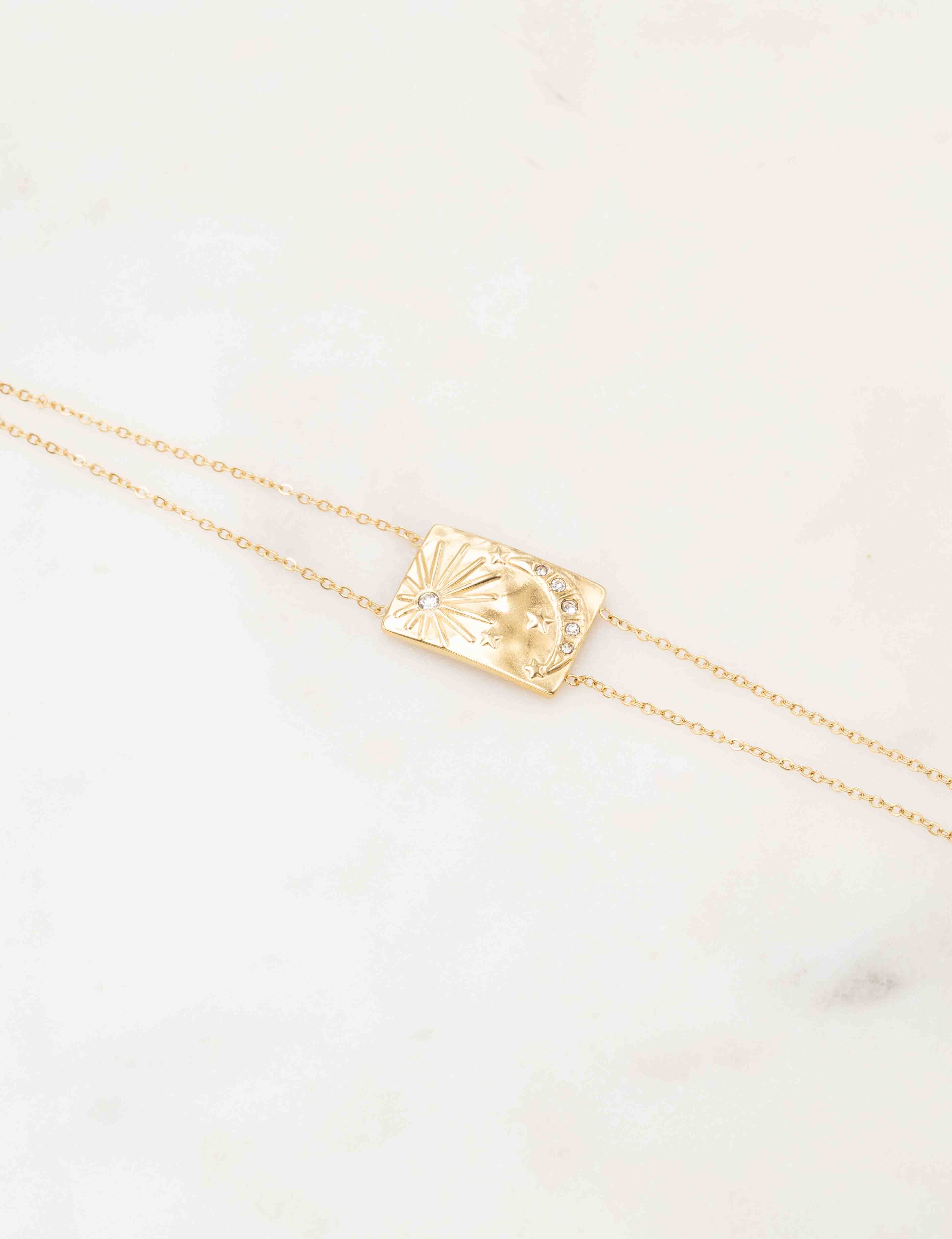 Bracelet réglable composé de deux chaines et d'une pièce au motif étoilé et lunaire sertis de strass. Fermoir mousqueton et chainette de réglage.