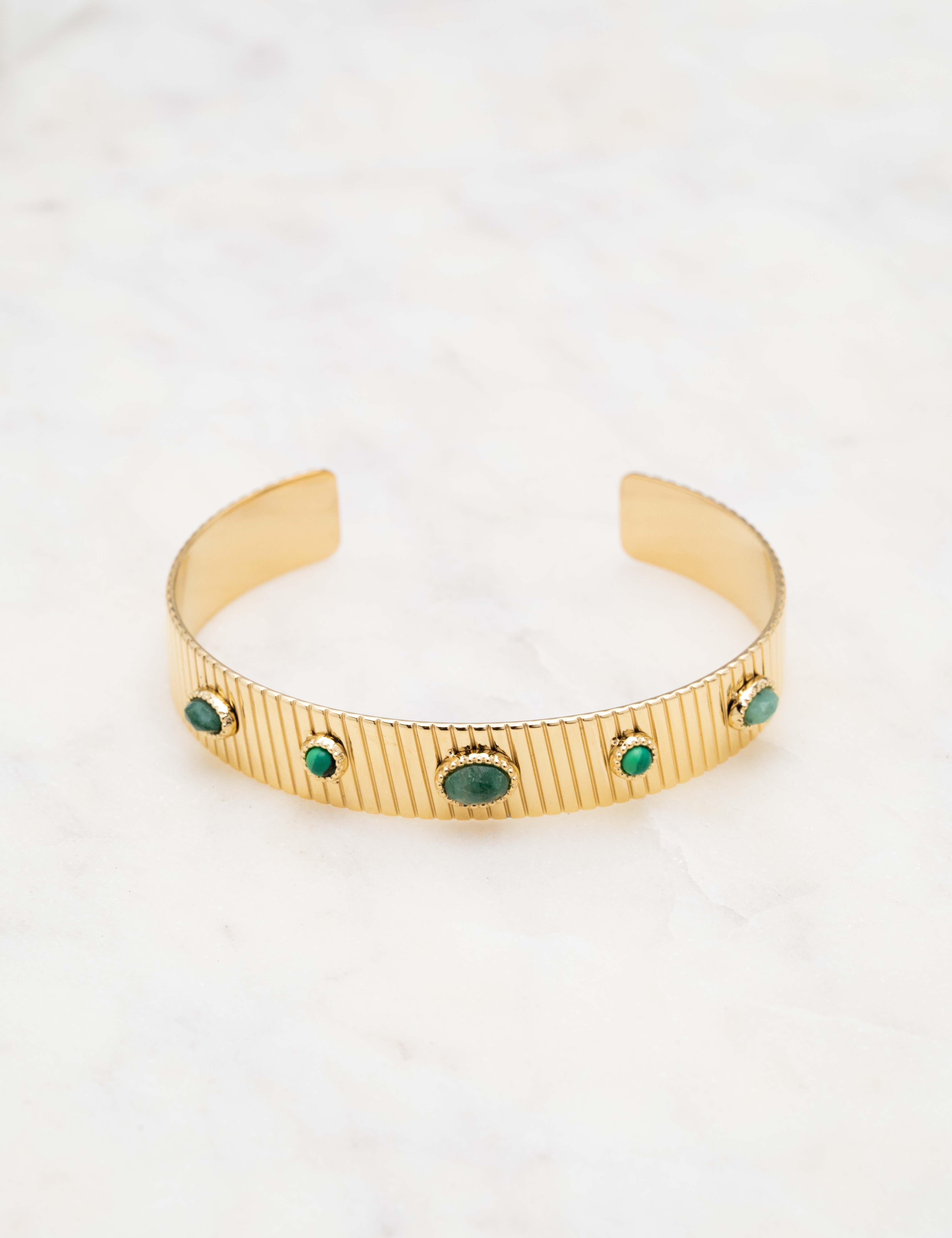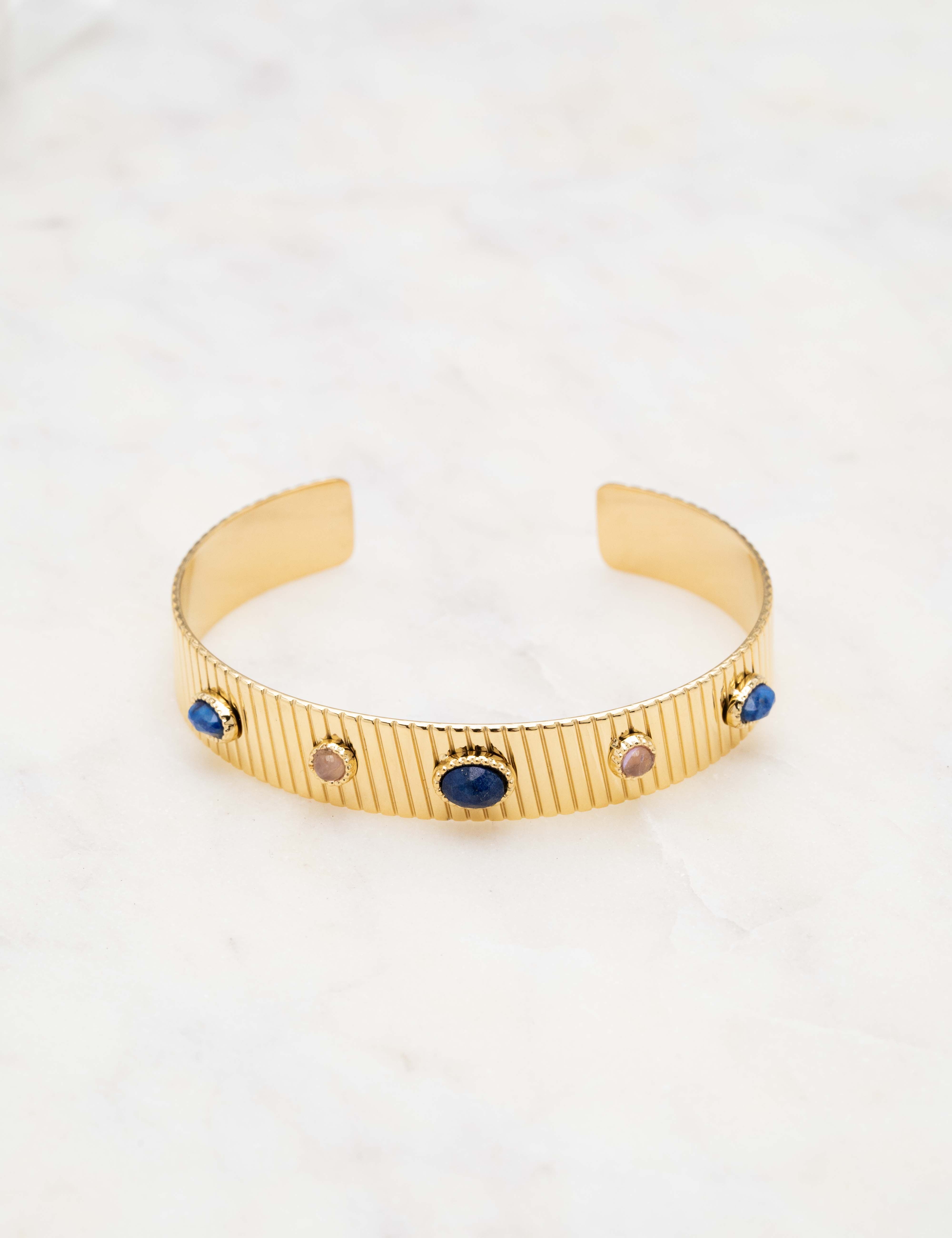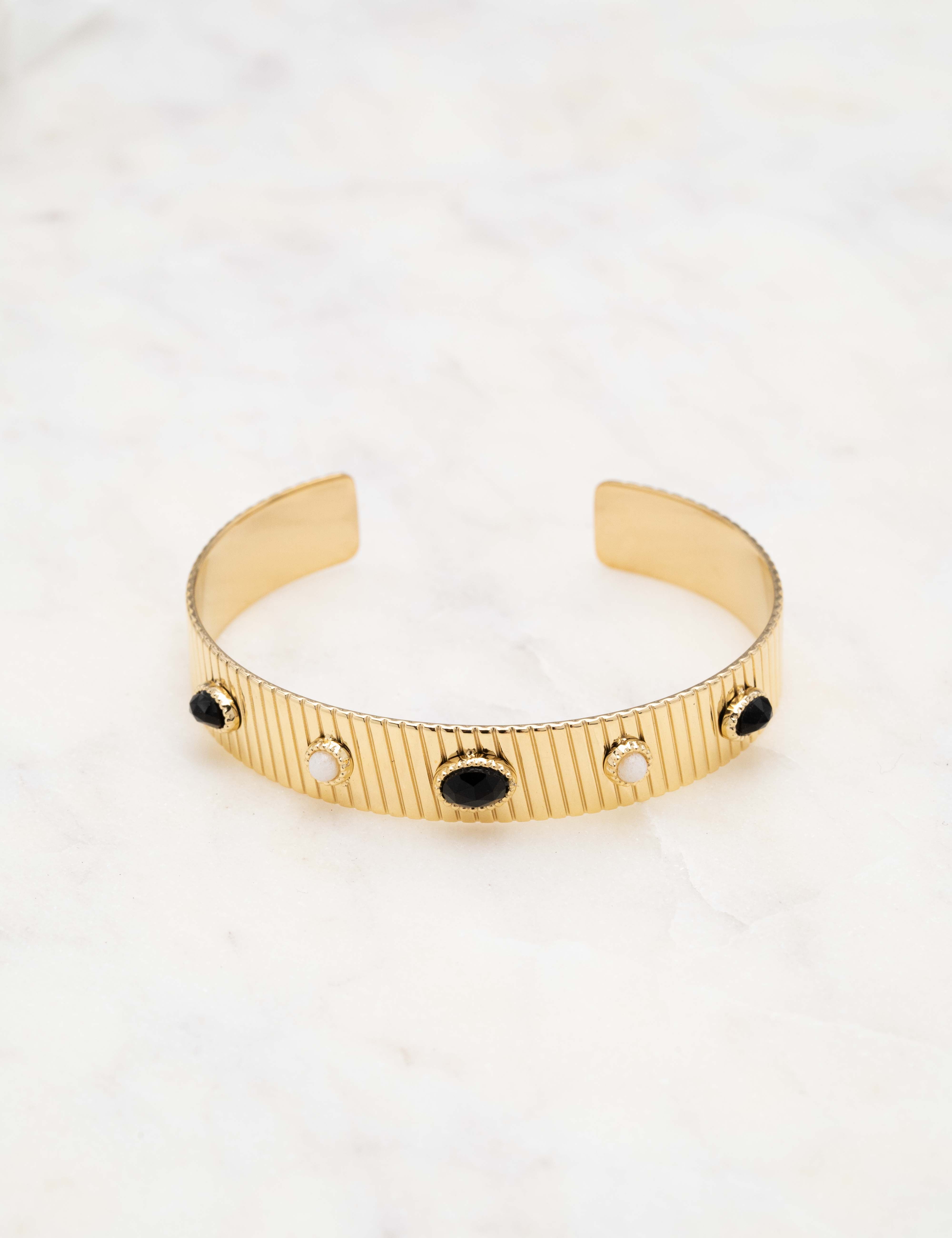 Bracelet type jonc malléable effet rainuré, orné de pièces géométriques serties de pierres naturelles.
