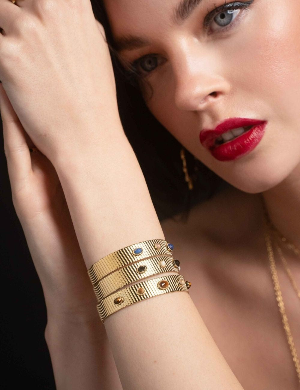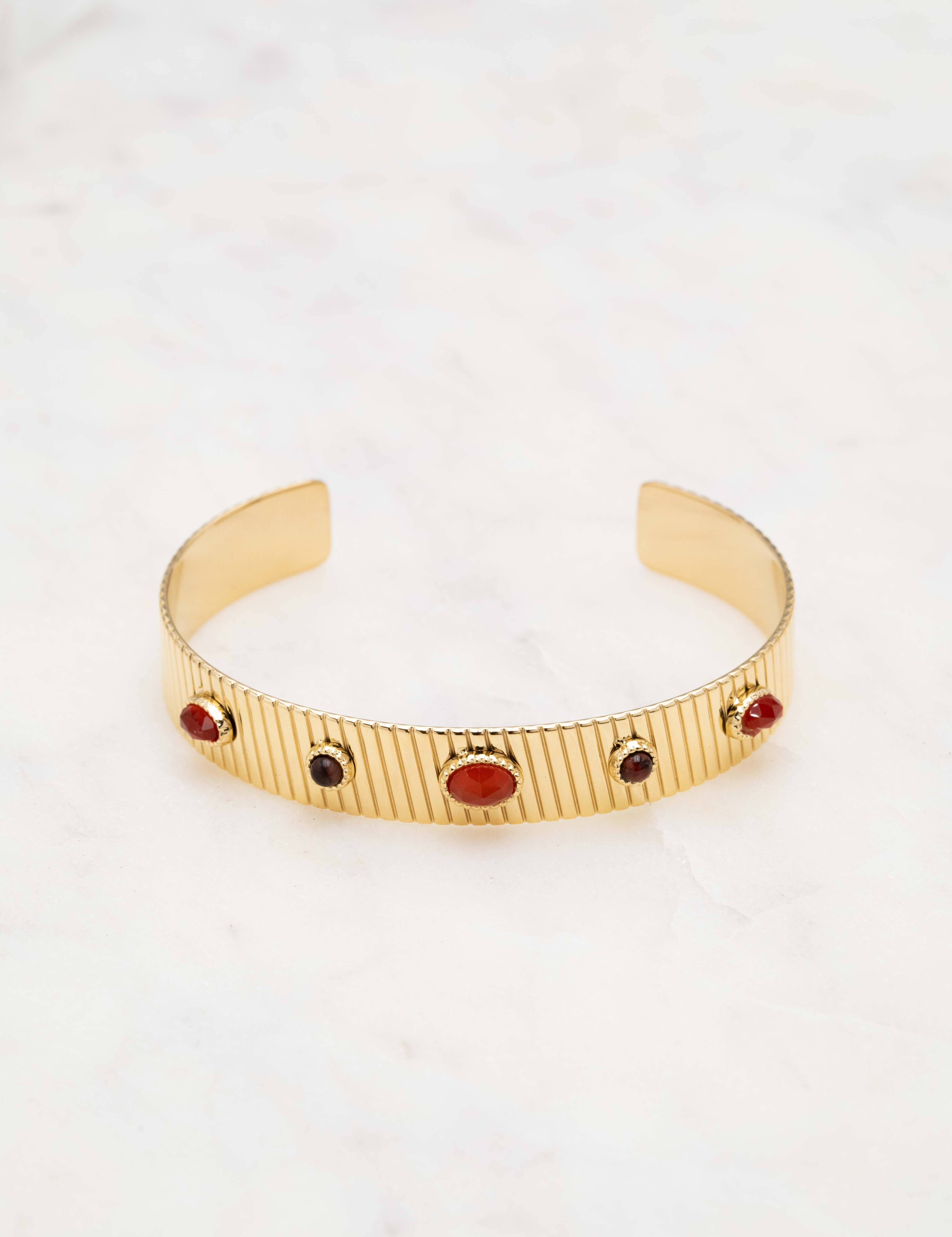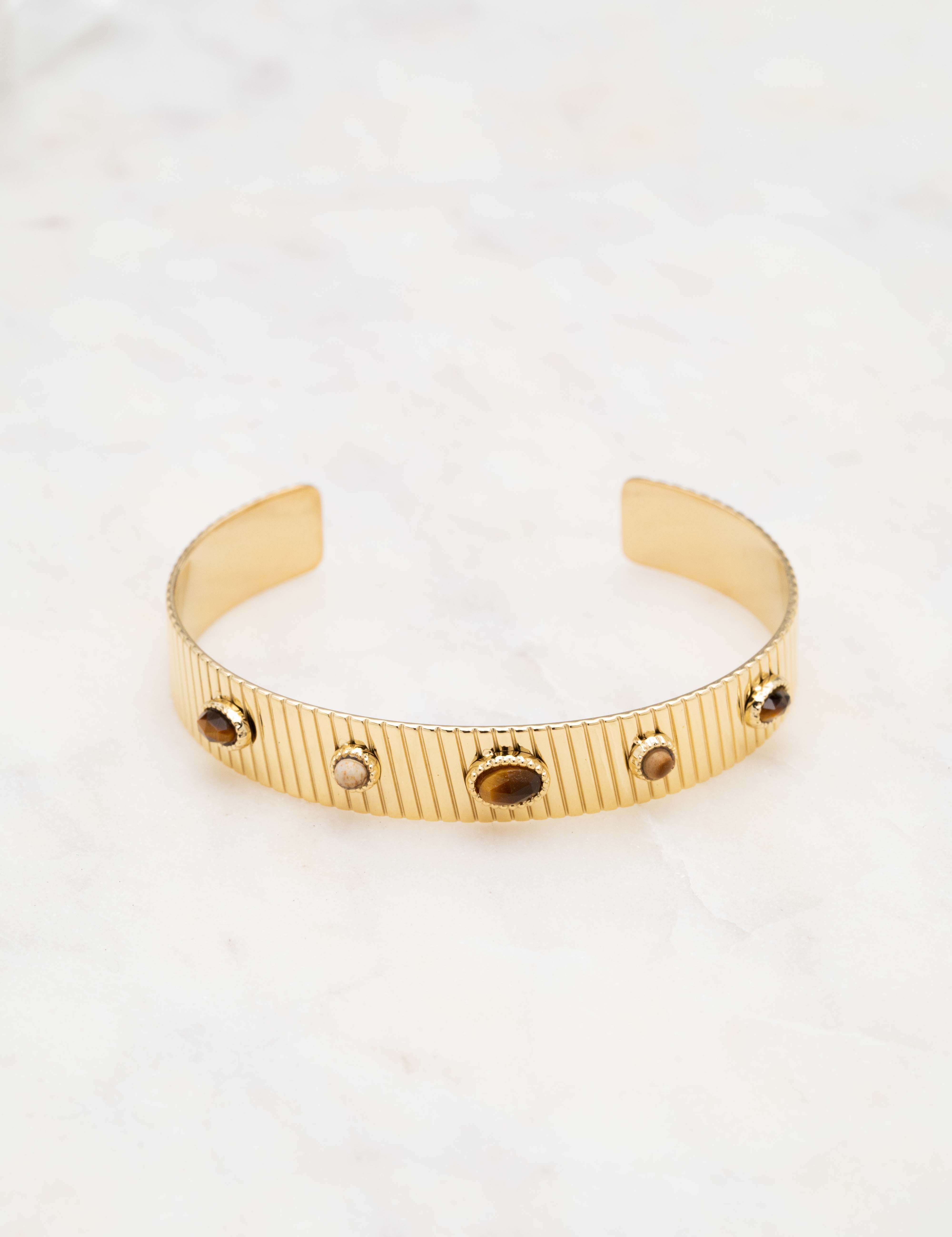Bracelet type jonc malléable effet rainuré, orné de pièces géométriques serties de pierres naturelles.