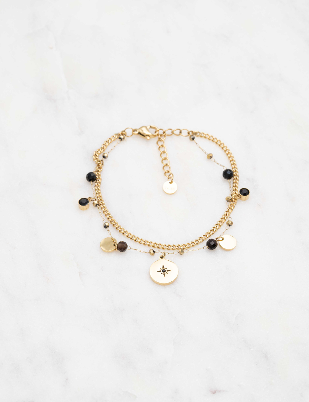 Bracelet réglable sur chaîne double rangs composé d'une chaine maille et une chaine ornée de pampilles rondes, de strass et de perles en pierres naturelles.