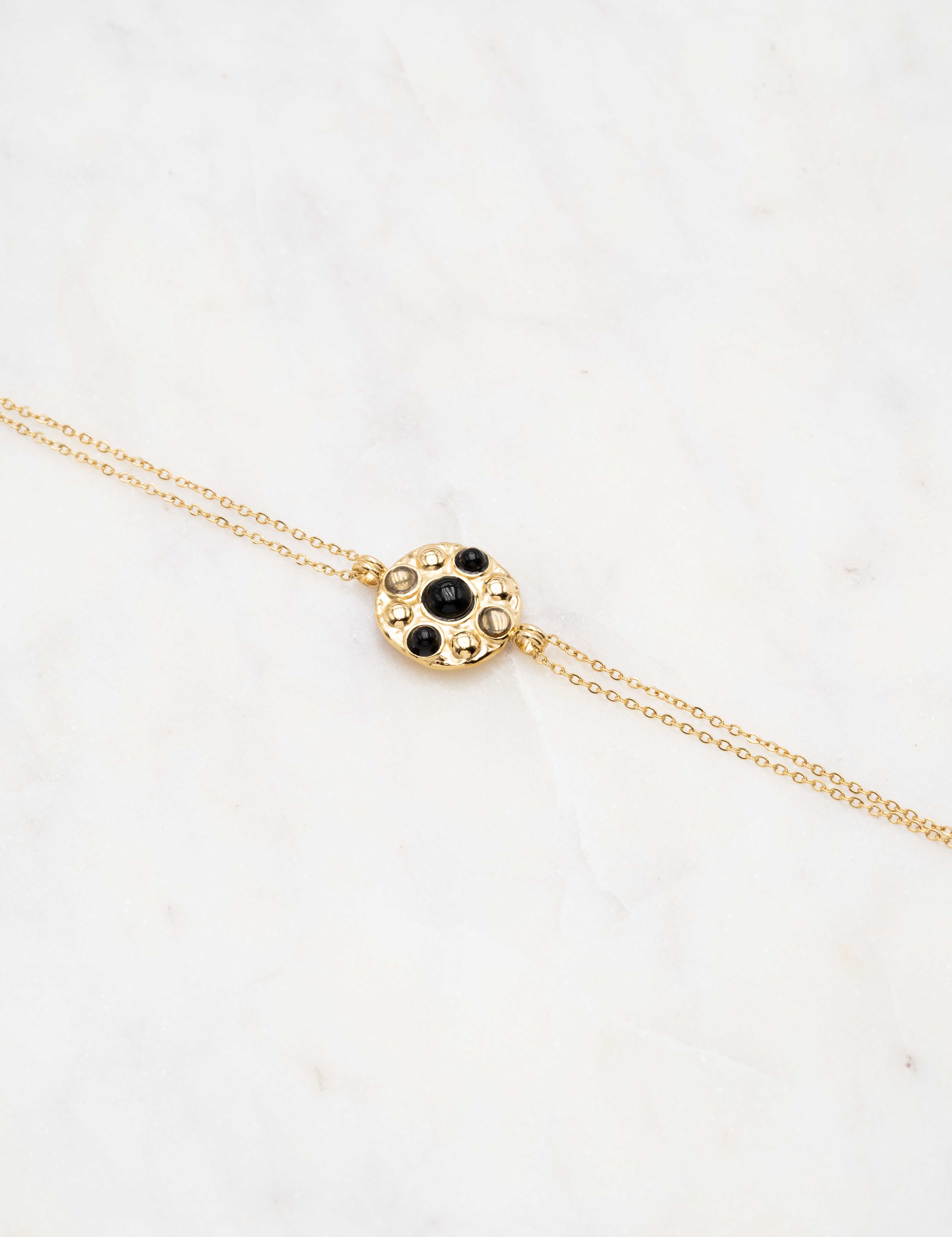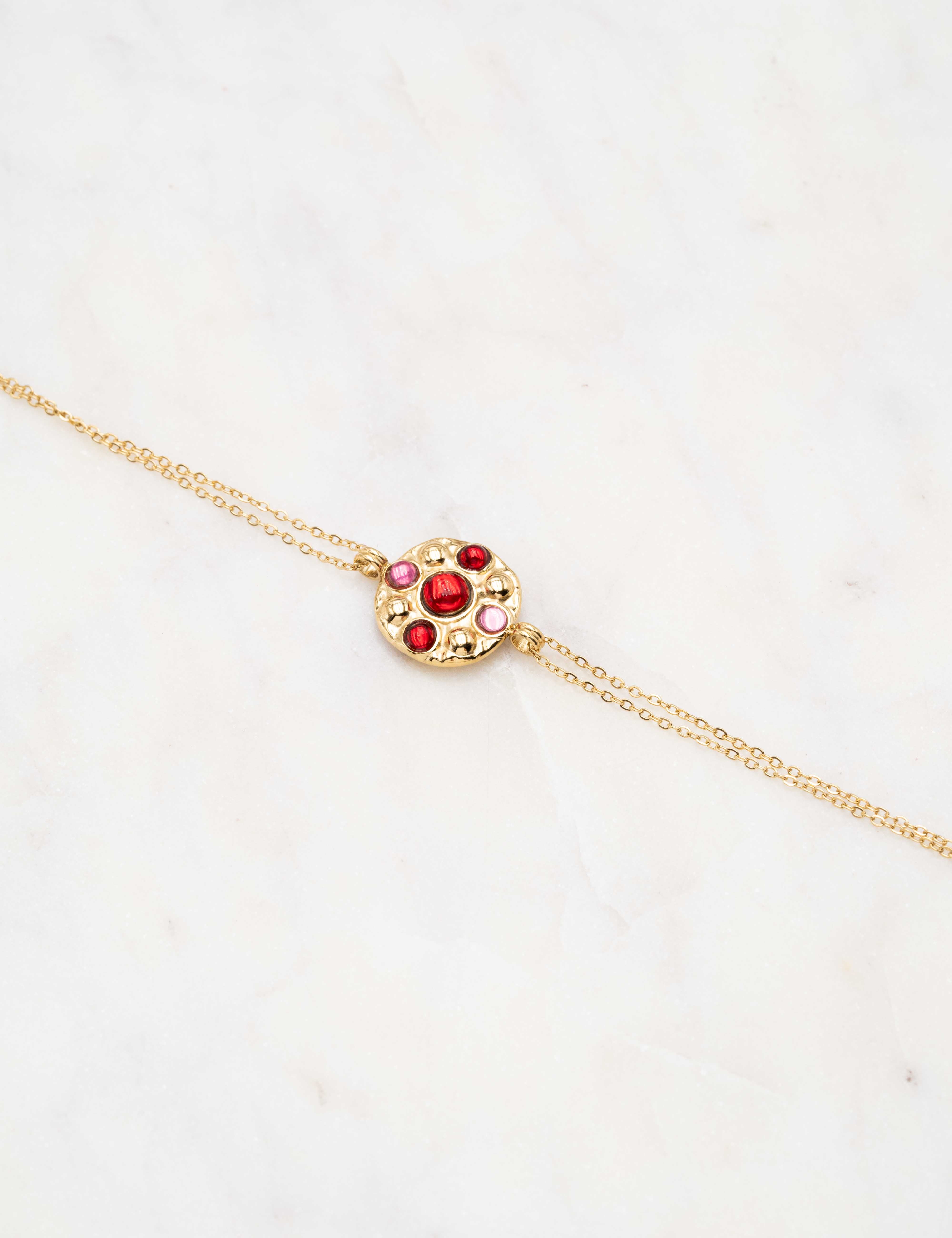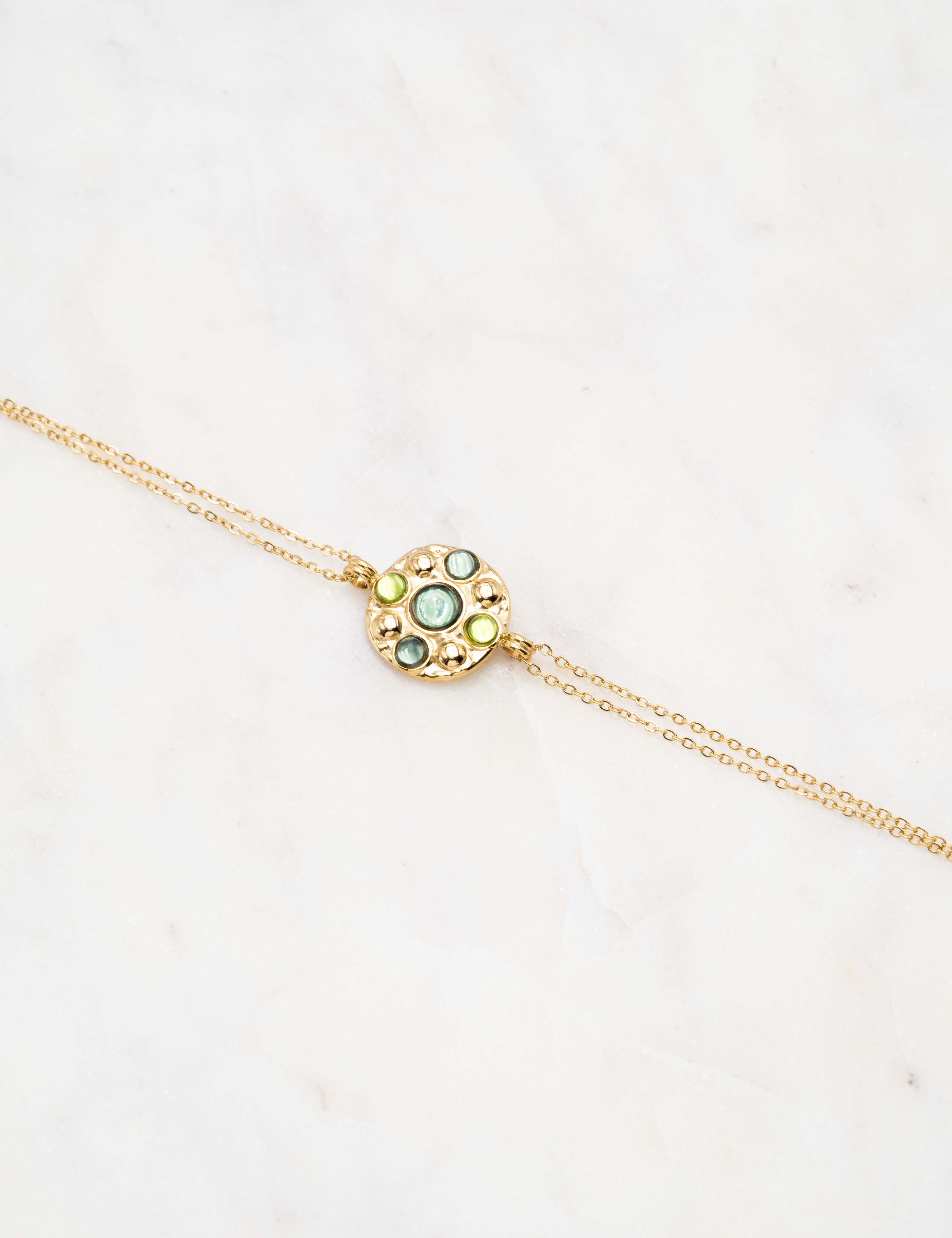 Bracelet réglable sur chaîne composé d'une pièce ronde texturée, ornée de cabochons colorés en pâte de verre.