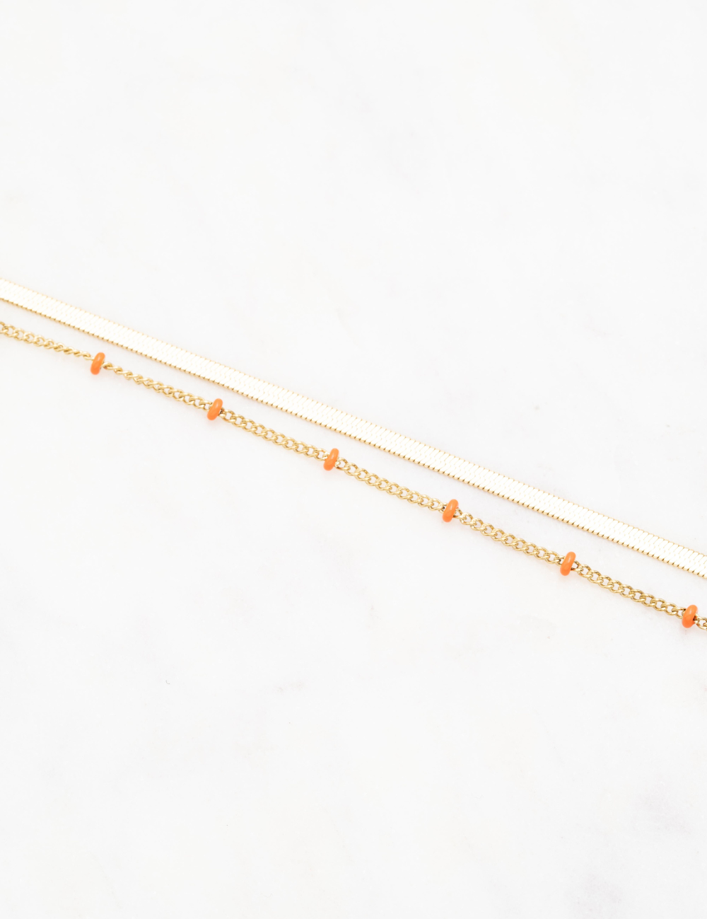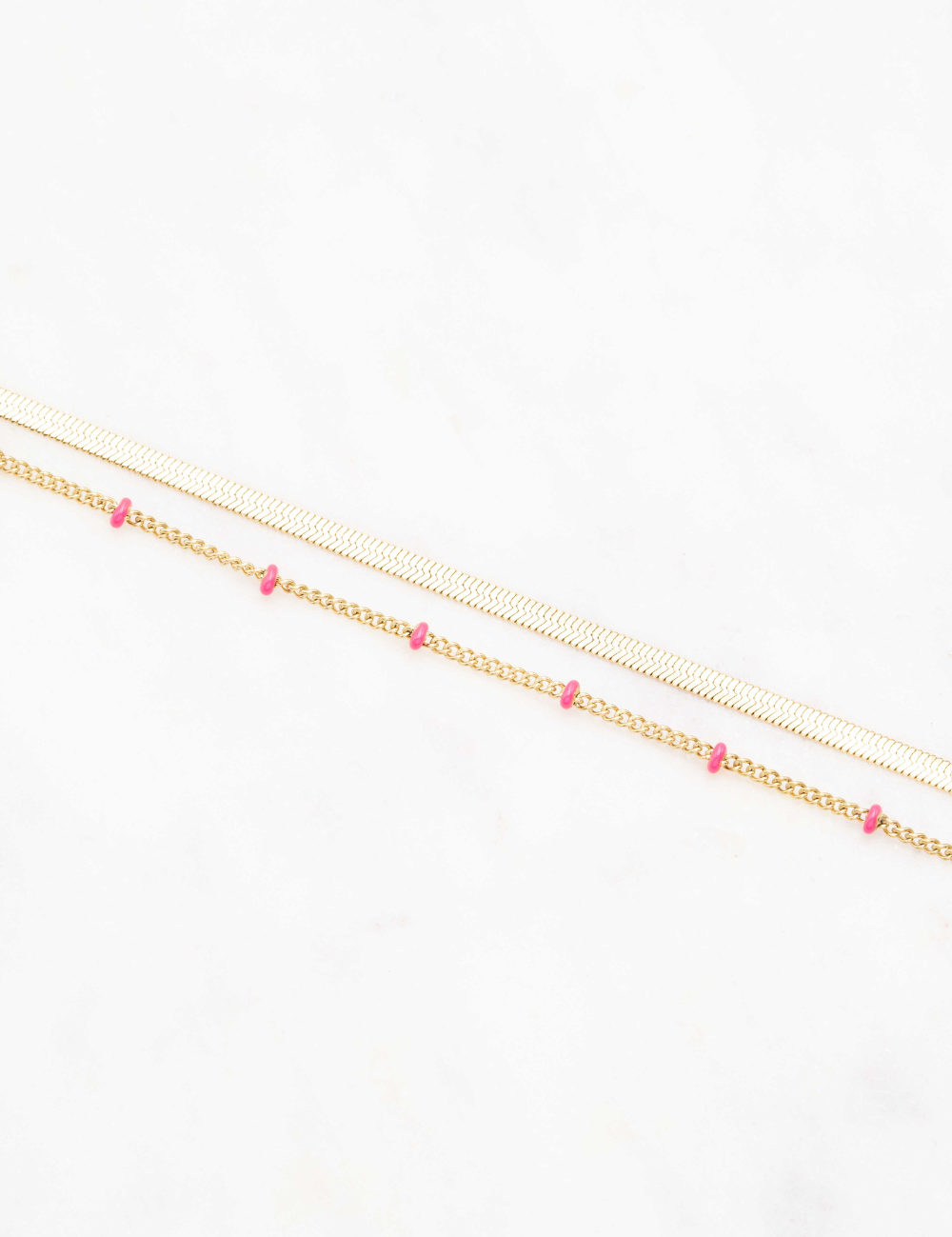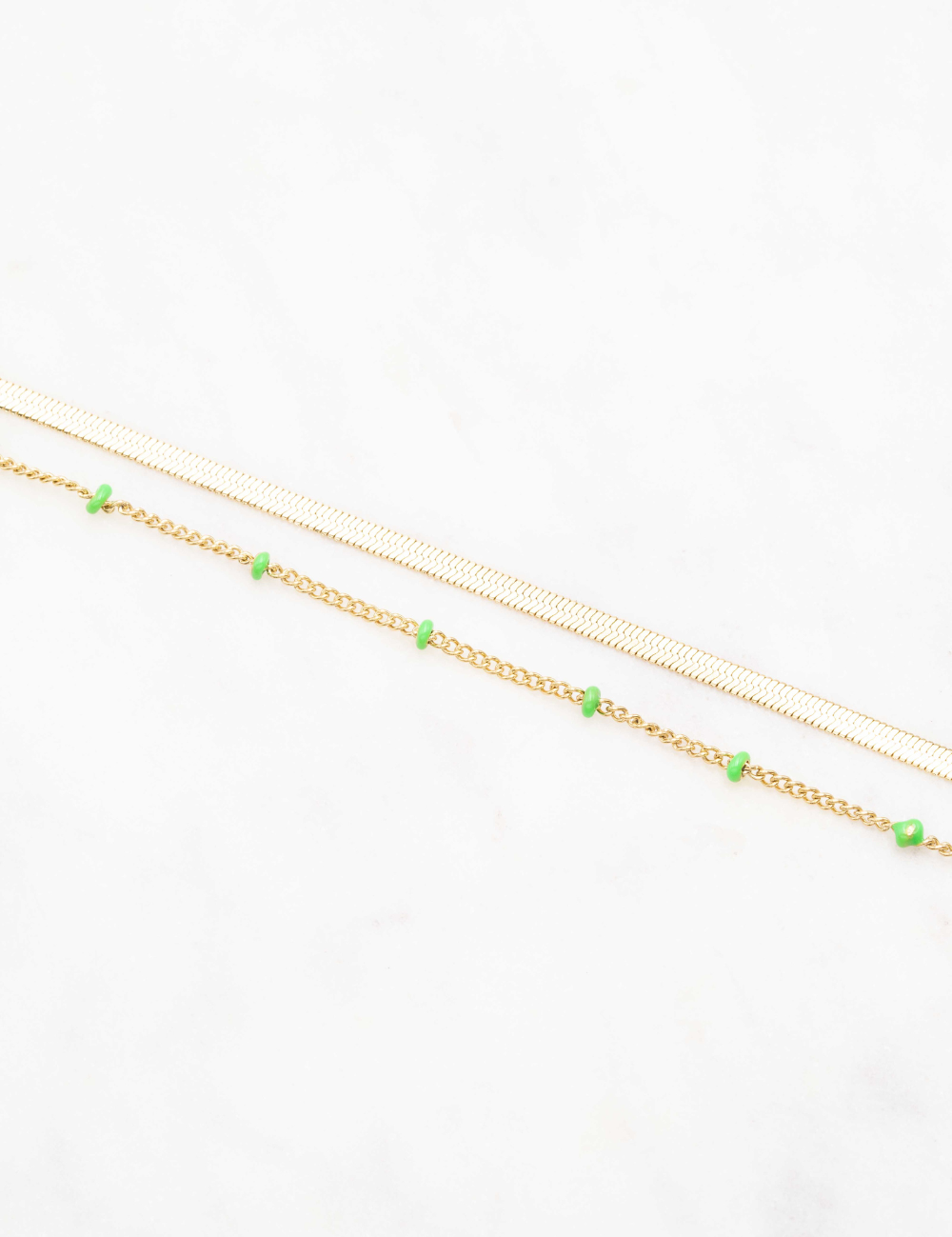Bracelet type chevillère réglable deux rangs composé d'un jeu de maille plate et de chaine avec des perles émaillées colorées .