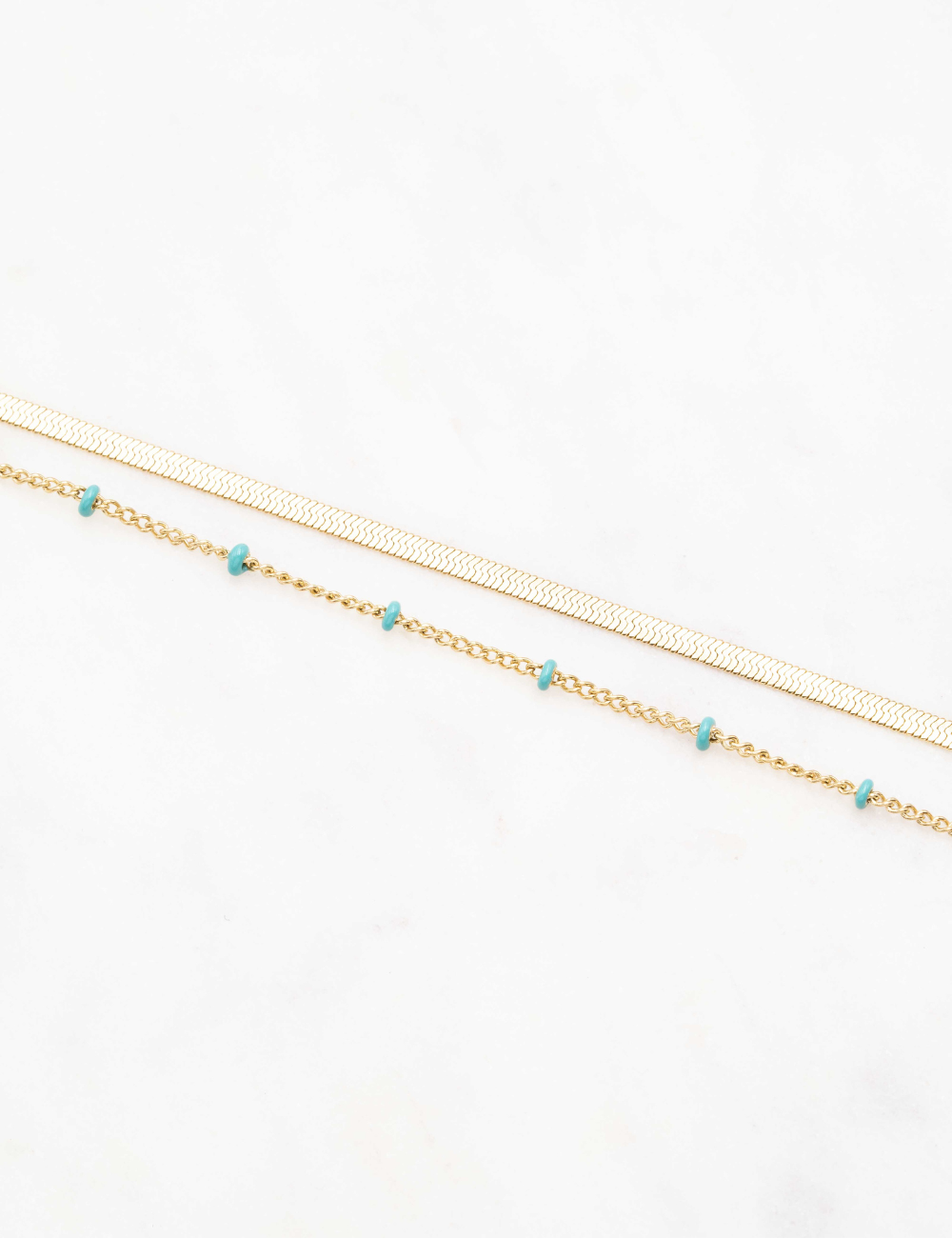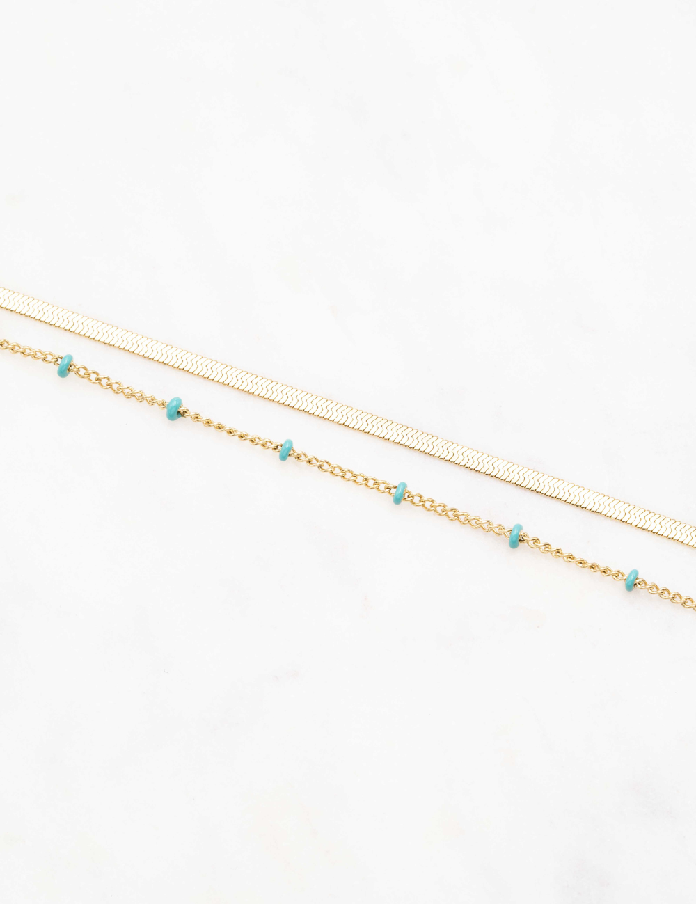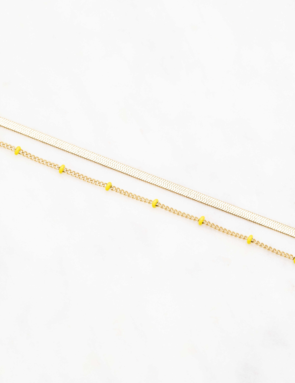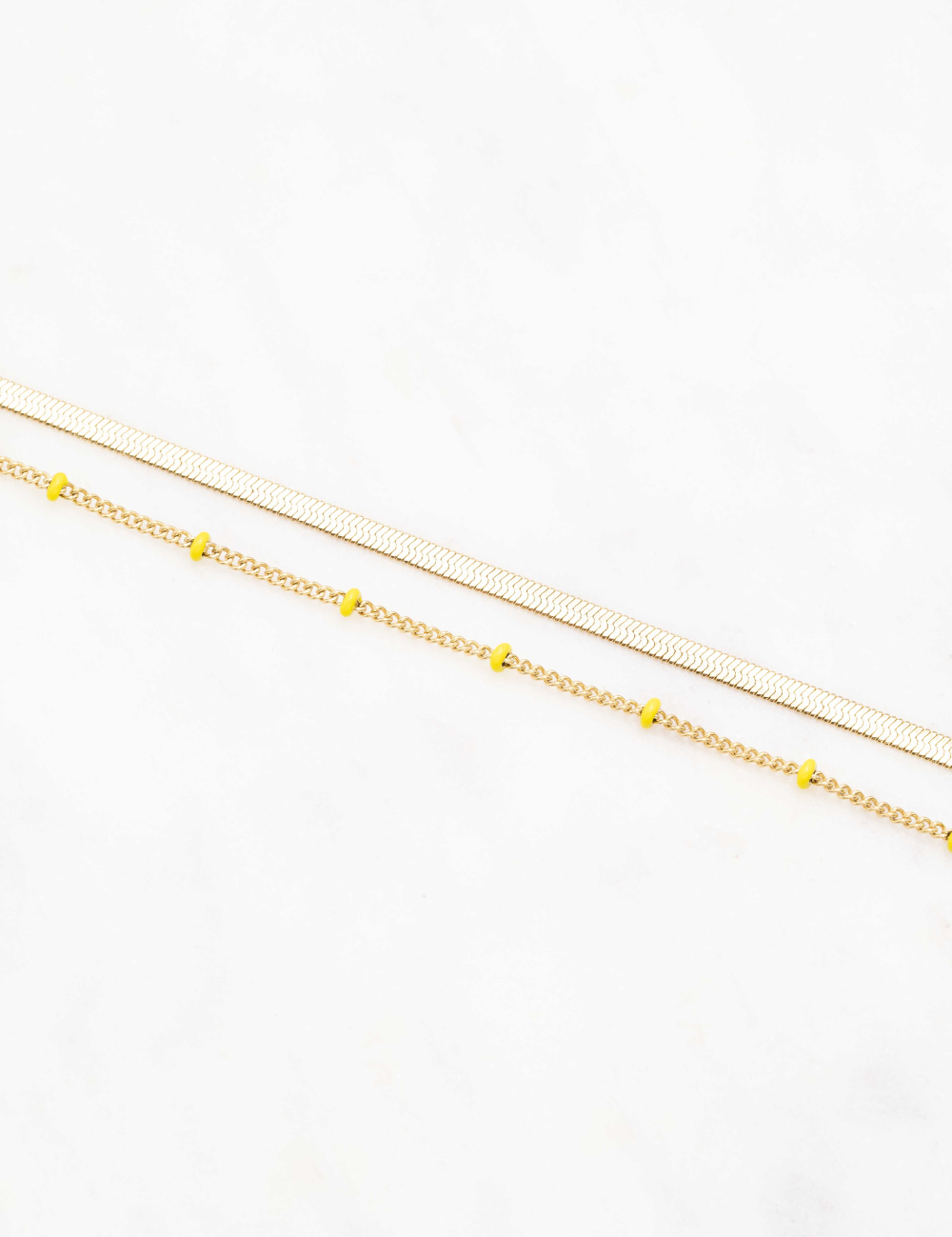 Bracelet type chevillère réglable deux rangs composé d'un jeu de maille plate et de chaine avec des perles émaillées colorées .